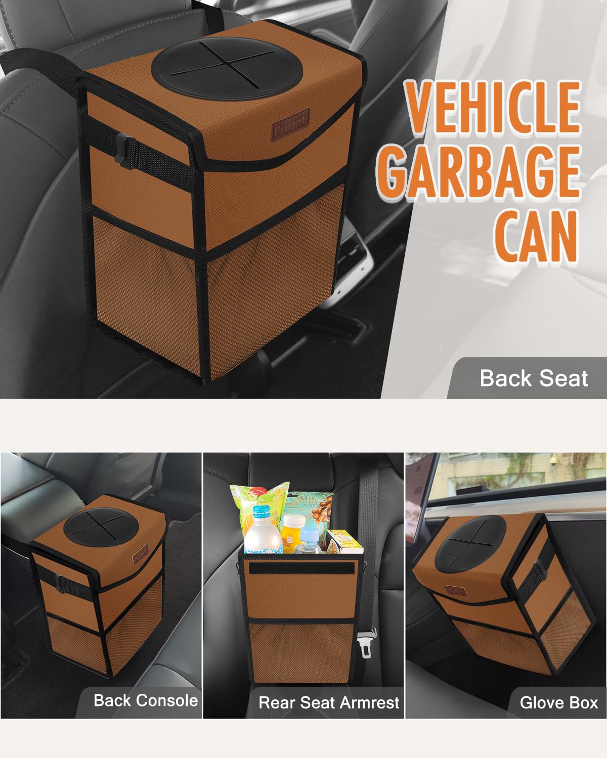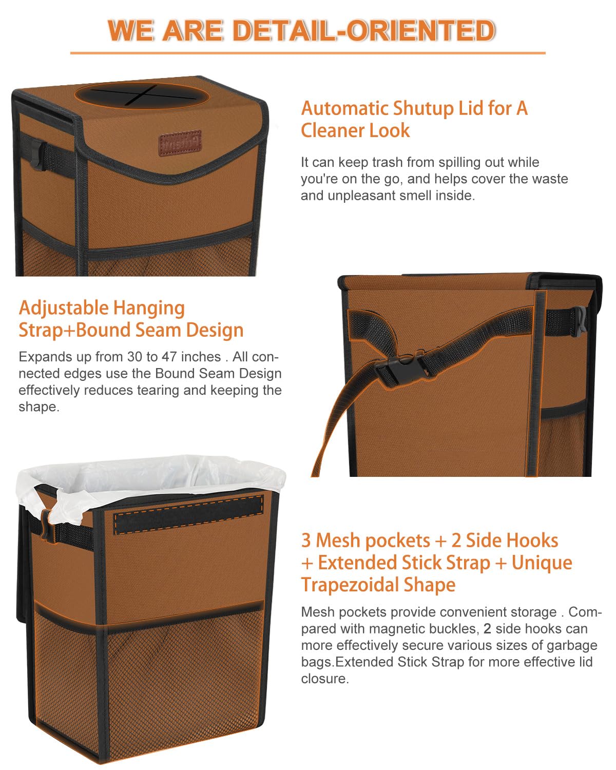 Practical PU Leather Cover & Unique Trapezoidal Shape:A garbage bin without a lid is like a garbage display box, which is embarrassing when there are other passengers. A trash can with a lid can make it look cleaner and tidier. It can keep trash from spilling out while you're on the go, and helps cover the waste and unpleasant smell inside. Designed with a quick-sealing PU leather lid, which can put objects in by just pushing it through the lid, and it will shut off automatically.