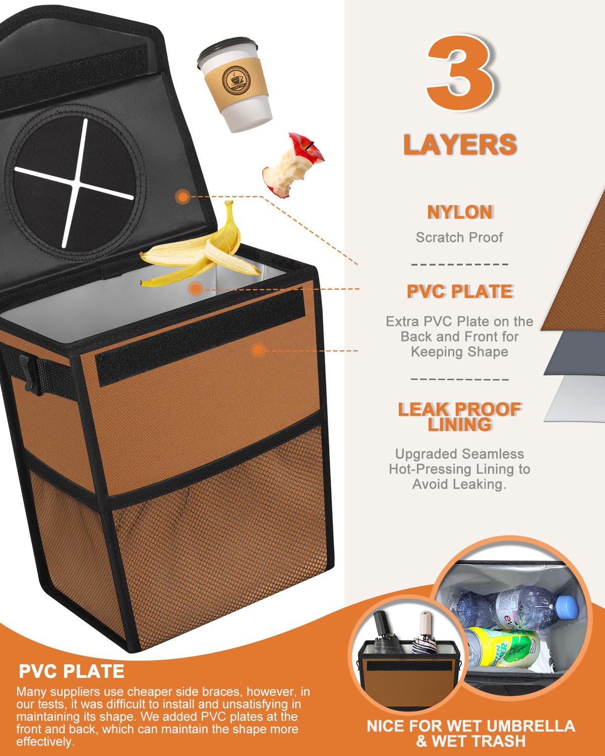 Easy to Clean and Leak Proof Lining:Upgraded seamless hot pressing technology PEVA material lining to avoid leaking. Dry trash like napkins and receipts is easy to collect, but wet trash, like ketchup packets or juice boxes, tends to complicate your sanitation endeavors. Leaks make things wet, sticky, and sometimes smelly, so finding a waterproof trash can is a must for anyone who lets liquids into their car. Tips, our trash bin is a good wet umbrella storage for rainy days.