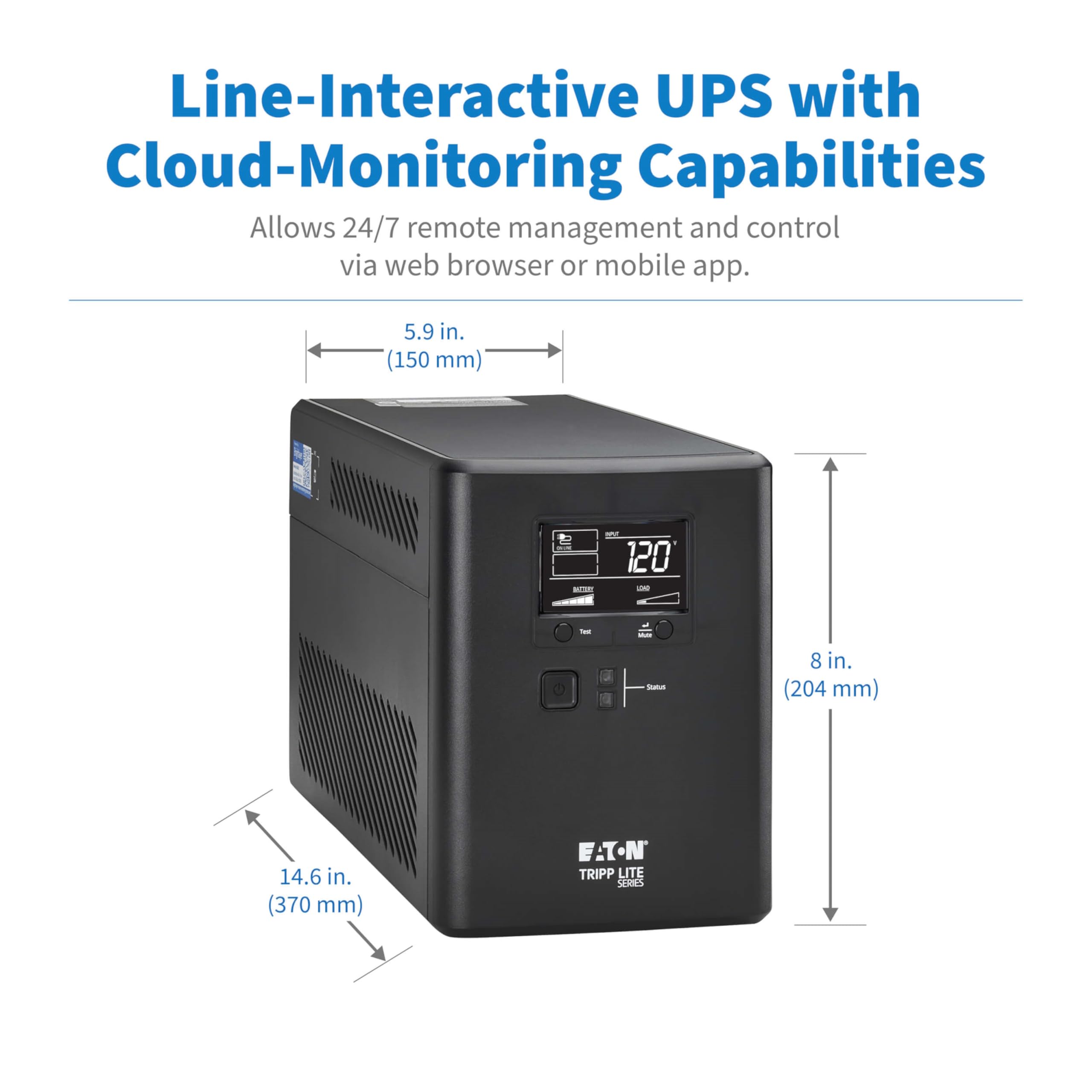 750VA Computer Uninterruptible Power Supply Unit Battery Backup for Network and Retail Point-of-Sale Applications The SMART750LCDTNC Line-Interactive cloud-connected UPS system regulates incoming voltage and provides reliable battery backup and AC power protection against blackouts, brownouts, overvoltages, surges, and Line noise. Its compact tower form factor is suitable for desktop, floor placement, under workstations and other locations where a taller "Rack/Tower" unit may not fit. It's recommended for Home/office, Point-of-sale workstations, digital signage equipment, and gaming equipment. Easy-to-Use Cloud-Enabled Remote Monitoring Powered by Brightlayer Eaton's cloud-based remote monitoring app offers convenient setup, control and management of a single UPS or a larger deployment. Scan the QR code on the UPS to download the app to your mobile device. Receive alerts, push configurations, silence alarms or control load banks using a mobile app or web browser. Being able to monitor and access multiple UPS systems from a remote location helps reduce the number of site visits, saving you time and money. The unit's NFC (Near-Field Communication) feature lets you configure network settings instantly from your mobile device. Allows Time to Back Up Critical Files During a Blackout During short blackouts, the SMART750LCDTNC switches to battery power to keep connected equipment running. This allows you enough time to save data and complete a safe shutdown in case of a longer outage. Once AC power is restored, the SMART750LCDTNC restarts automatically, regardless of battery charge level, saving you a costly site visit. NEMA 5-15R Outlets and Controllable Load Banks Protect Connected Components Five 5-15R outlets provide battery backup and surge protection for your computer, monitor, security camera and other crucial equipment. The other five 5-15R outlets provide surge suppression only for desk lamps, speakers and other equipment regarded as non-essential during a blackout. Eaton's remote monitoring application enables individual control of two switchable load banks, allowing them to be powered on, off, or cycled remotely. This remote functionality facilitates the rebooting of equipment that is not responding, thereby eliminating the need for expensive and time-consuming on-site visit. Automatic Voltage Regulation (AVR) Corrects Low- and High-Voltage Conditions AVR protects your equipment from incremental hardware damage, data loss and performance problems caused by brownouts and overvoltages. The SMART750LCDTNC can correct brownouts as low as 90V and overvoltages as high as 145V back to nominal 120V power continuously, all while keeping the battery fully charged and ready to take over in case of power failure. Easy Preventative Maintenance and Initial Troubleshooting The SMART750LCDTNC's self-test capability and user-rep'laceable internal battery can extend the life of the UPS and minimize disruption to operations. A resettable circuit breaker on the rear of the UPS helps prevent dangerous system overloads. Intuitive LCD, Home-Friendly Alarm and Diagnostic LEDs Keep You Informed 24/7 The easy-to-read LCD and two diagnostic LEDs provide vital status information, including voltage, battery level, load level and power usage. The audible alarm indicates low-battery and fault conditions. It can be disabled via the LCD or the remote monitoring app, which will still respond to silenced alarms via the app. Communications Ports The UPS features an RJ45 port for Ethernet connectivity, enabling the use of a cloud-based remote monitoring application. Additionally, a USB-C port is provided for direct connection to the UPS's Command Line Interface (CLI), facilitating the configuration and identification of local network parameters. Reliable Product, Fully Backed and Supported The SMART750LCDTNC features a manufacturer's 3-year limited warranty and $250,000 Ultimate Lifetime Insurance for connected equipment. This product is also fully supported by Eaton's expert technical support team over phone, web & email. Note: Warranty is only available in U.S., Canada and Puerto Rico.