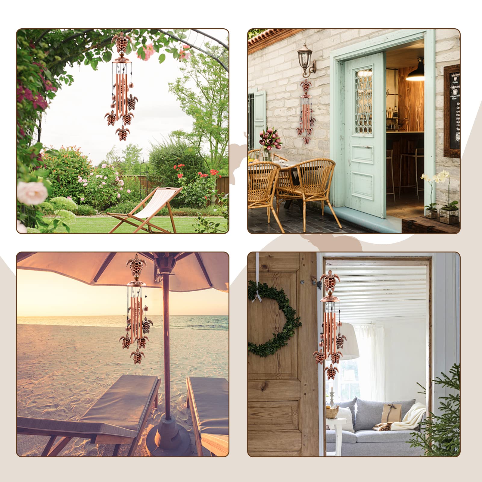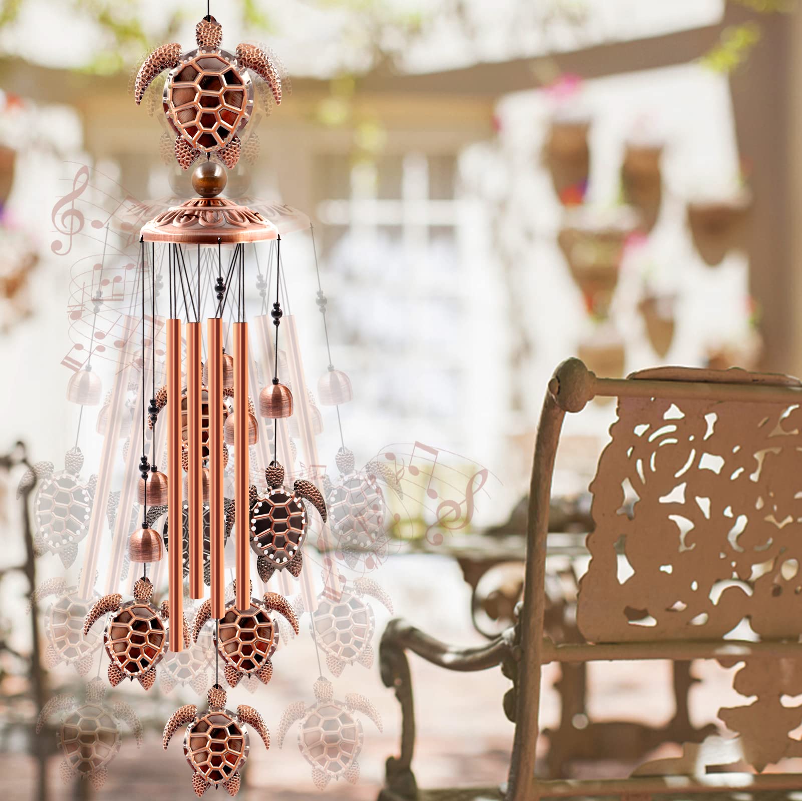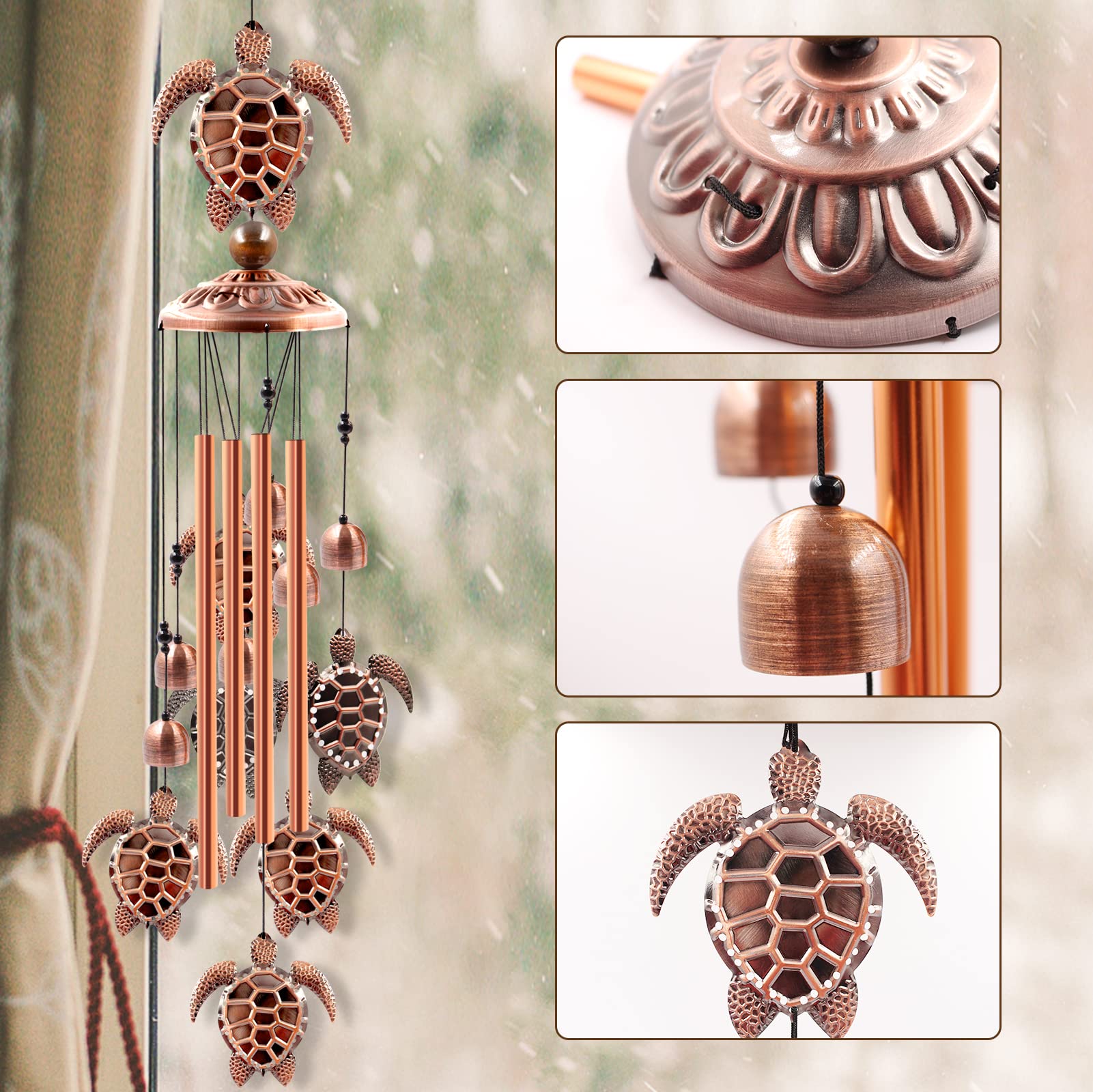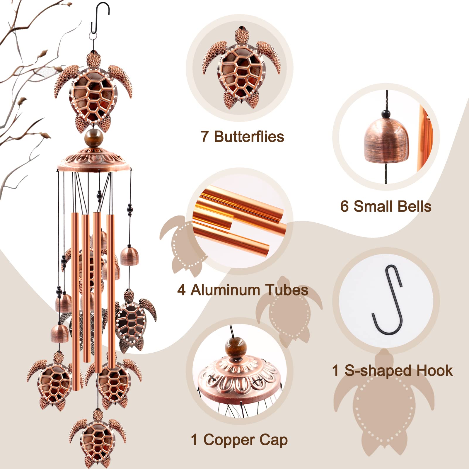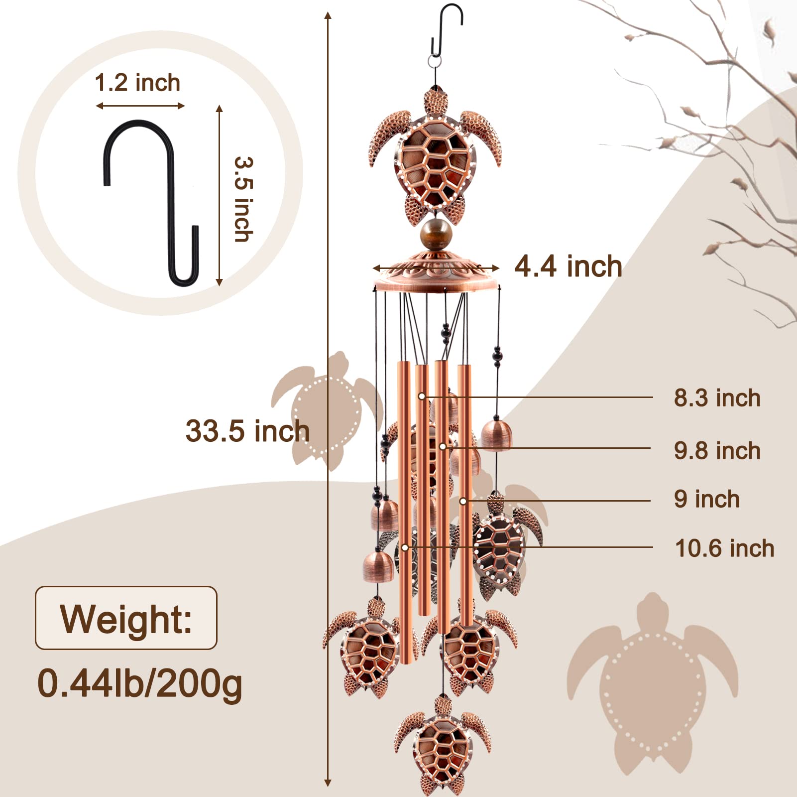 UNIQUE DESIGN: This sea turtle wind chimes for outdoors is purely handmade. It contains a large sea turtle at the top, 6 small sea turtles, 6 small bells, 4 rose gold durable and corrosion resistant aluminum tubes and 1 brass cap. A black nylon cord connects them together to form an elegant wind chime. Silver "S" shaped hooks allow you to hang the wind chimes on your patio or anywhere you wish.