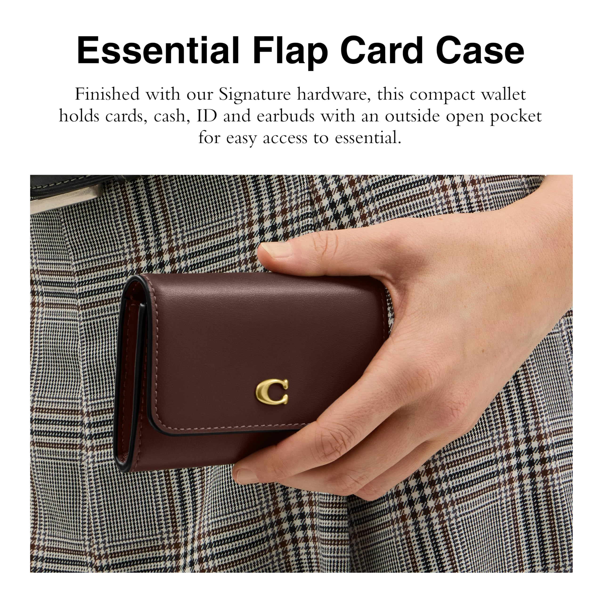 Description Our Essential Flap Card Case wallet is crafted of refined calf leather and features 4 credit card slots, an outside open pocket a snap closure. Finished with our Signature hardware, this compact womens wallet holds cards, cash, ID and earbuds with an outside open pocket for easy access to essentials.
