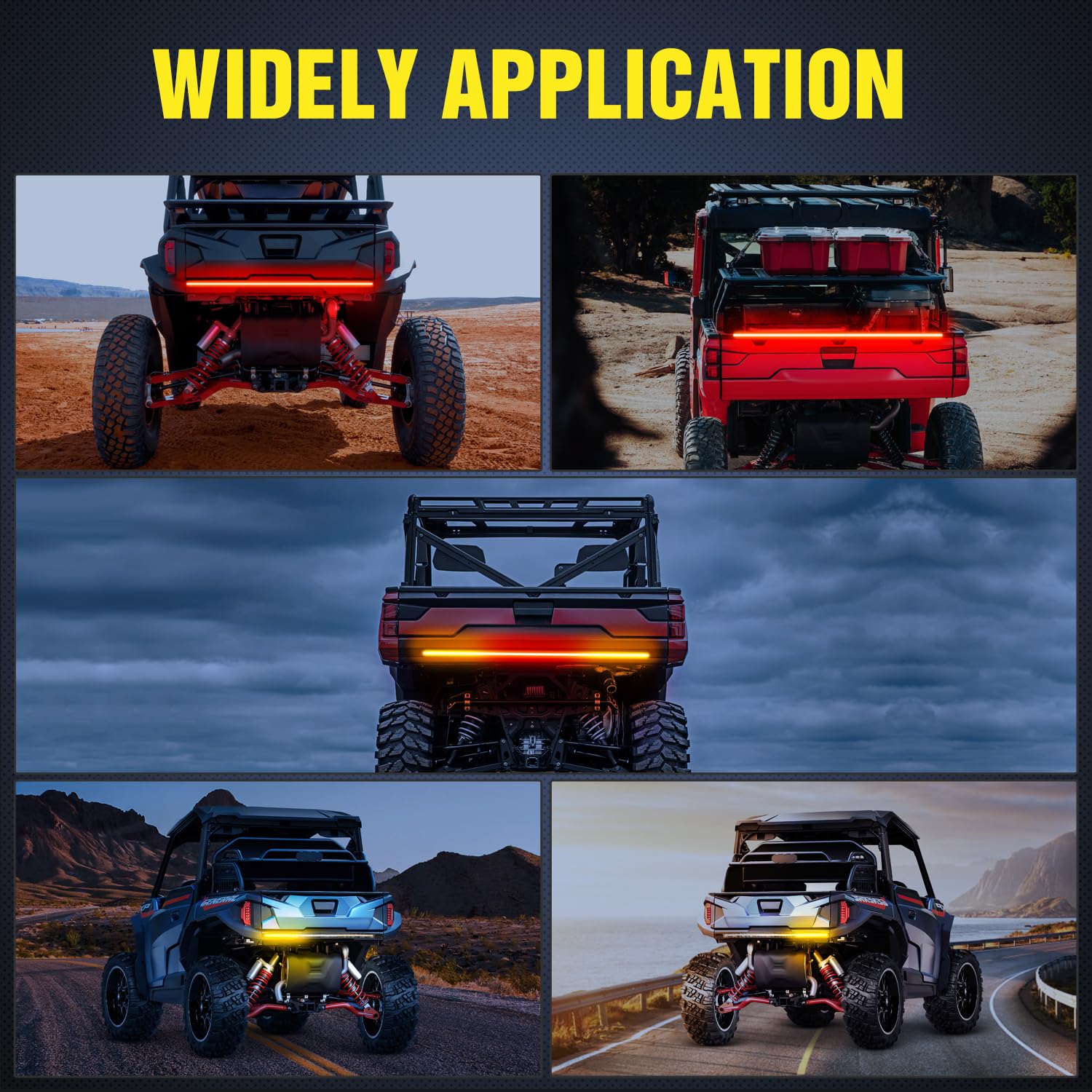 Upgraded Quality LED: The UTV tailgate light strip includes 84pcs ultra bright 2835 monochrome LEDs and 120pcs high-quality dual color LEDs. Output two brightness levels of red light and a bright amber light