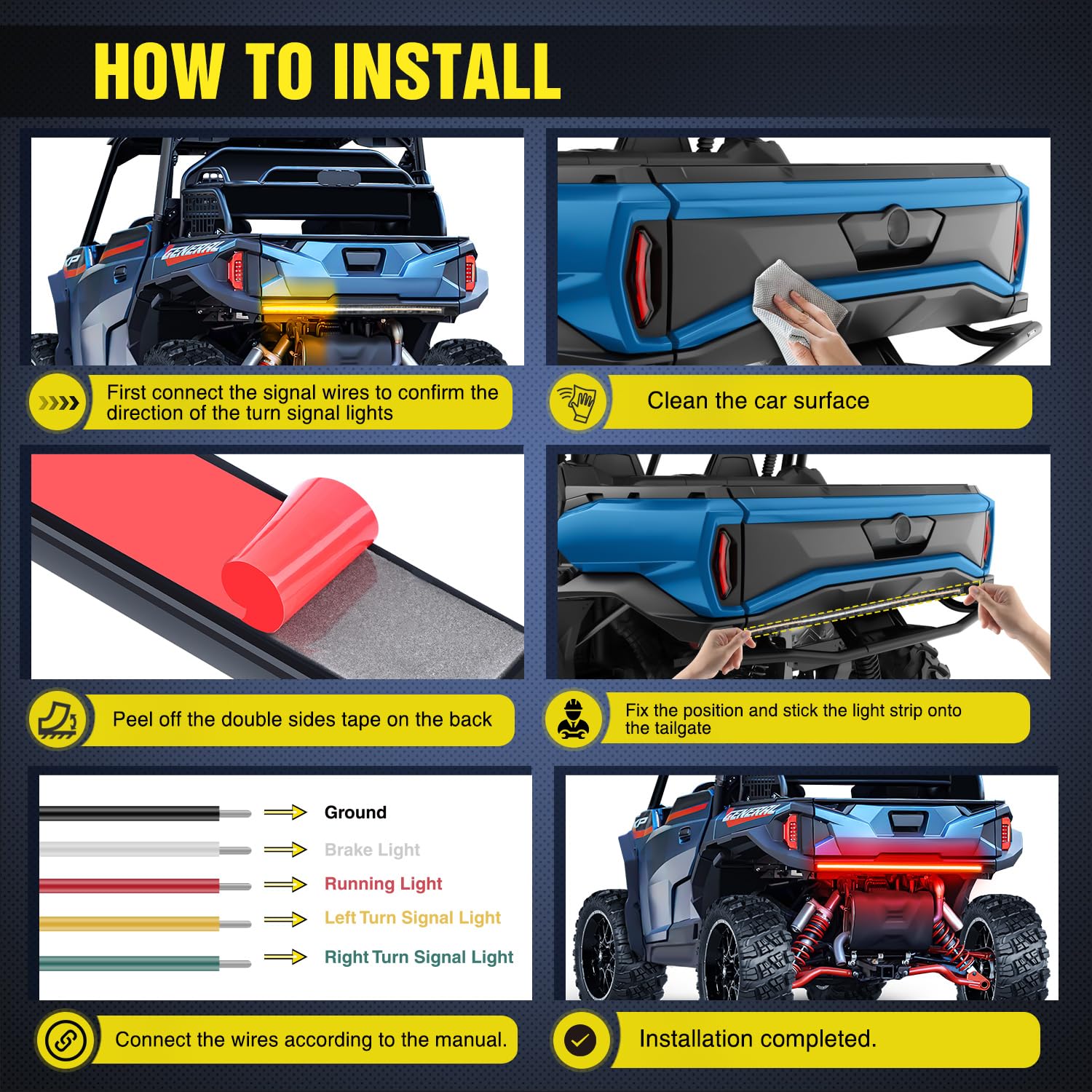 Steps To Install: First, we recommend connect the signal wires to confirm the direction of the turn signal lights before pasting the light strip. Secondly, clean the surface without leaving any dust and water. Then peel off the adhesive tape and stick the light strip. Finally, connect each functional wire to the car in sequence, and the installation is complete. We are also equipped with additional installation accessories to reinforce the light strip