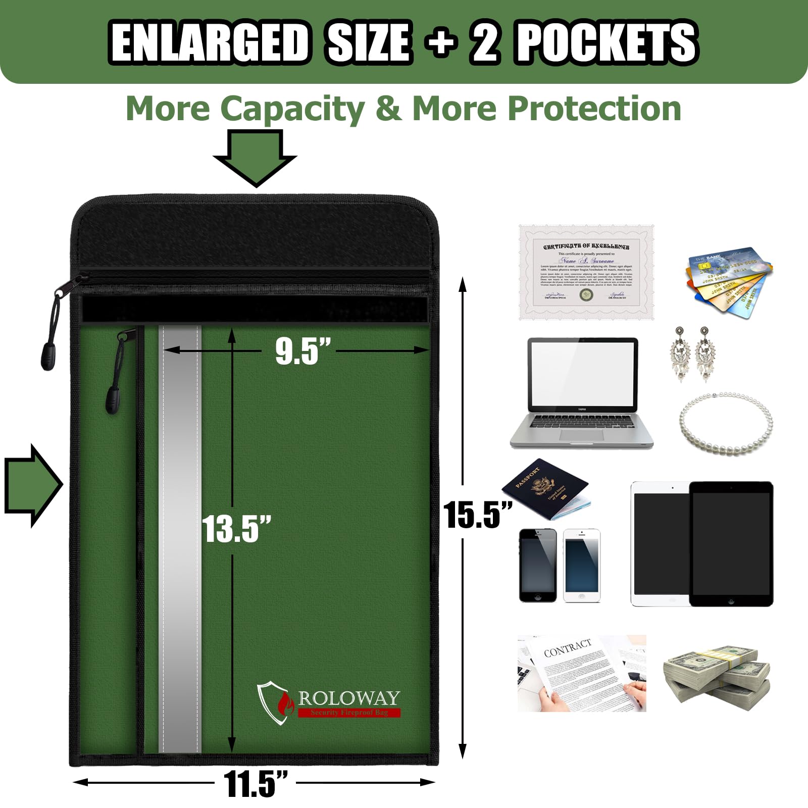 [ENHANCED SIZE & 2-POCKET DESIGN]: This new version of our fireproof bag for documents comes with 2 larger pockets for convenience. The Big Pocket (15.5 x 11.5 inches) is a fireproof document pouch that provides SPACIOUS room for LEGAL SIZE DOCUMENTS, laptops, and other important document storage. Meanwhile, the Front Pocket (13.5 x 9.5 inches) is great for A4 FILES, cash, passports, jewelry, and more. Secure your vital items with our fireproof document bag / fire proof bag for documents.