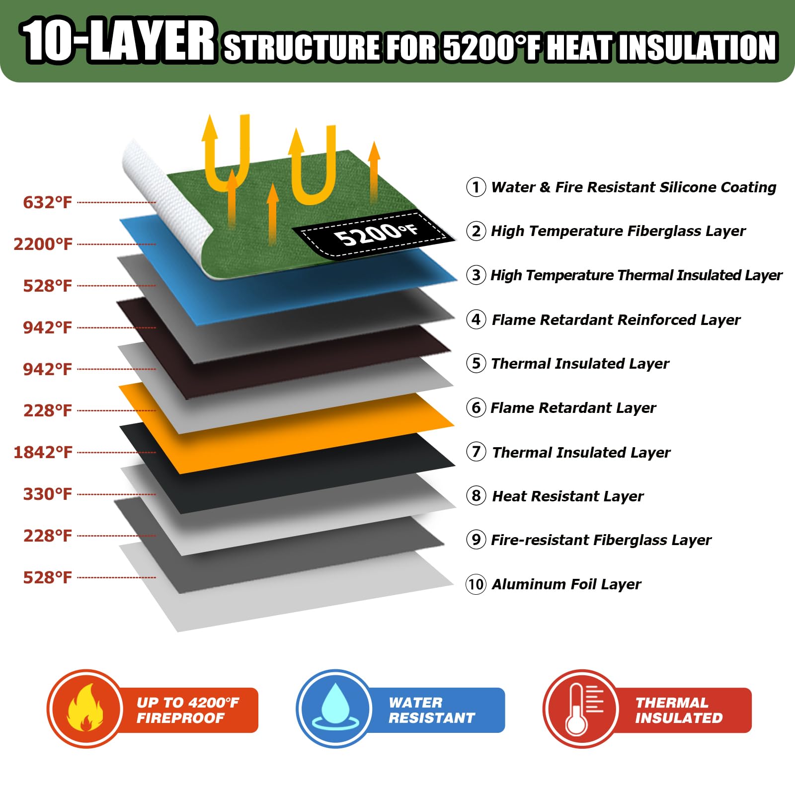 [10-LAYER STRUCTURE FOR 5200°F HEAT INSULATION]: With upgraded structures including Silicone Coating Layer, Fireproof Fiberglass (x3), Flame Retardant Layer (x2), Thermal Insulation Layer (x3), and an ALUMINUM FOIL LAYER, our fire proof money bag for cash progressively diminishes and obstructs heat transfer. Capable of withstanding temperatures up to 5200°F for a specified period, it provides you with vital time to rescue your valuables from fire.