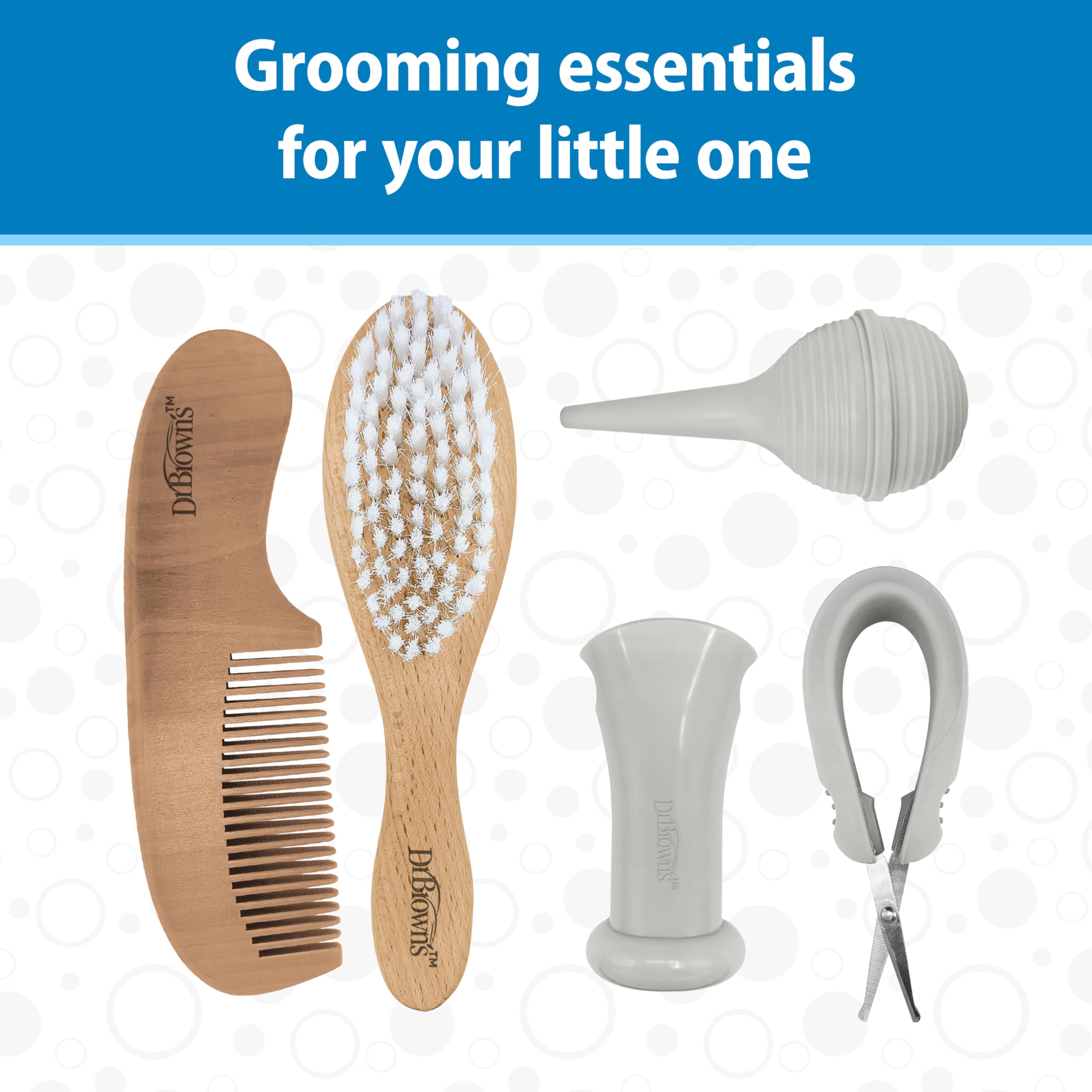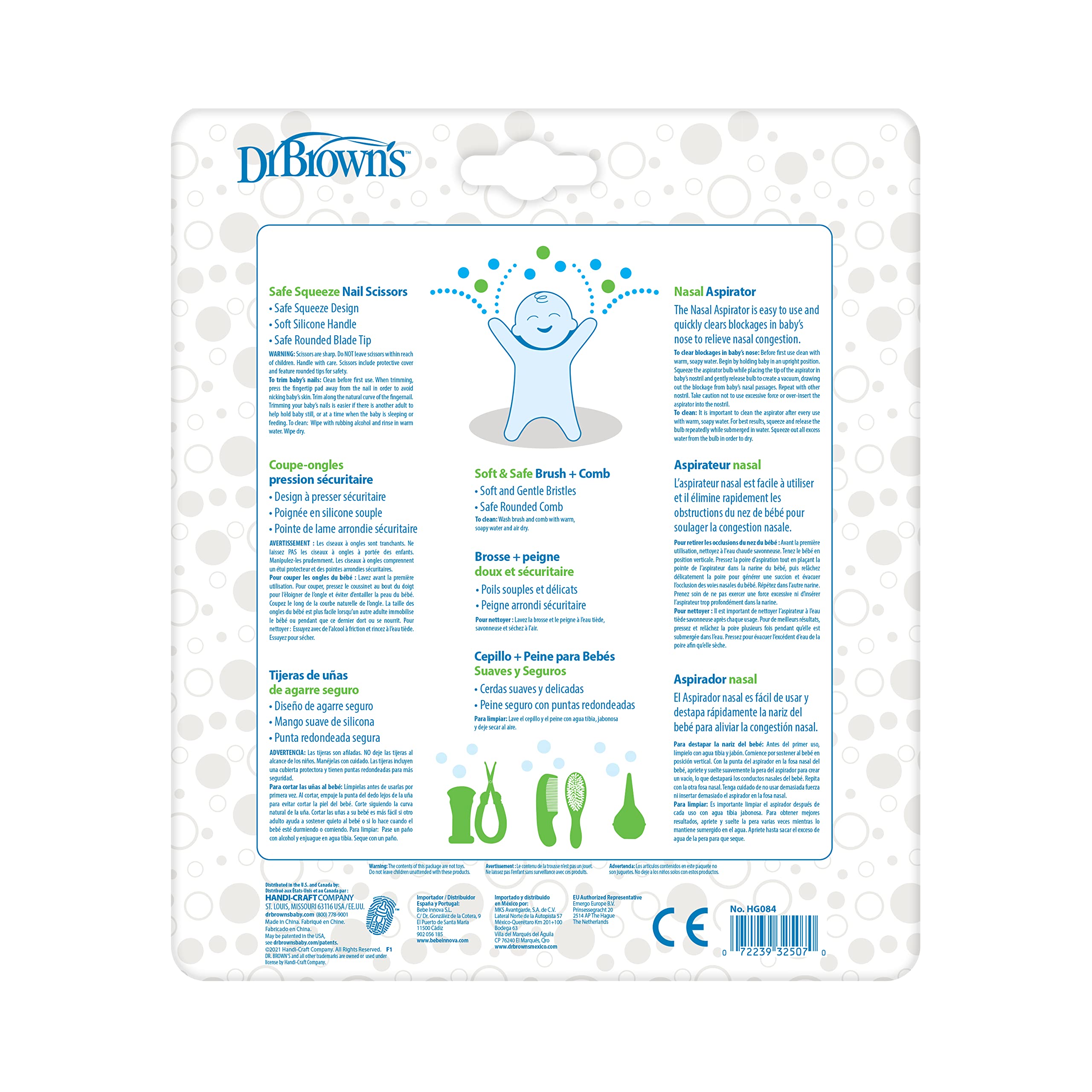 Dr. Brown's Baby Care Essentials Kit has everything you need to keep baby groomed and feeling good This 4-item set includes Dr. Brown's Safe Squeeze Nail Scissors with Case, Nasal Aspirator, and Soft and Safe Baby Brush + Comb. The baby nail scissors feature stainless-steel blades with safe rounded tips and a soft-grip handle that's comfortable and easy to control, taking the worry out of trimming tiny nails. The nasal aspirator helps clear blockages in baby's nose to relieve nasal congestion. The brush and comb safely and gently care for little one's hair and scalp, and can help with managing cradle cap. These high-quality items are lightweight and perfectly sized to use at home or conveniently take on the go.