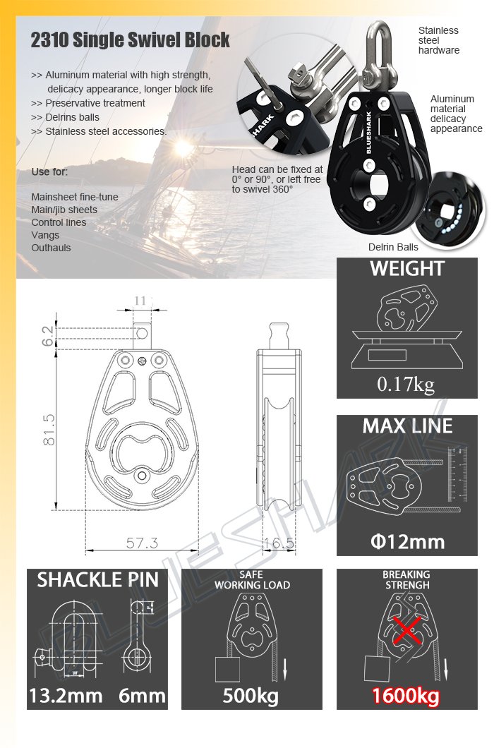 Specifications: Model Number: 2310 Material: 6061T6 Aluminum Alloy, 316 Stainless Steel Ball Bearings: Delrin Maximum Line Capacity: 7/16” (12 mm) Sheave: 57 mm sheave Safe Working Load (SWL): 1100 lbs (500kg) Breaking Load: 3500 lbs (1600kg) Swivel Head: 0°, 90°, or 360°