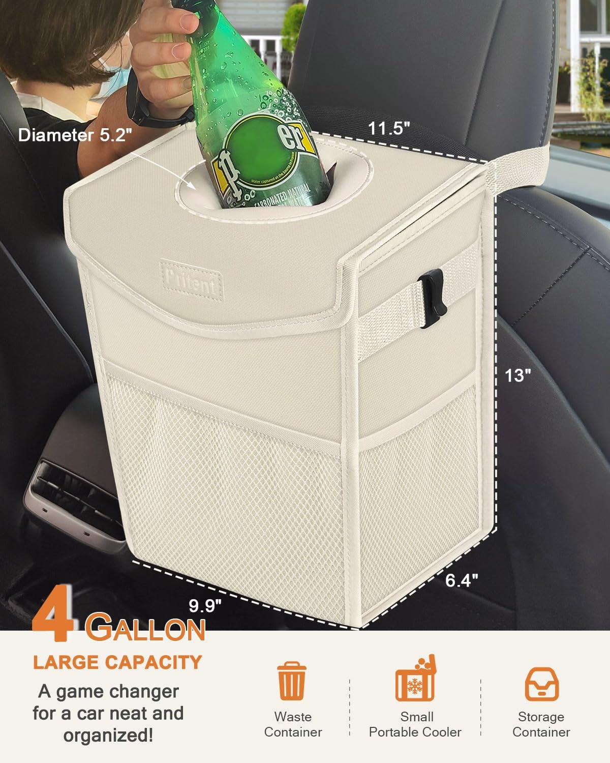 3-in-1 Multipurpose Container With 4-gallon Capacity:A game changer for a car neat and organized! It is not only a rubbish holder and car storage organizer, but a nice portable cooler bag for your car. Mesh pockets provide convenient storage places for things like tissues, extra trash bags, and cleaning wipes. The mesh pockets can hold anything you want to keep within arm’s reach in your car. Why not upgrade your driving experience today and invest in a Pritent Trash can for your car?