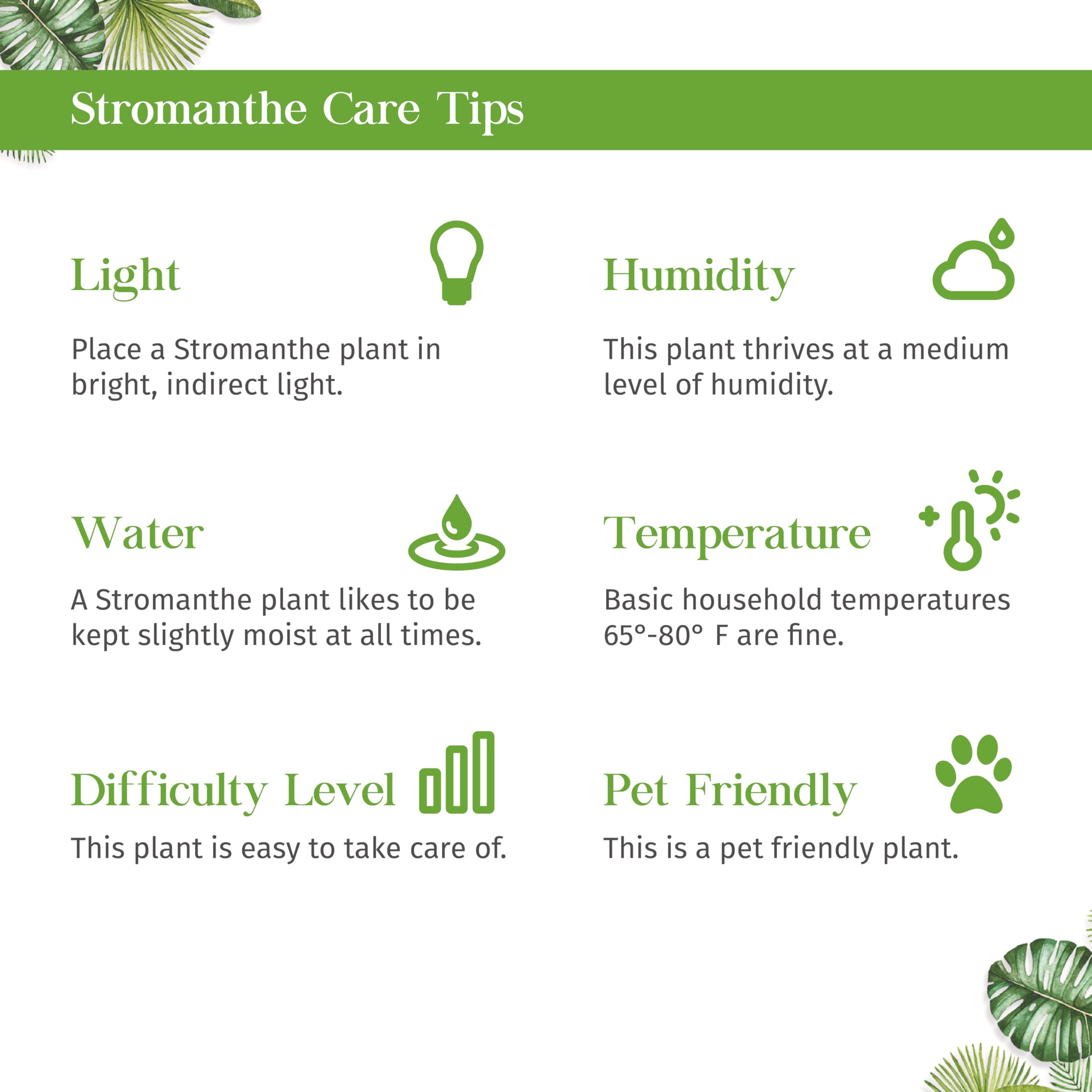 MAGENTA TRIOSTAR CARE! Place a Stromanthe plant in bright, indirect light but no direct sun. A Stromanthe plant likes to be kept slightly moist at all times. Avoid placing a Stromanthe in a cold or hot draft, otherwise, basic household temperatures (65°-80° F) are fine.