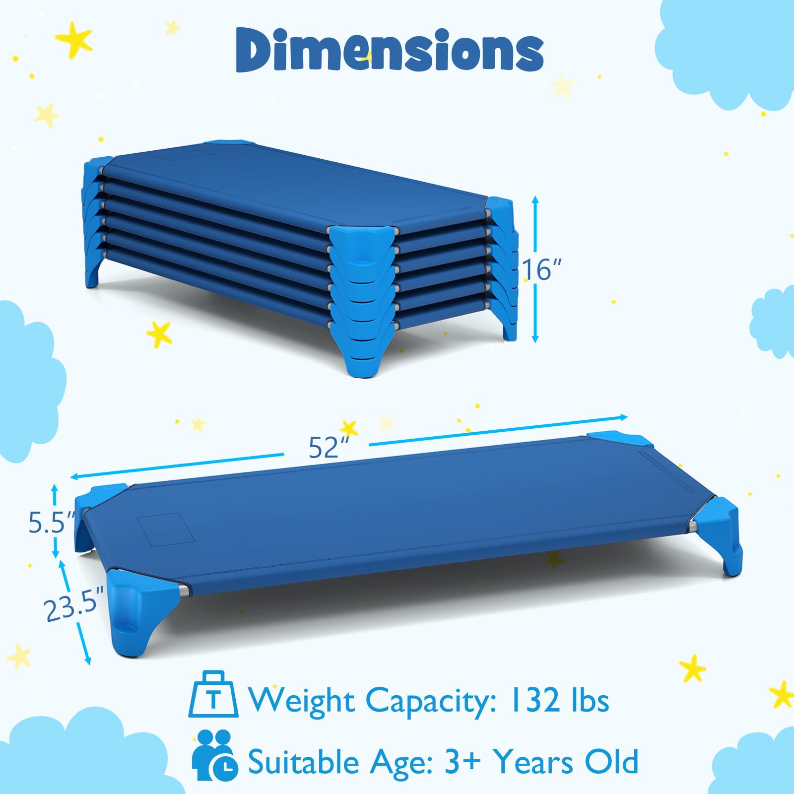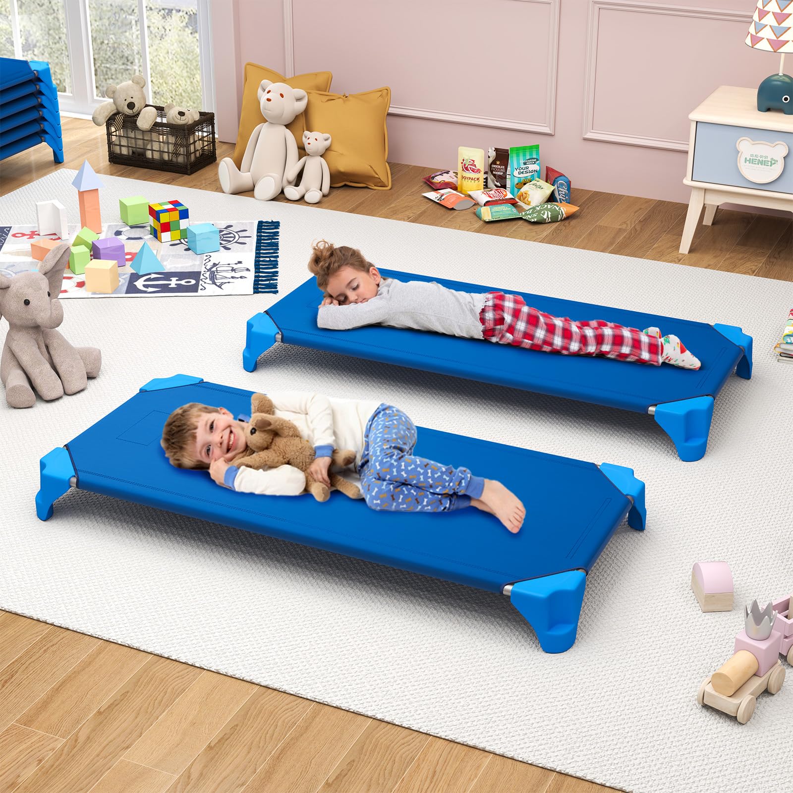 Easy to Stack & Store: Cleverly designed for convenience, the sleeping cot for toddlers is stackable, making it an ideal solution for any space-conscious nursery or daycare. Plus, the easy-to-lift corners enable hassle-free separation and rearrangement.