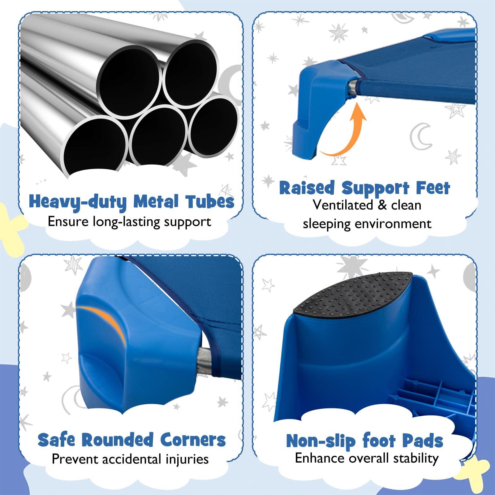 Robust Support: With heavy-duty metal tubes at its core, the daycare nap cot is the strong, silent type that can handle the weight of up to 132 lbs with ease. Moreover, the included non-slip foot pads bring added stability, keeping your little ones safe and snug during their rest time.