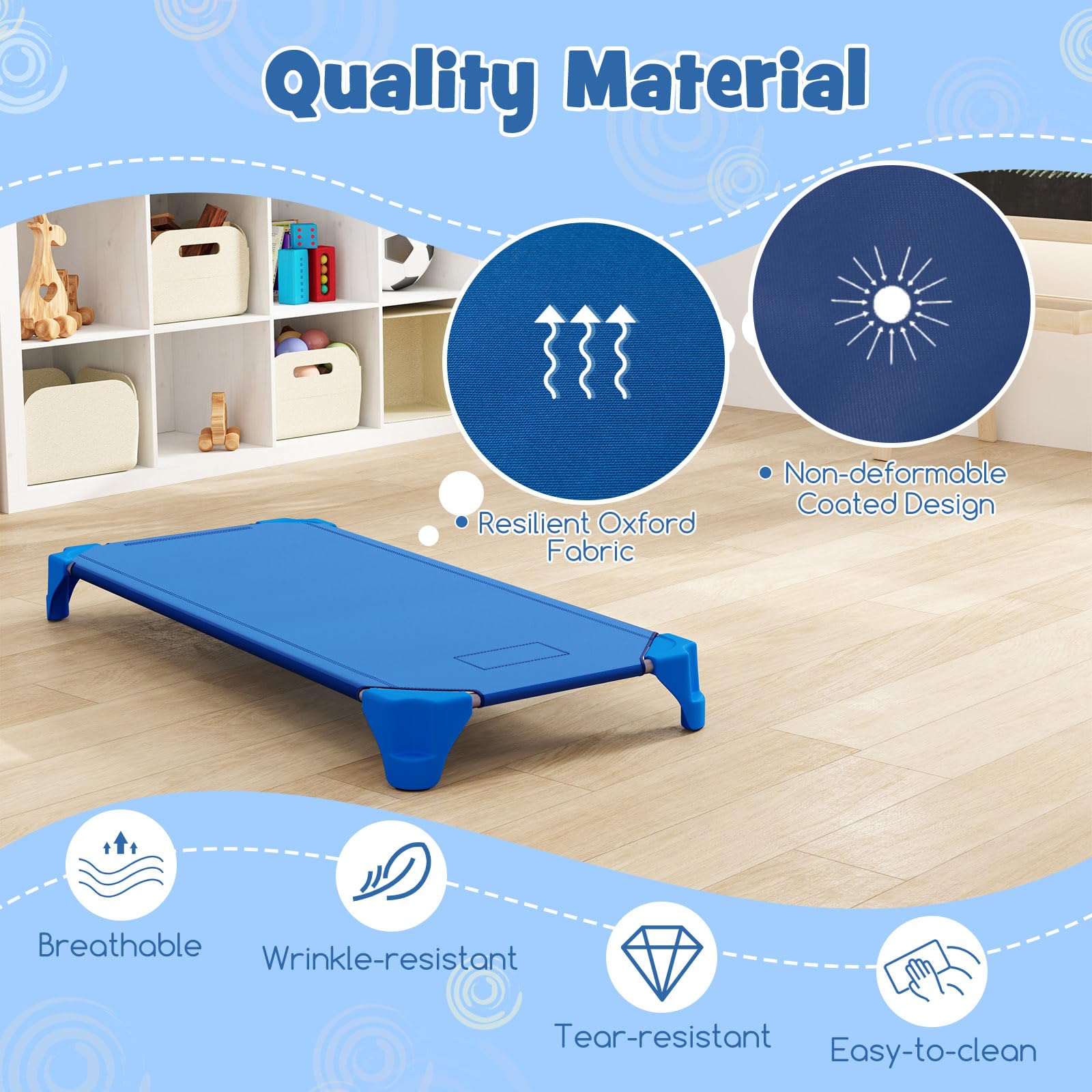 Coated Fabric, Unbeatable Quality: The HONEY JOY kids daycare cots are crafted with premium Oxford fabric for easy maintenance. The material is enhanced with a PVC coating, resisting tears and wear without losing its shape or comfort.