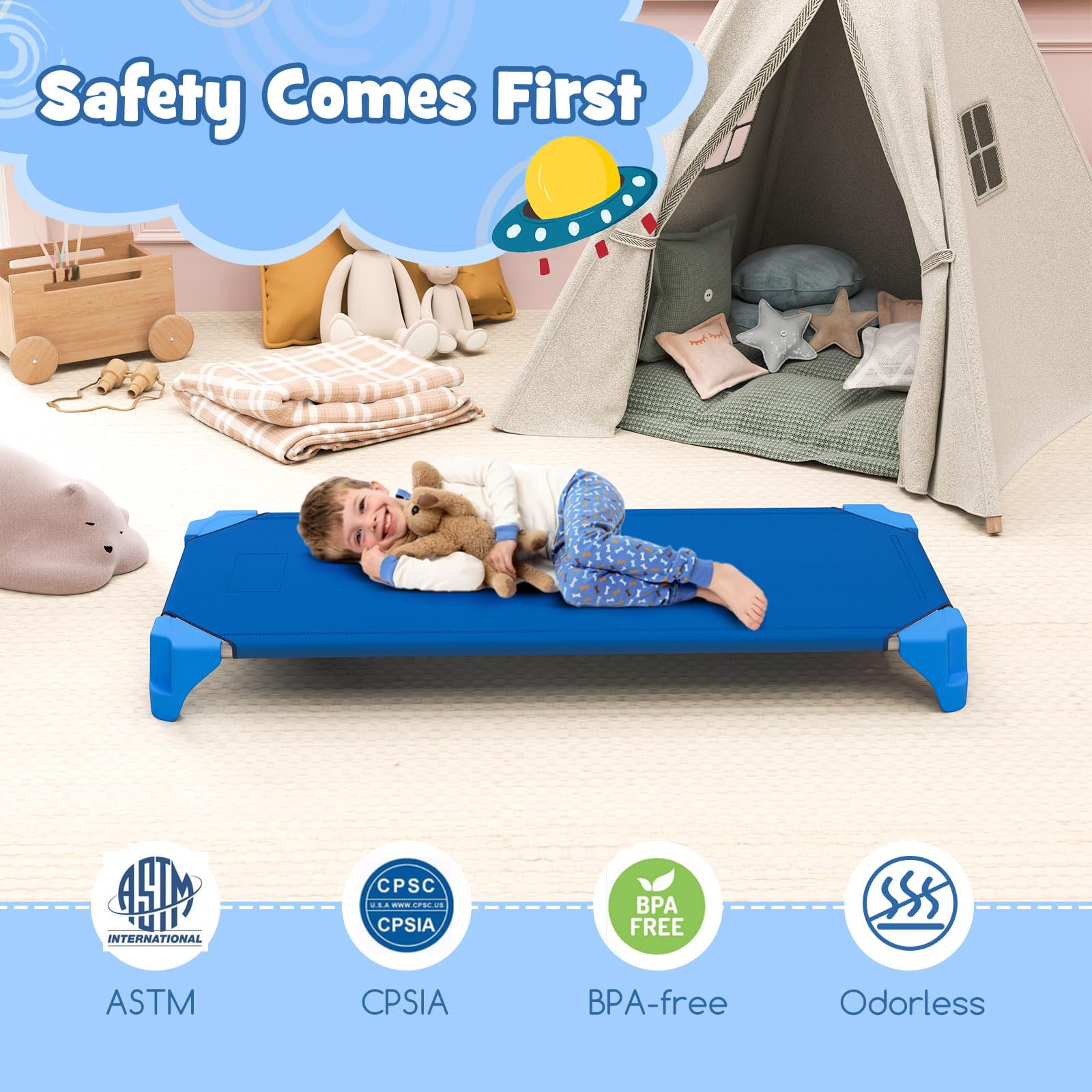 Peace of Mind with Every Nap: Elevate the cleanliness and safety of the sleeping space with the preschool cots’ raised support feet and smooth, rounded corners. The children naptime cots help to create a hygienic sanctuary, and complies with ASTM and CPSIA standards, giving you the confidence that your children are in the best possible hands.