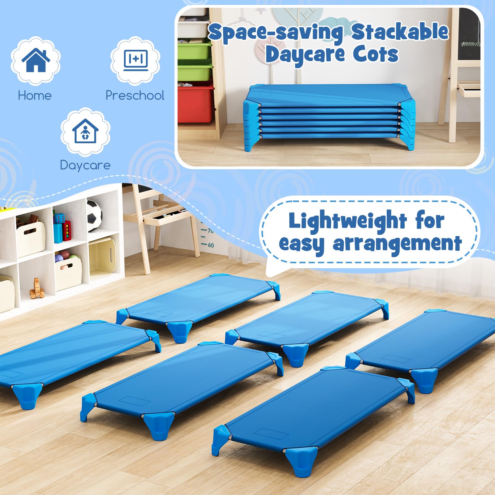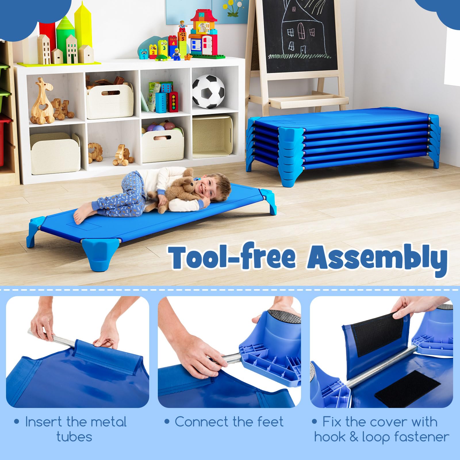 Effortless Setup: The stackable daycare cots for kids are designed for quick and easy assembly, with no need for additional tools. Just insert the metal tubes, connect the feet, and fix the cover with hook and loop fastener - it’s that simple!
