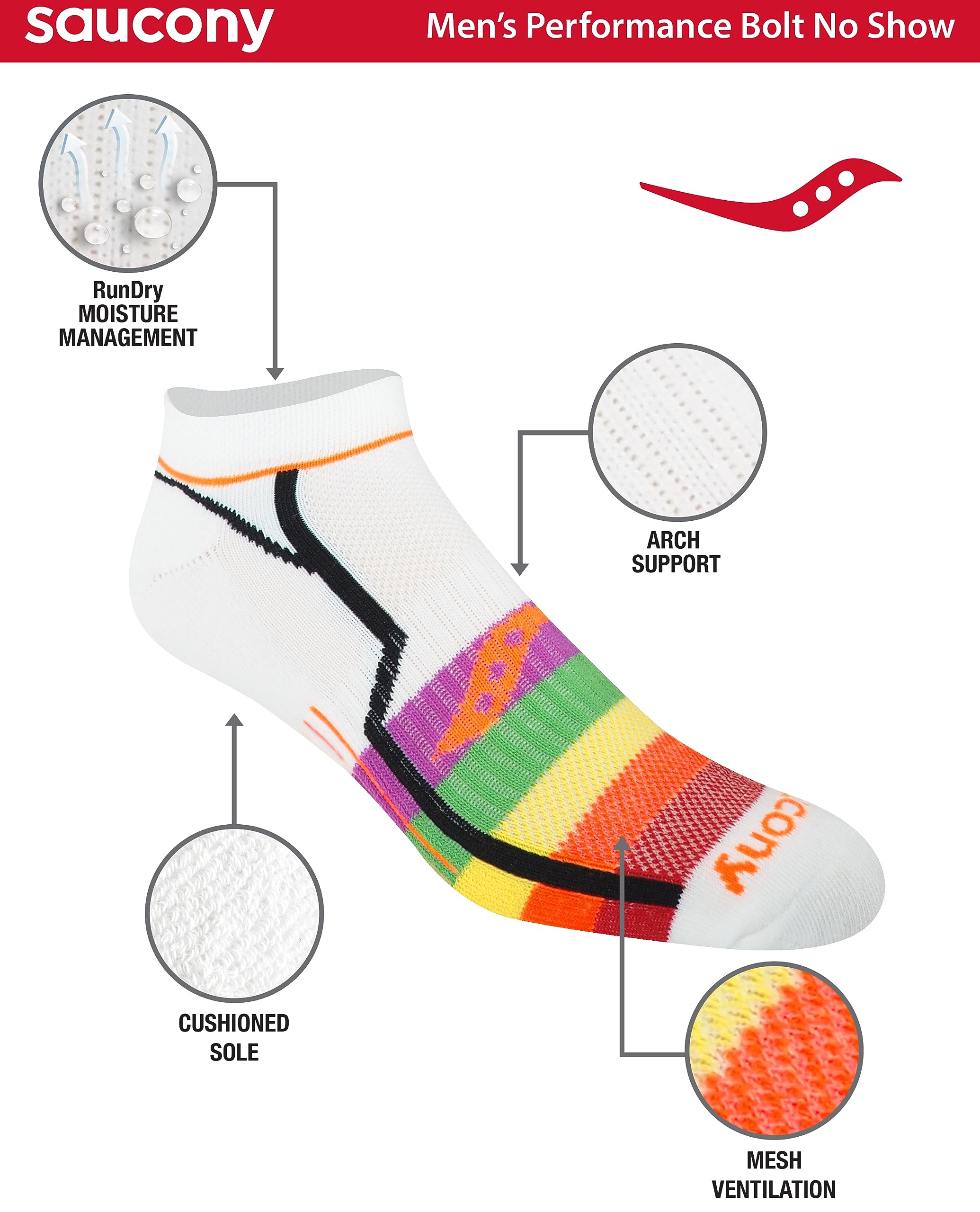 Description Saucony men's performance no show socks is a perfect combination of comfort and support. Great for the toughest training sessions. Its arch support, air mesh venting, and moisture management features will ensure lasting comfort. Run for Good - Saucony was founded way back in 1898. Ever since, we have been loyal to the sport, building goodness into every product and inviting millions around the world to run with us. At Saucony, we exist for runners, Runners inspire us, bringing us new idea, force us to be better, they drive our design and engineering. They keep us competitive. They keep us hungry. They keep us honest. This focus and passion fuels us as we strive to create the best running shoes and apparel on the planet. We leave work each day knowing we’ve done everything to make runners live just a little better.