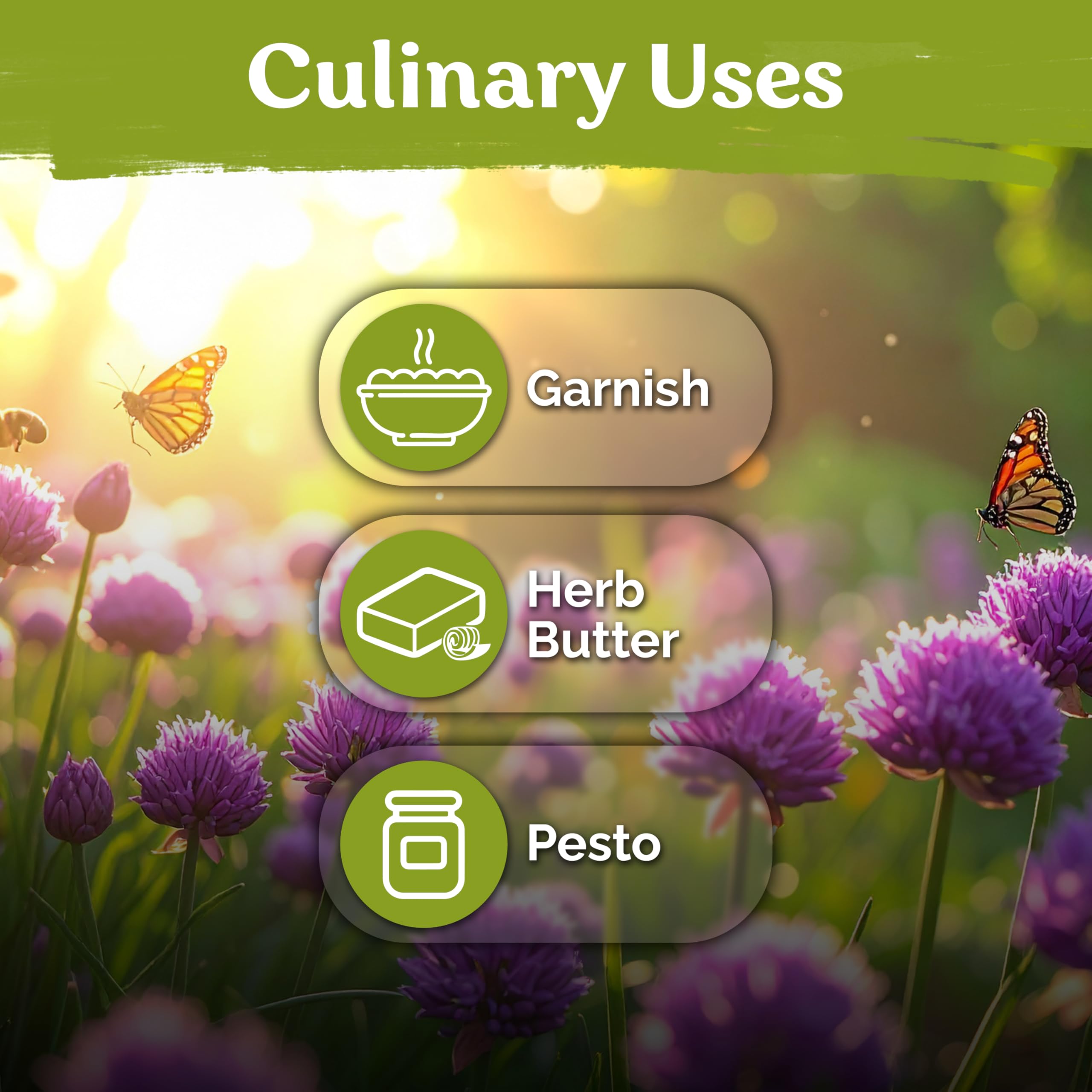 Edible Flowers & Flavor: Flowering chives bloom late spring to early summer with fuchsia heads. Harvest before they bow; enjoy onion spice as culinary herbs for garnish, butter, pesto, or even dressing.