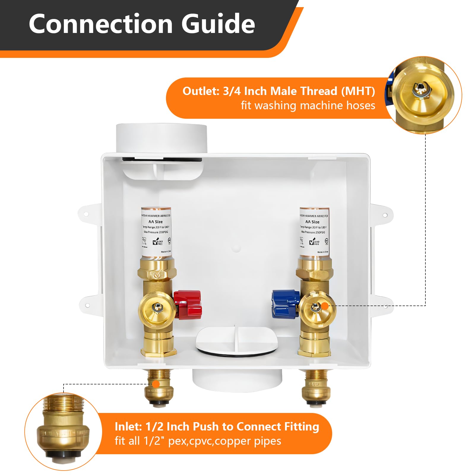 PACKAGE INCLUDE: 1.washing machine outlet box,Equipped with a copper arrestor. 2.pre-installed support brackets 3.protective box cover.