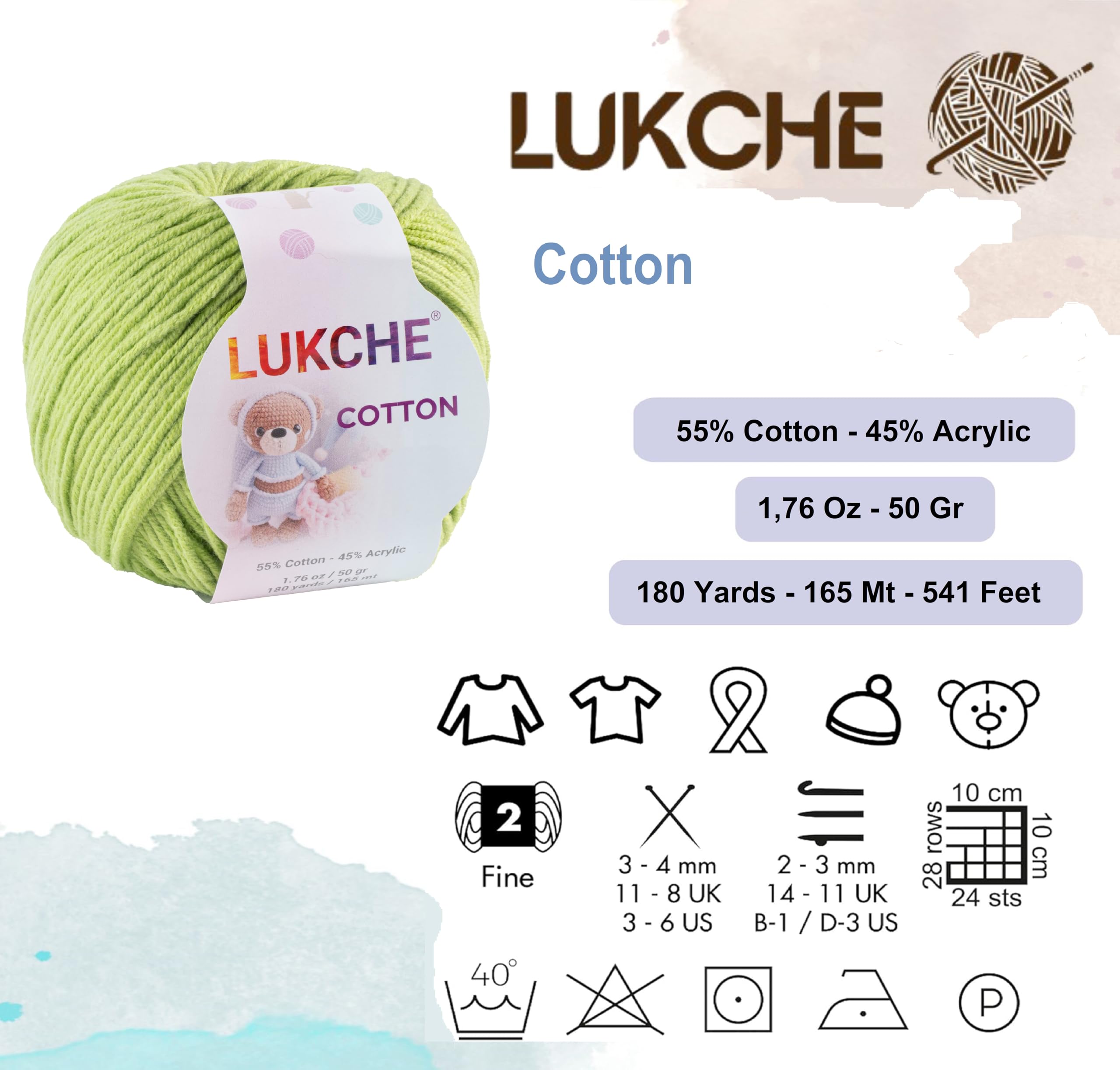 Lukche Cotton Yarn ✔Composition: 55% Cotton – 45% Acrylic ✔Weight: 50 gr (1.76 Oz) ✔Length: 165 m (180 yds) ✔Recommended needles: 2-3 mm (US B-1-D-3) ✔Recommended crochet hooks: 3-4 mm (US 3-6) ✔Yarn Weight: Sport – Fine (2) ✔Lukche Cotton is one of the most preferred yarns by all artisans with its wide color range that offers pastel and vibrant colors together. ✔Thanks to its texture and cotton content, it is suitable for all baby clothing and amigurumi. ✔Denim has a smooth structure that you can knit perfect summer products. ✔It is also preferred for punch embroidery. ✔There may be some differences in color tones due to your monitor settings. ✔ Lukche Cotton yarns are perfect for amigurumi dolls and animals, small bags for young girls, gradient cardigans, baby blankets, shawls, rattle baby toys, crochet motifs. ✔ Yarn colors are very diverse and beautiful, Yarn has a soft texture. If you have any questions, please feel free to ask us via message. Attention: ⚠ Machine wash (up to 86 F) ⚠ Do not tumble dry ⚠ Iron (Low Temperature) ⚠ Do not bleach