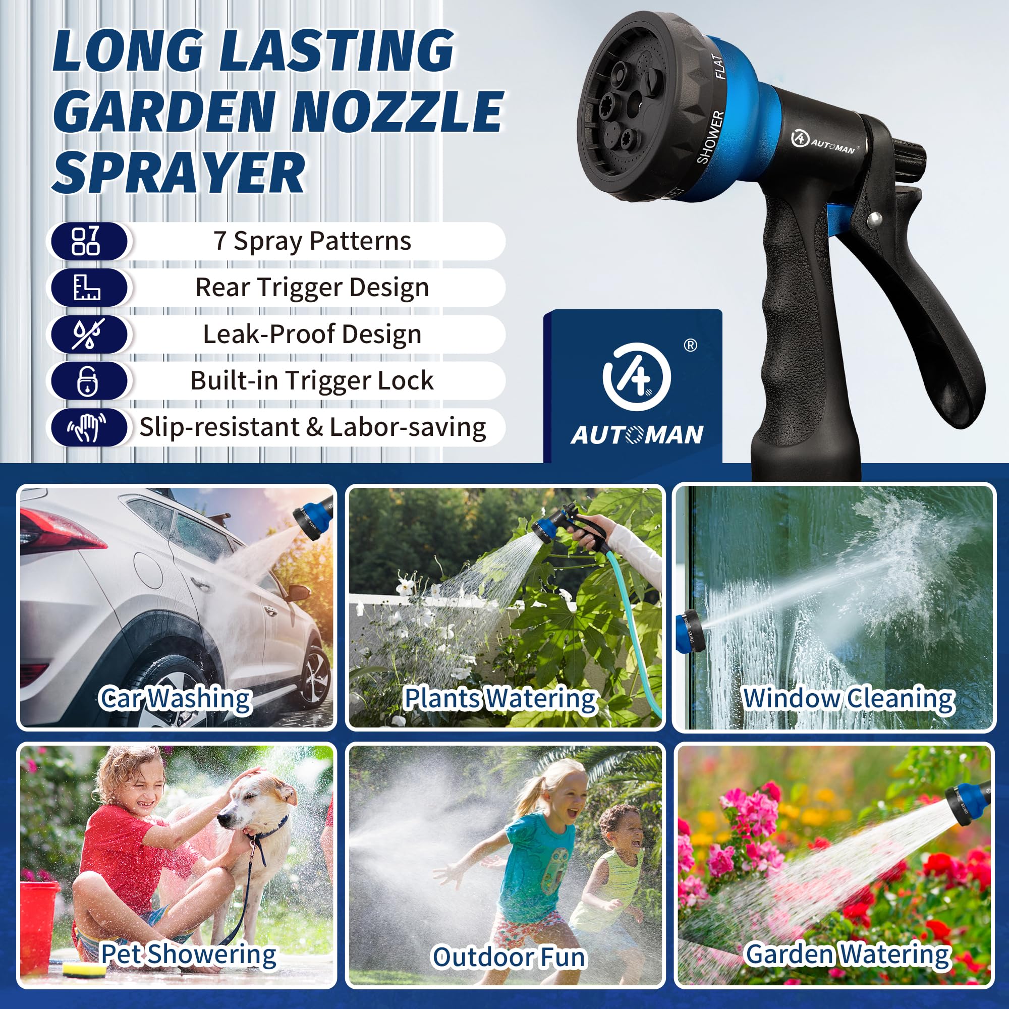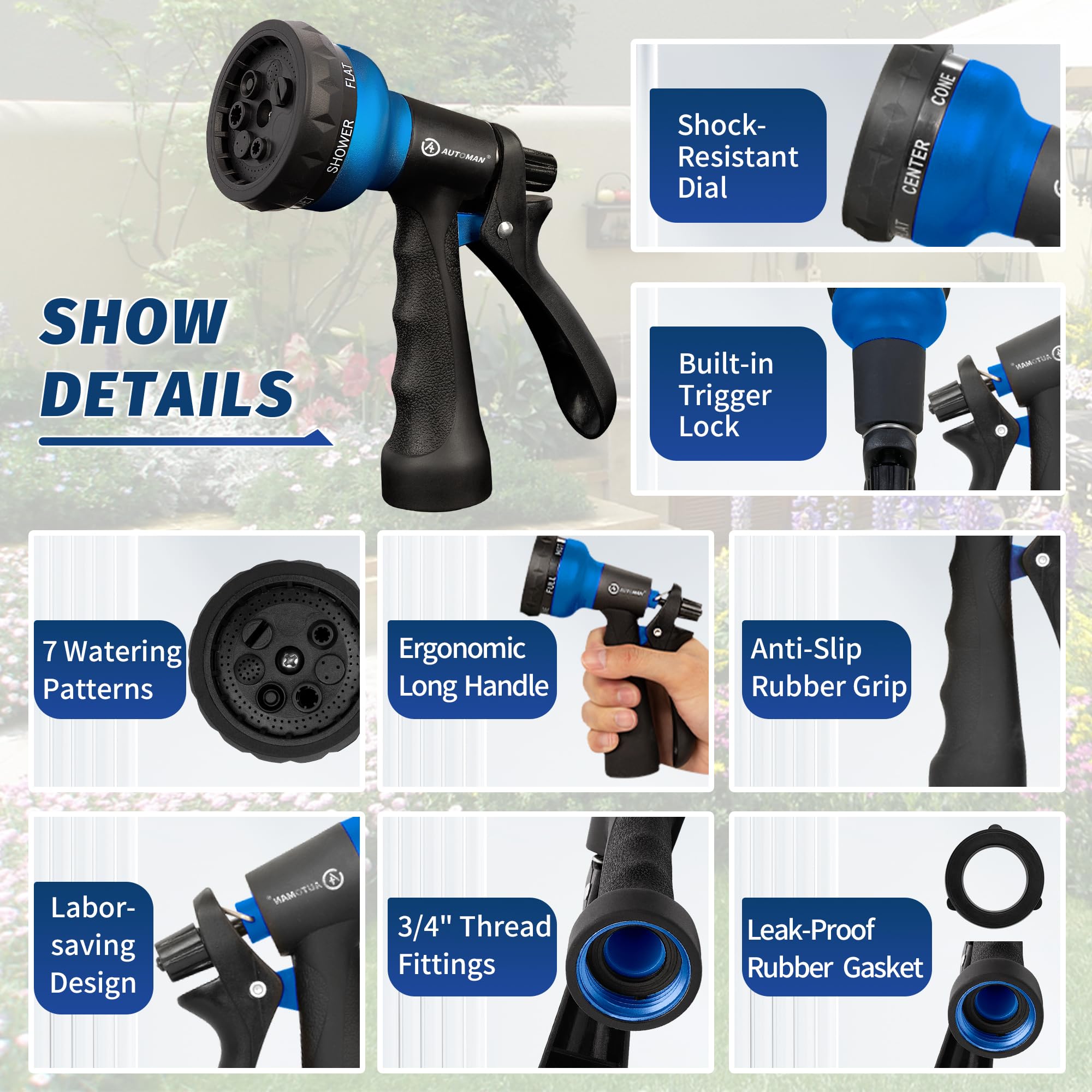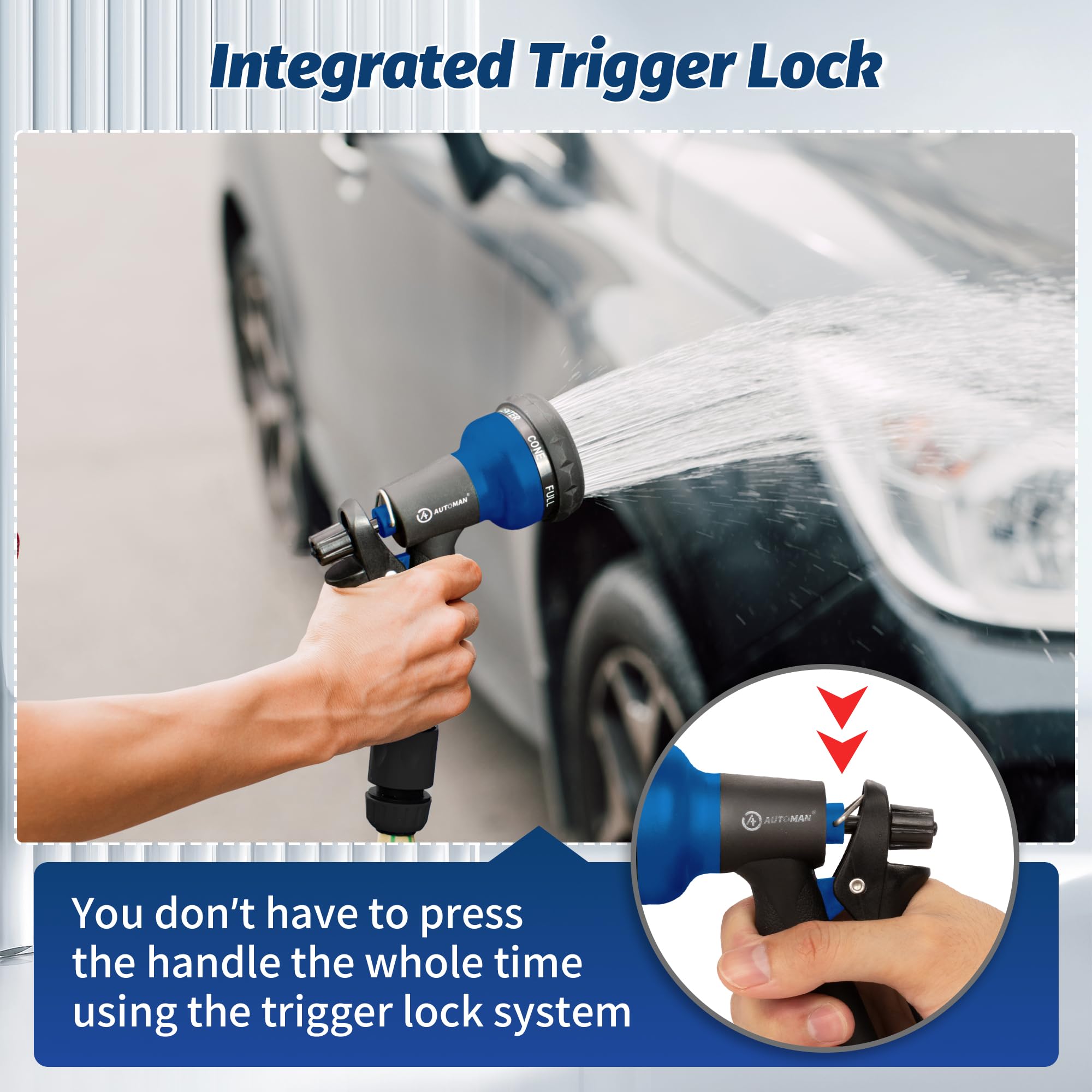 LABOR-SAVING DESIGN: AUTOMAN garden nozzle features a nice lock bar at the top of the handle that keeps the water remains on without you having to apply any pressure.Just use the lock so you don't have to keep your hand holding it the whole time.