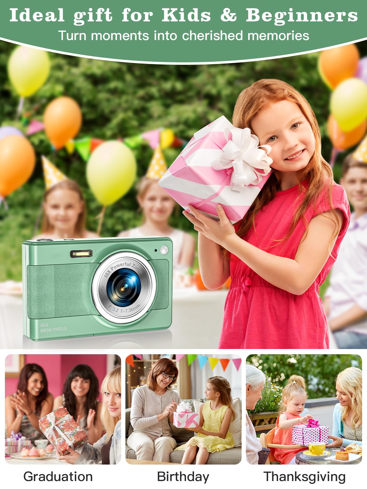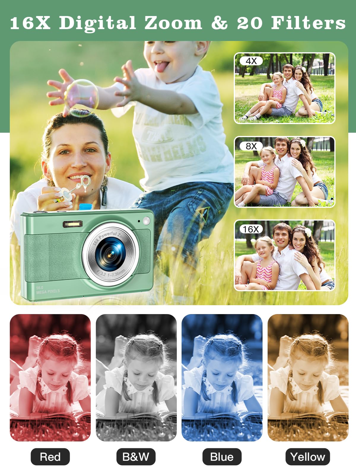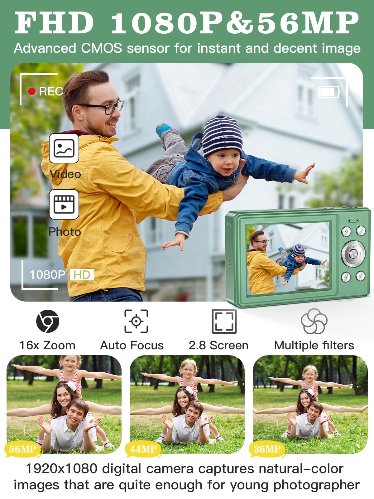 【2024 Upgraded Digltal Camera】This camera uses the latest & advanced CMOS chip, 56 MP quality images & FHD 1080P quality videos,there is also a built-in fill light to help you take high quality pictures even in low light&dark settings.This camera is an ideal thing for kids, adults, and everyone.