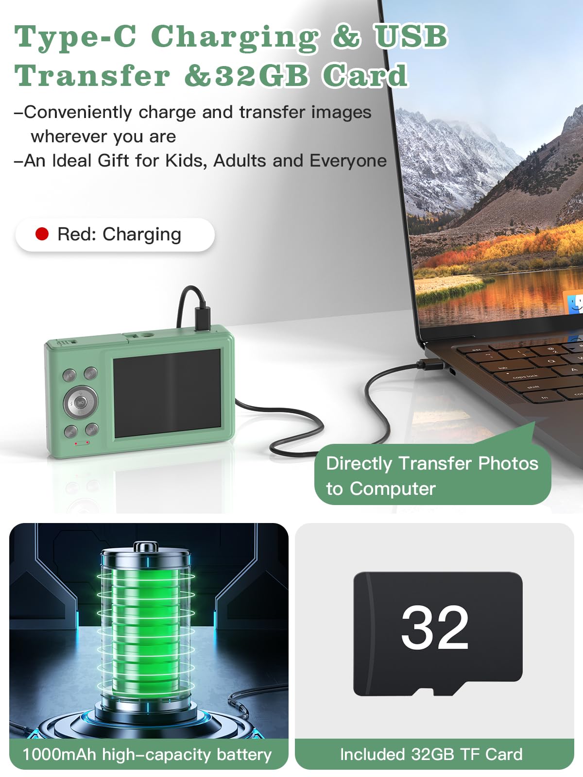 【Very Easy To Use 】Conducted with ergonomic design, from easy to access buttons to simple functions menu, user-friendly interfaces down to the large LCD display, a 5-13 years kid can easily figure out. You can effortlessly transfer your images from the digital camera to your computer, just use the included USB data cable to connect the camera to the computer. We also included a 32GB TF card to make sure you have enough storage space.