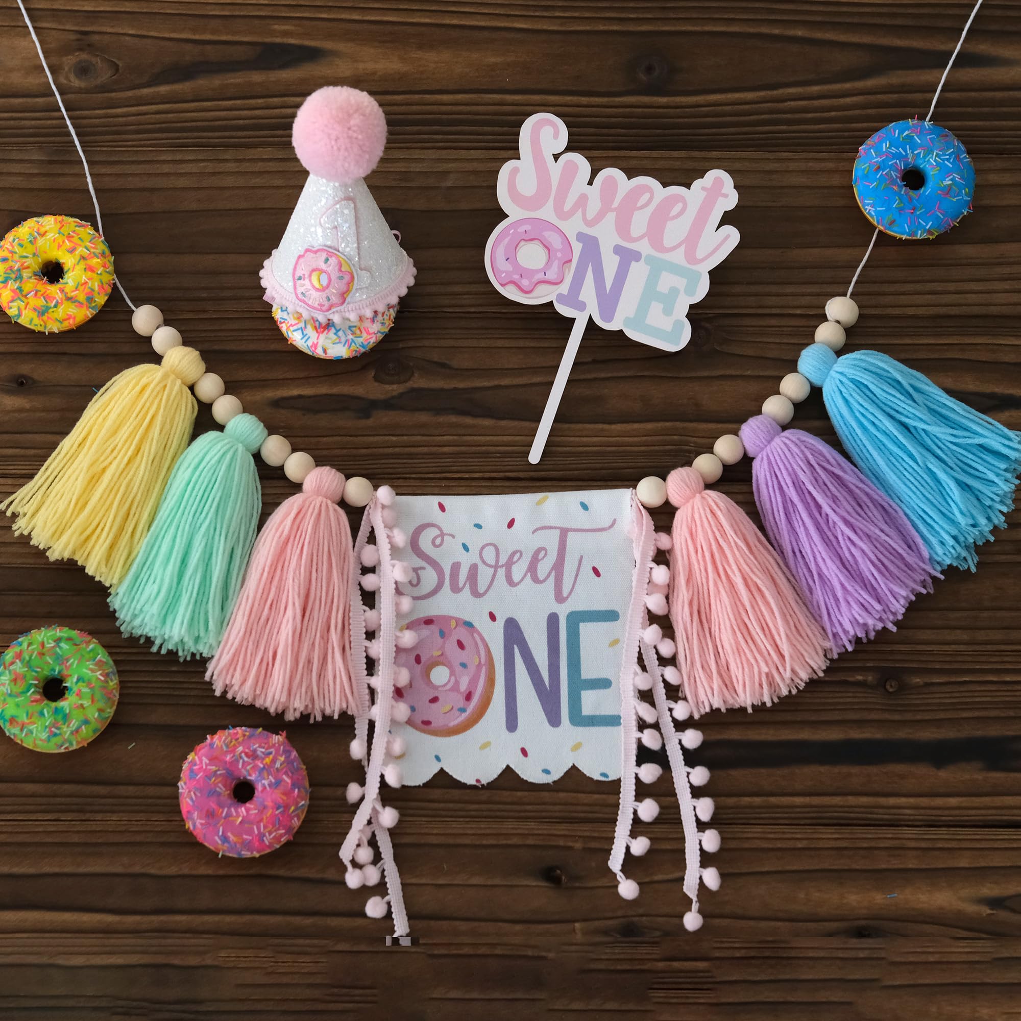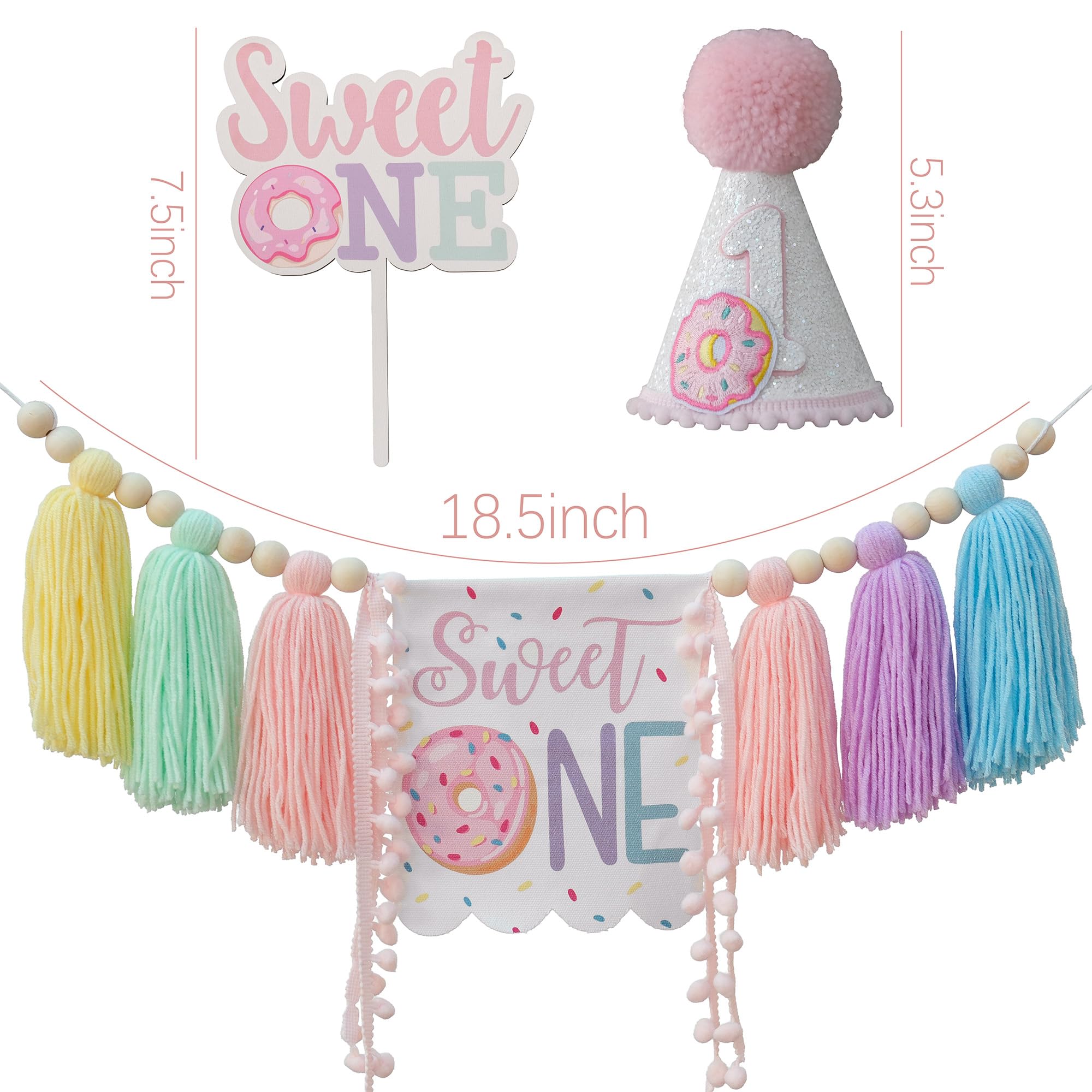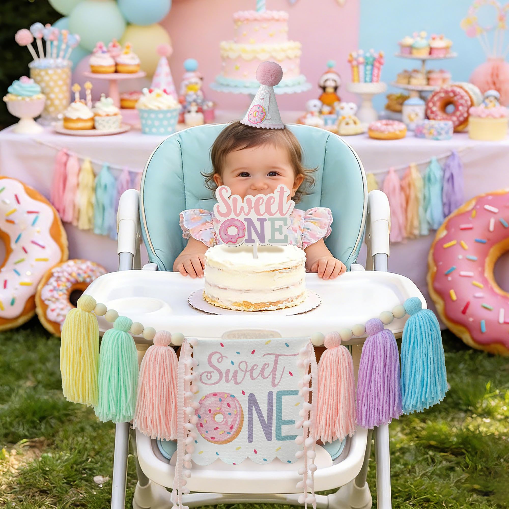 Package Contents:You will receive a dount high chair banner, a birthday hat, and a sweet one wooden cake topper. This will be a major highlight of your sweet one birthday party decorations.