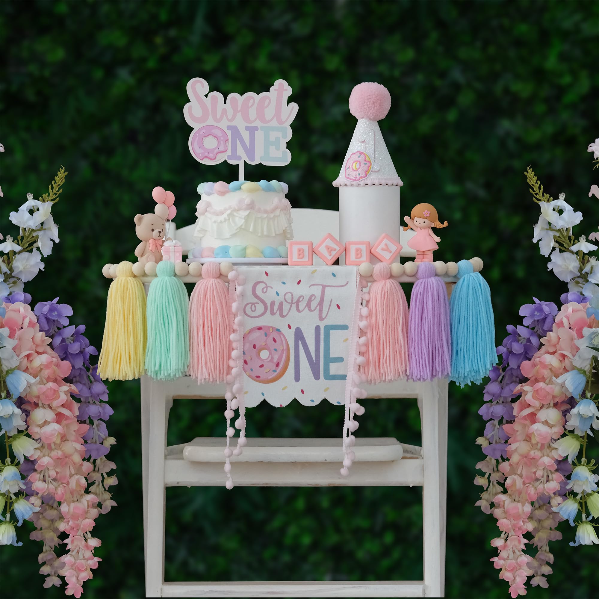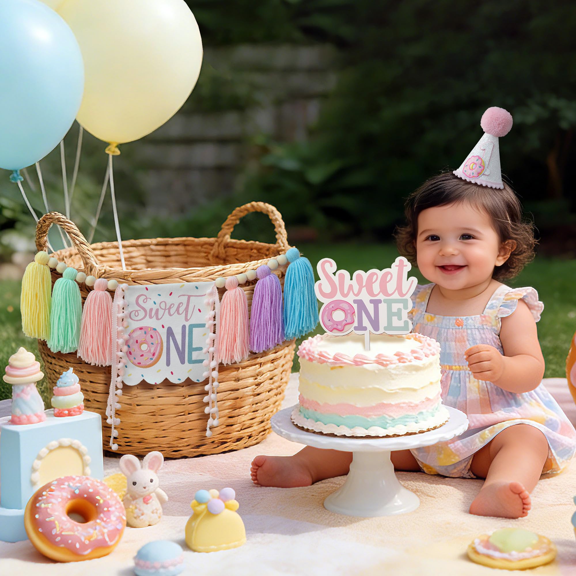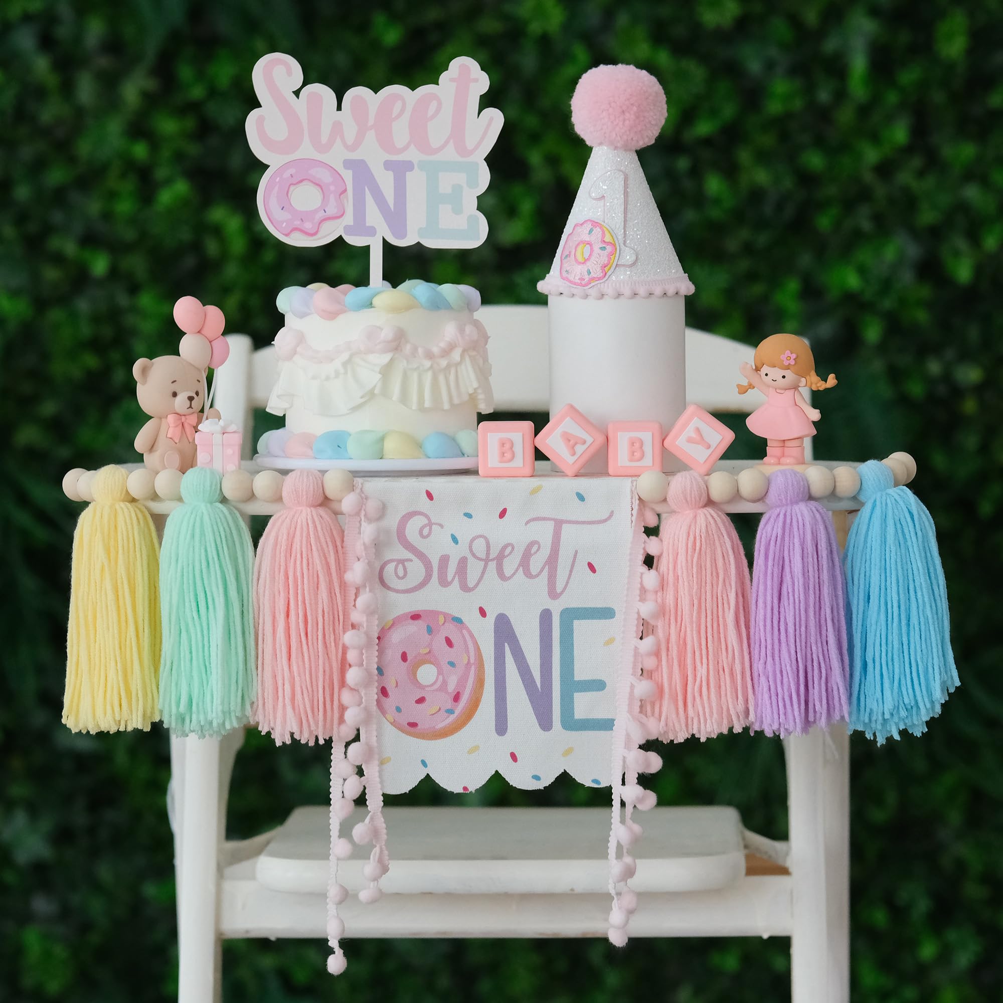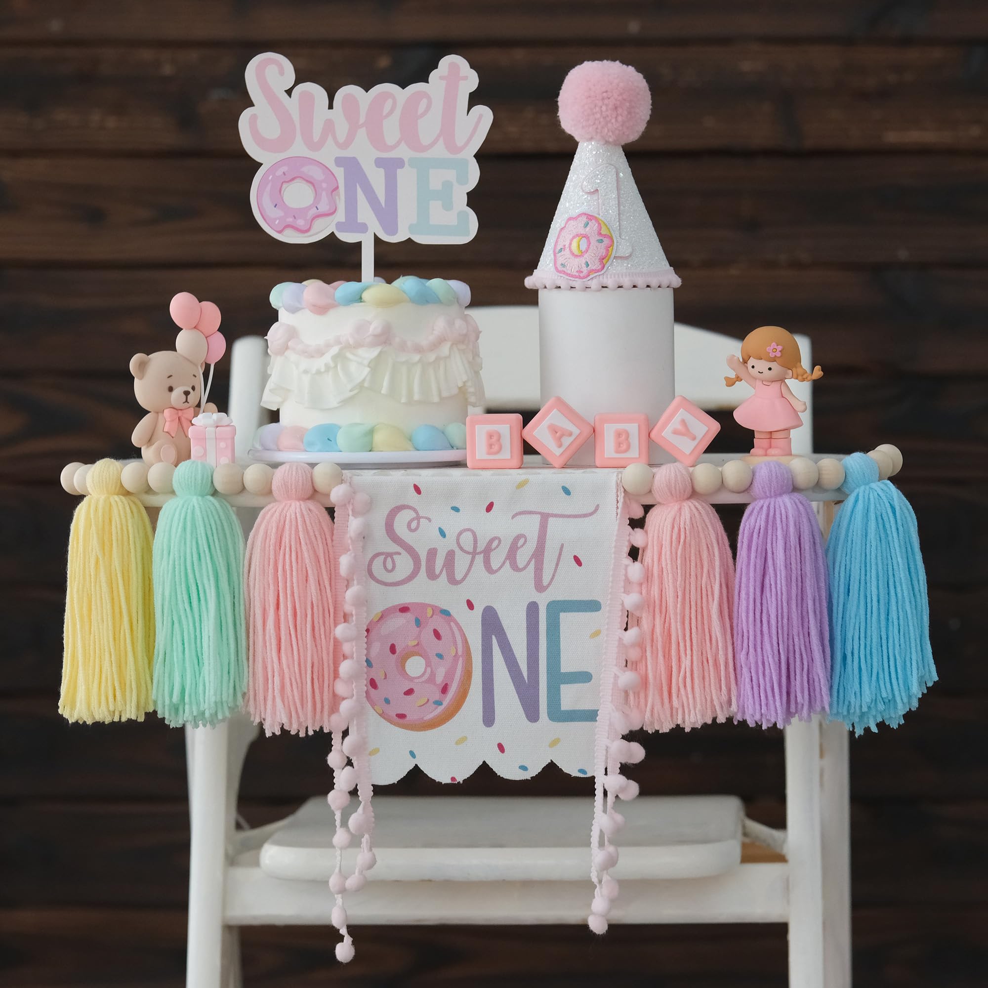 Package Contents:You will receive a dount high chair banner, a birthday hat, and a sweet one wooden cake topper. This will be a major highlight of your sweet one birthday party decorations.