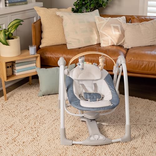 Entertain baby while also adding flair to your home dcor with the Ingenuity Swing 'n Go Portable Swing - Chambray! The removable and rotatable toy bar - made with wood from a sustainable forest - adds a touch of luxe detail