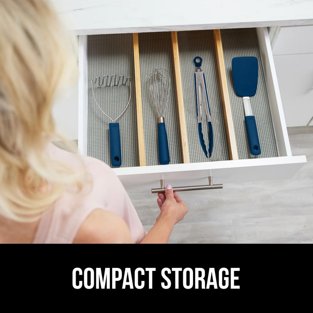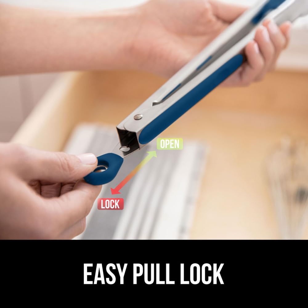 EASY PULL LOCK: the tongs easily become compact when you pull the easy pull lock up; they fit seamlessly in most drawers and cabinets for easy storage; also include a hook for easy hang