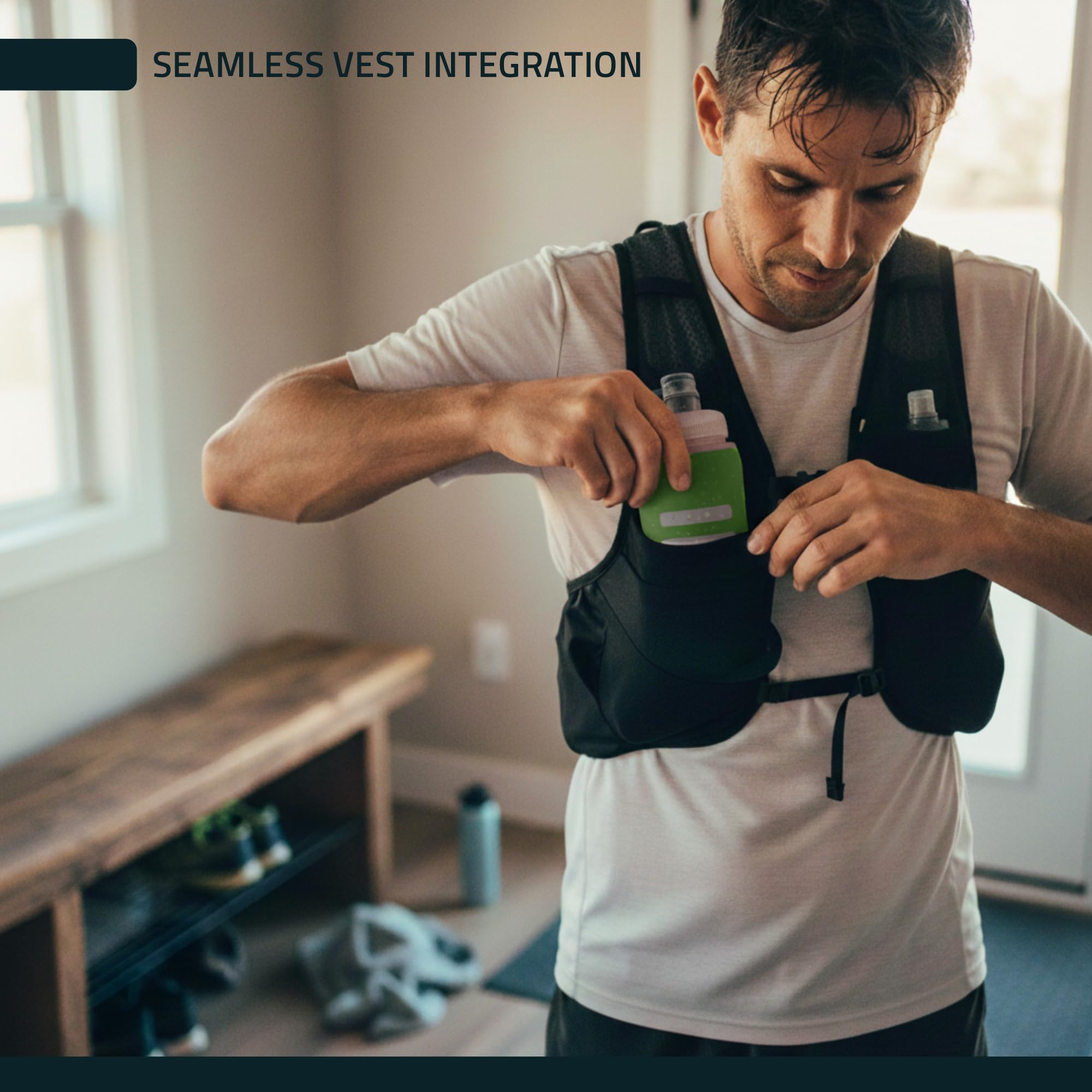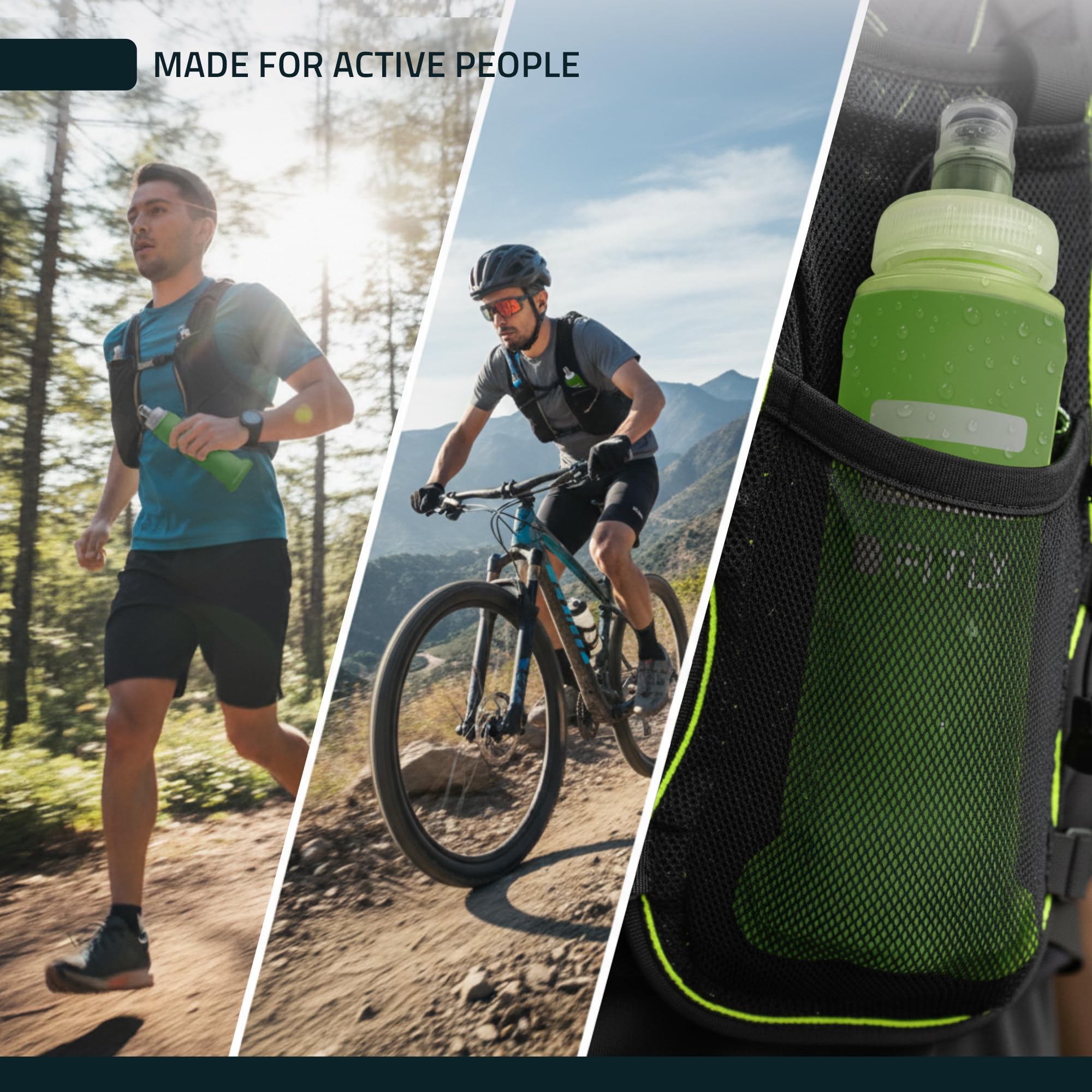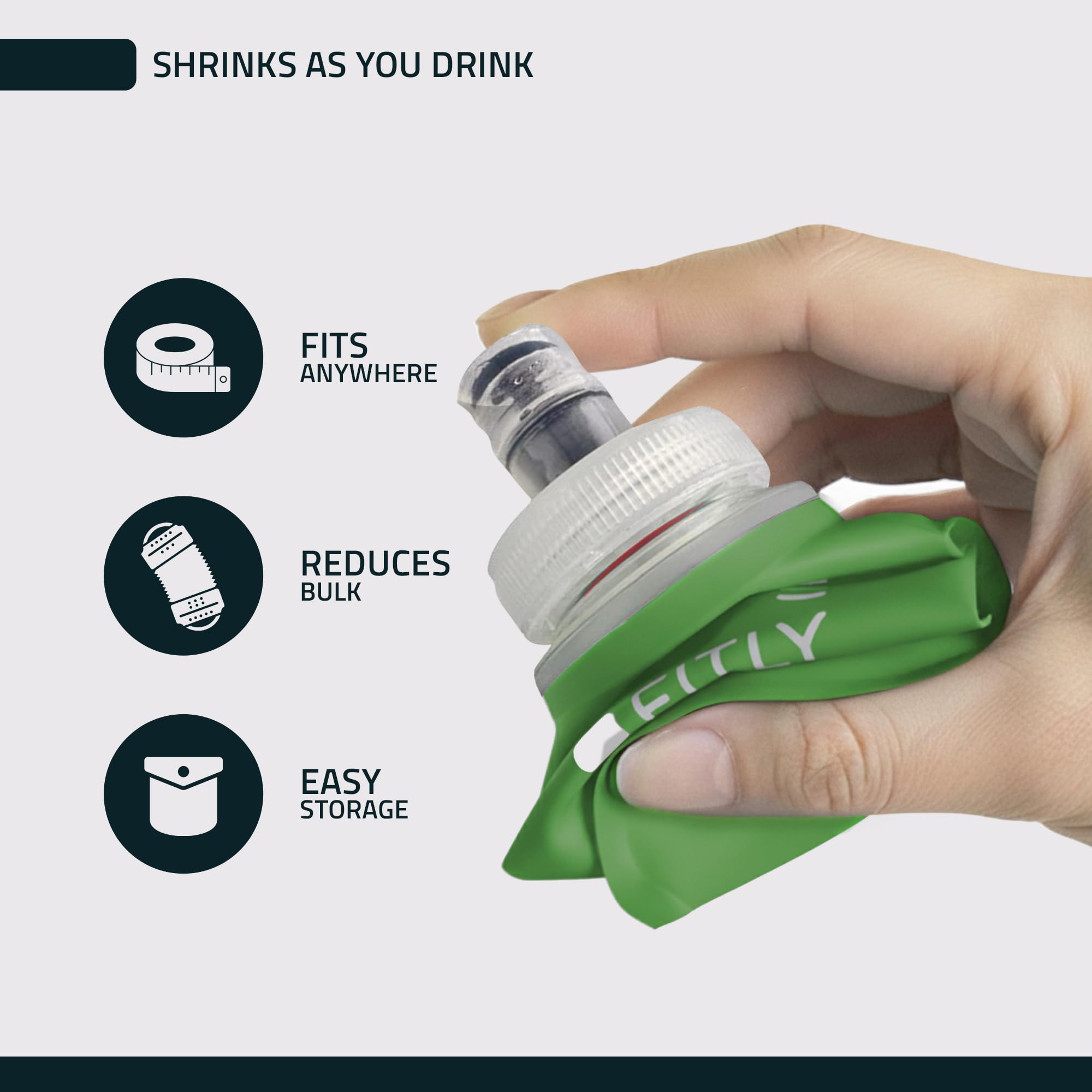 SHRINKS AS YOU DRINK: Our running vest water bottle is uniquely designed to shrink as you drink. This ensures the water doesnβt slosh around, bounce, or rattle. The flexible design of our hydration flask shapes to your hand & body, meaning the soft flask is never unwieldy. Our flexible running flask features an intelligent bite valve & leak-resistant mouthpiece.