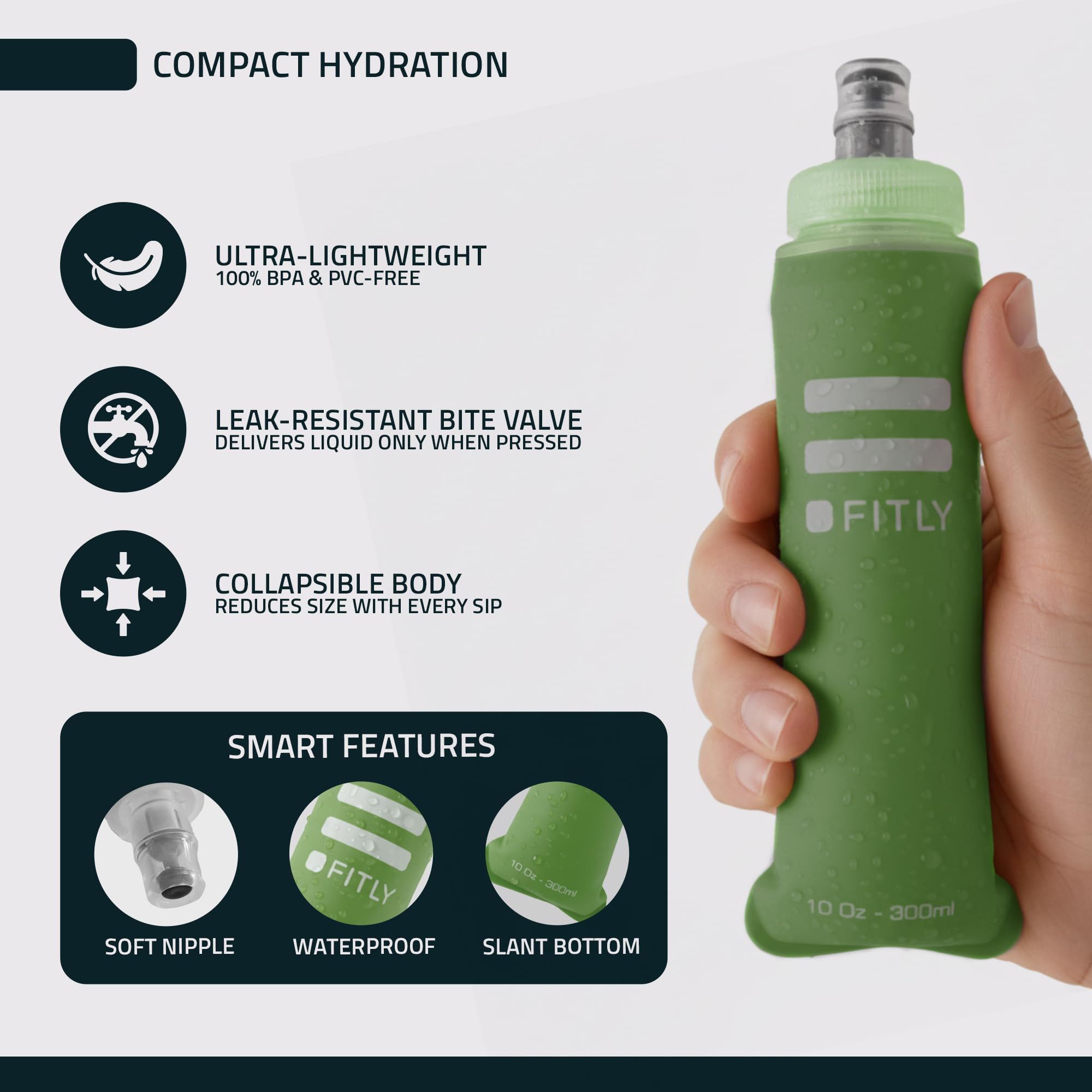 STAY LIGHT ON YOUR FEET: FITLYβs collapsible flask is purposely lightweight, ensuring you stay light on your feet and not weighted down by unnecessary bulk. At FITLY, reusability is deeply important to us, and our water bladder is no exception. Enjoy limitless use from our portable soft water bottle for running vest that is 100% BPA & PVC-free.