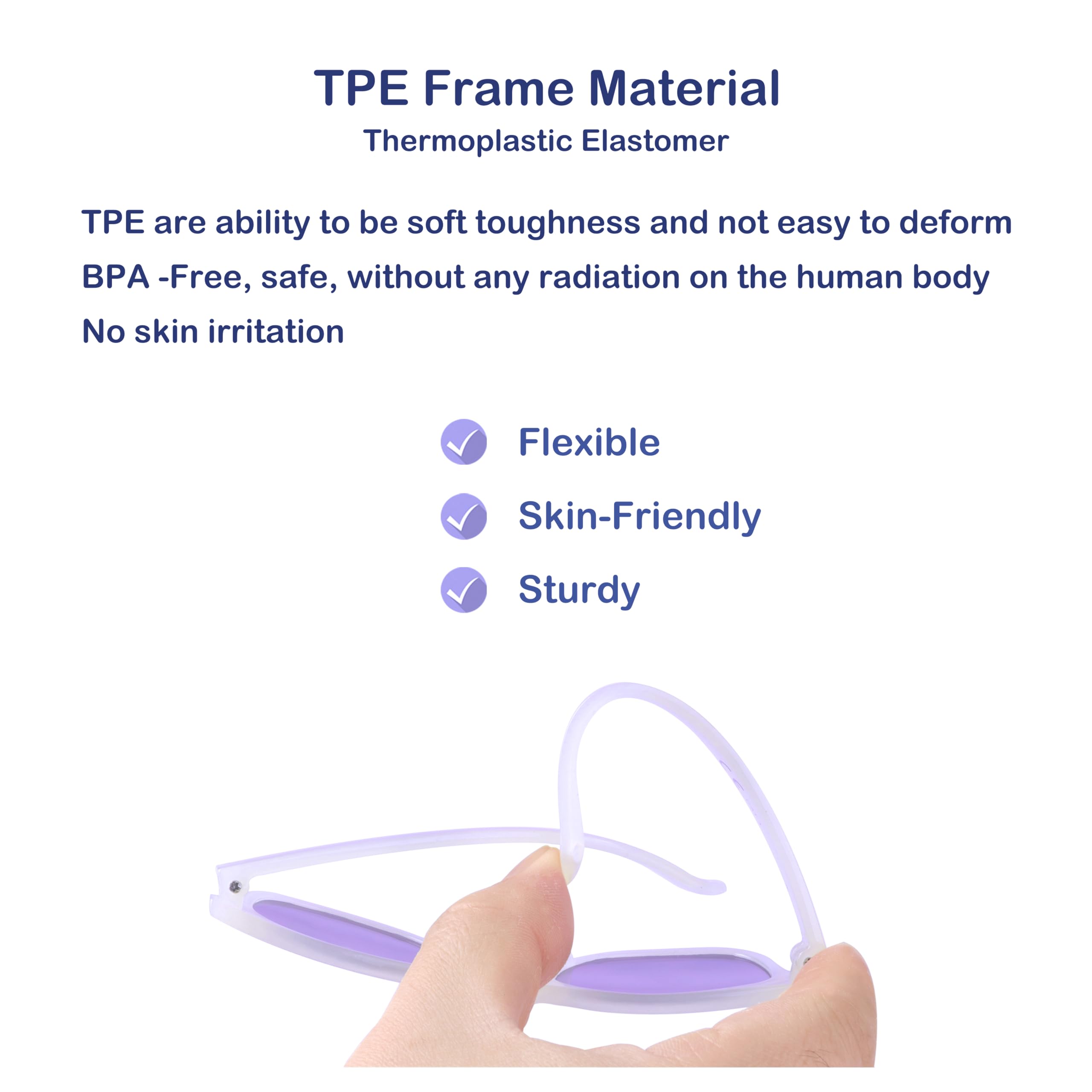 Frame: Made of high quality thermoplastic elastomer (TPE). TPE material is soft, smooth, flexible and lightweight to wear without squeezing the ears and nose. It is food grade, non-toxic and tasteless, durable and scratch-resistant