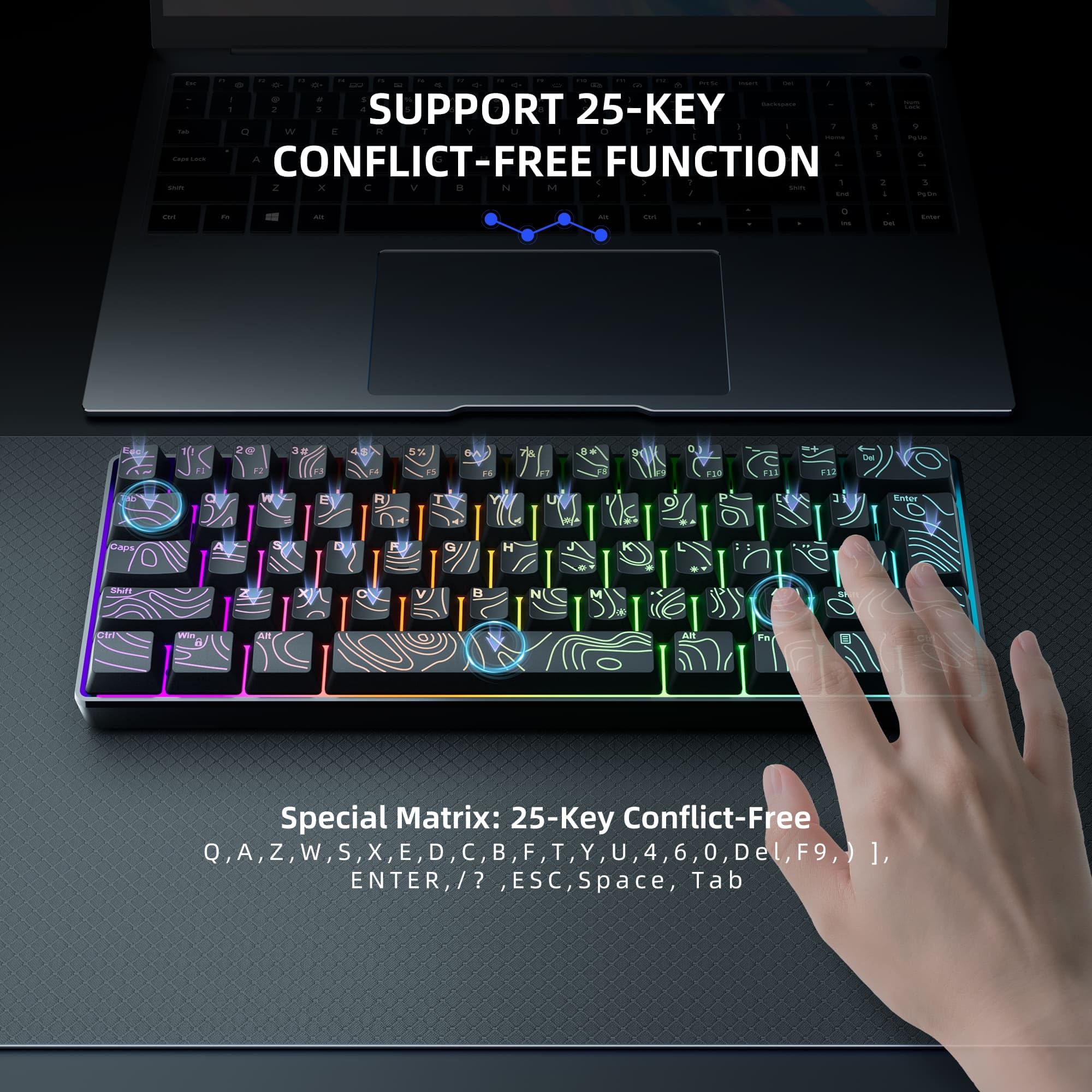 Mechanical Feel Keyboard and 25 Keys Anti-Ghosting: As a gaming stuff, stable membrane switch structure to meet the requirements of mechanical feel and only 2.5ms fast response speed, built-in 25 keys membrane switch to meet most of the gaming needs.