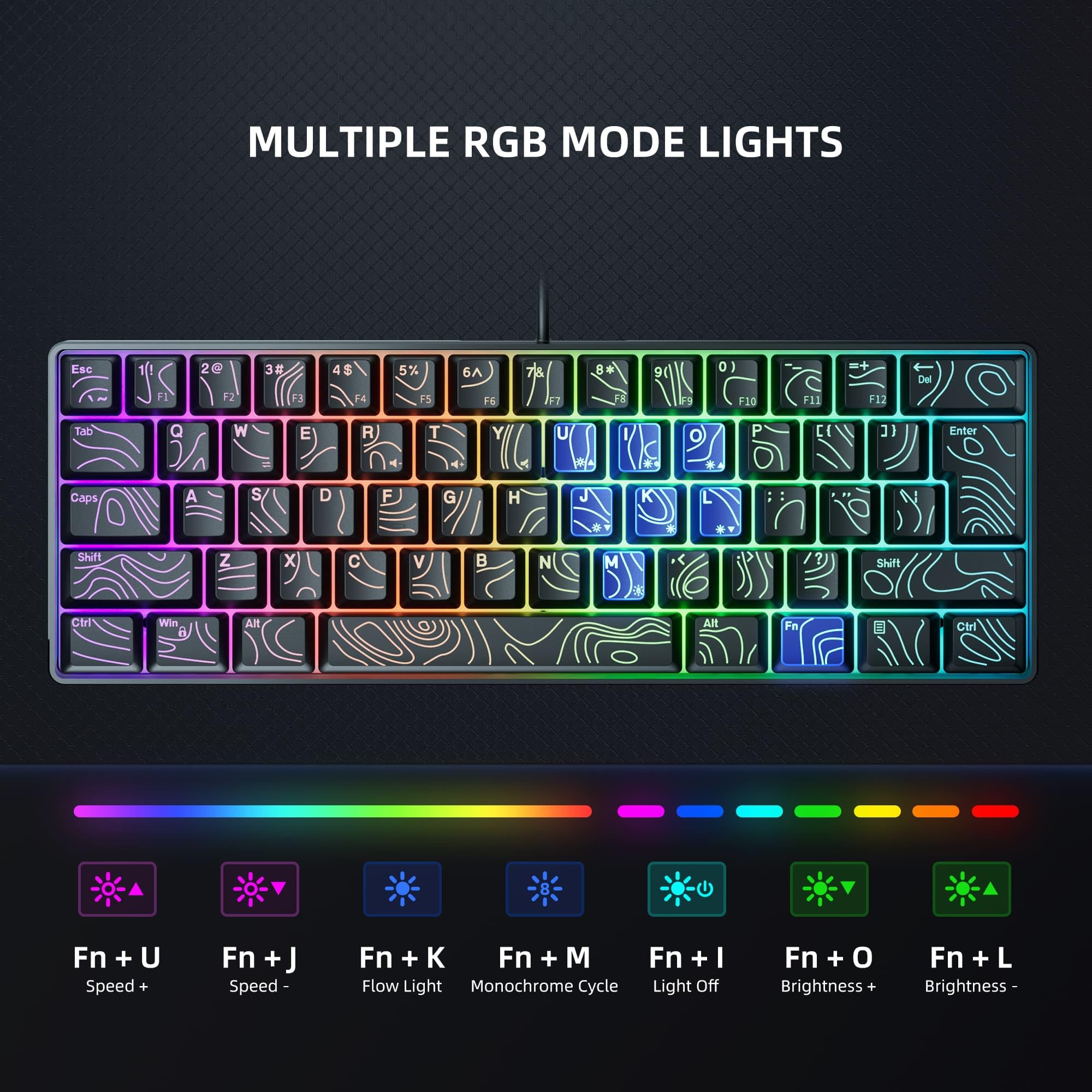 True RGB Backlight: When used as a gaming keyboard you can easily adjust the brightness, color, and speed of the blinking lights by simply using a combination of keys. For office, you can press FN+I to turn off the lights and return a refreshing experience.