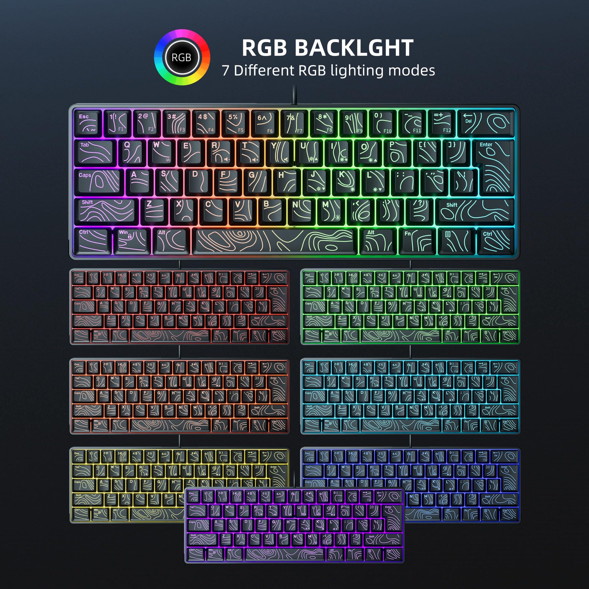 7KEYS Mini 60 Percent Keyboard Gaming, RGB Backlight Mechanical Feel, 60% Wired Keyboard Anti-ghosting, Black and White Keys, Portable Ultra Compact for Office Computer/PC/MAC/Laptop (Black-line)