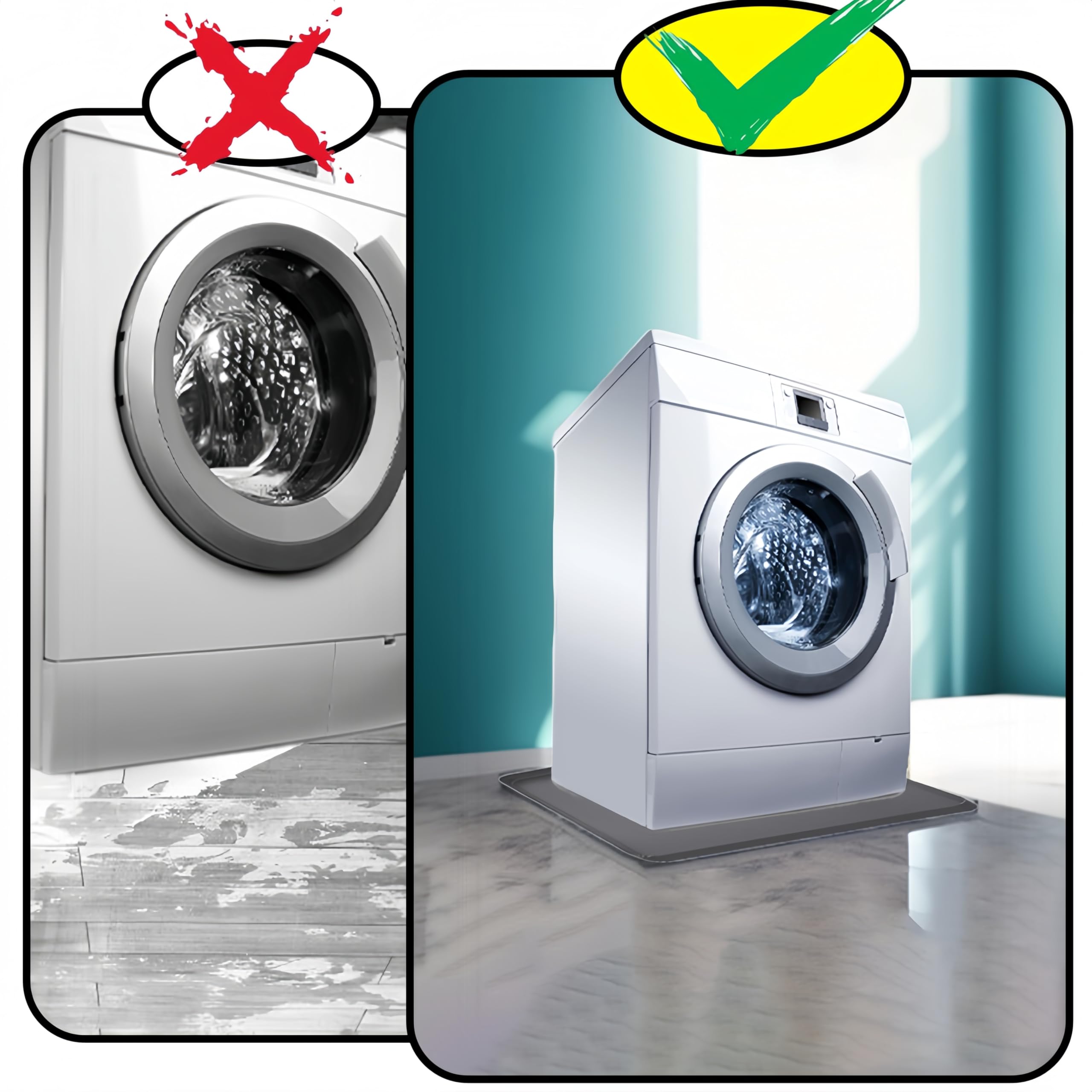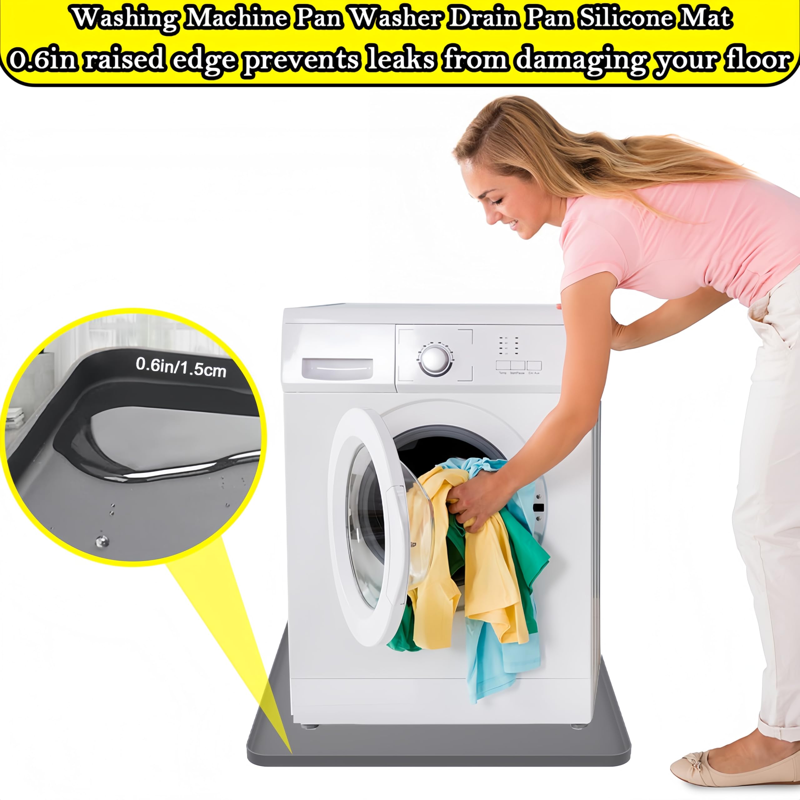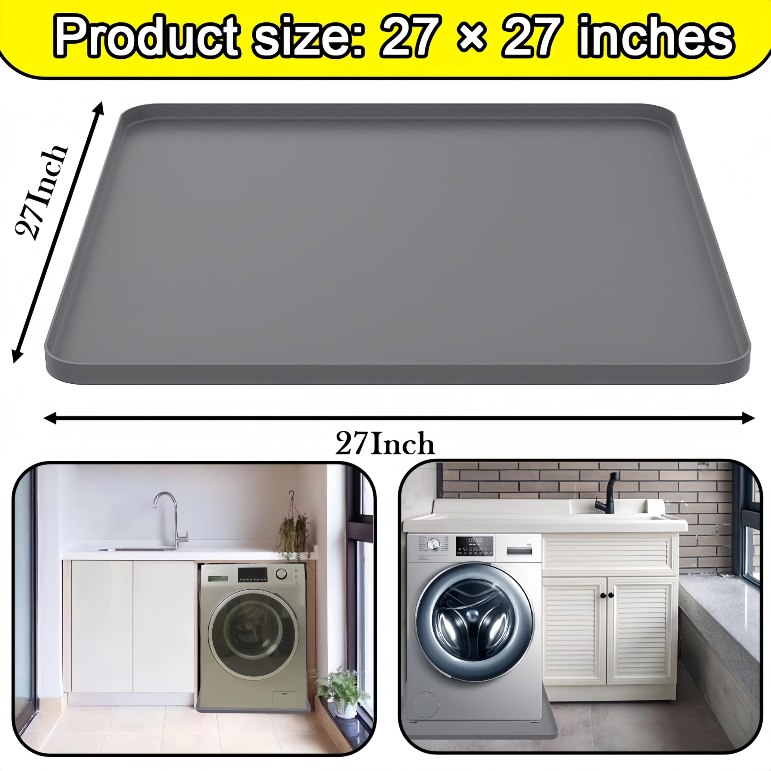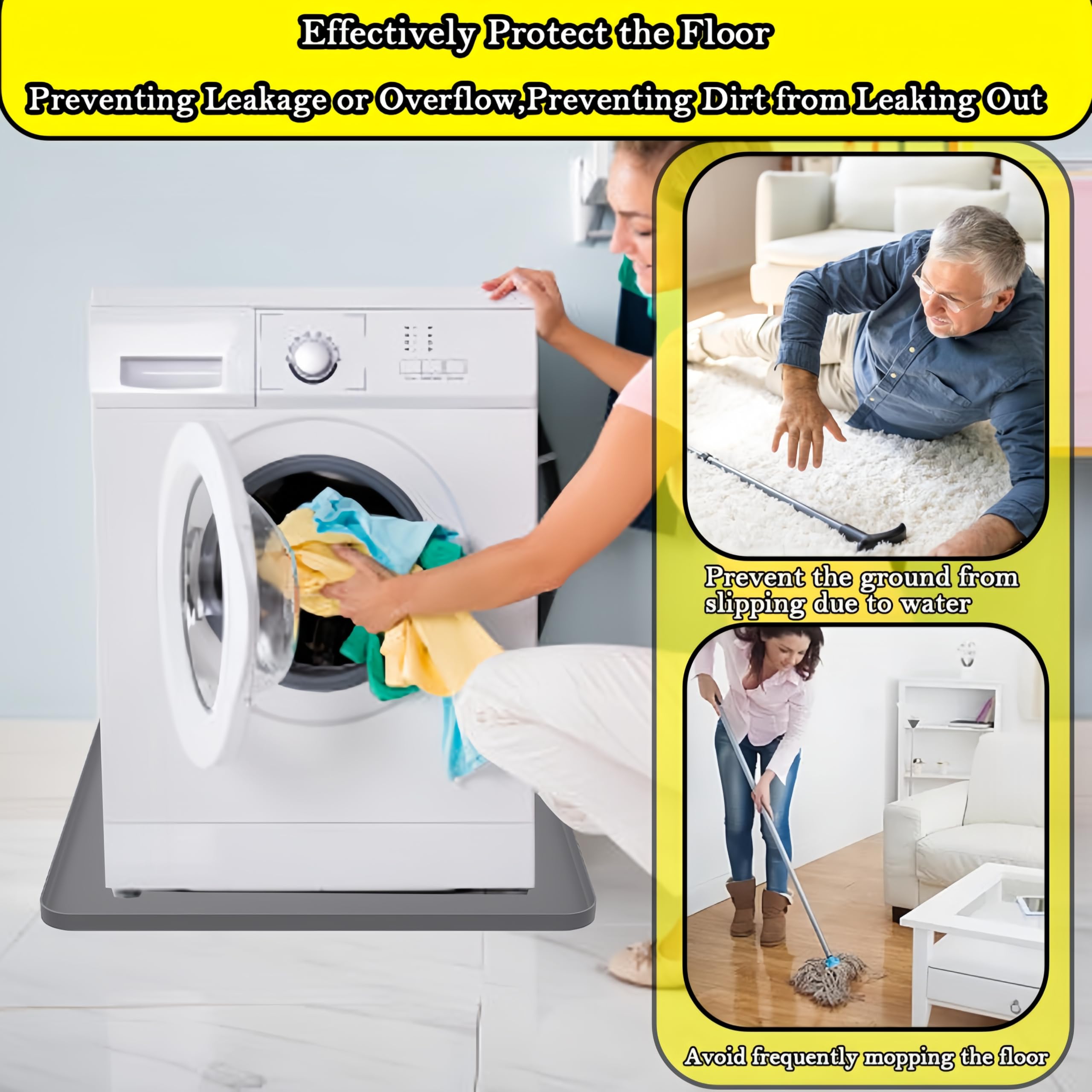 Anti-Slip and Leak-Proof:Portable washing machine mat is designed with high edges all around, which can hold a large amount of water, preventing leakage or overflow, preventing dirt from leaking out, which can effectively protect the floor or cabinet