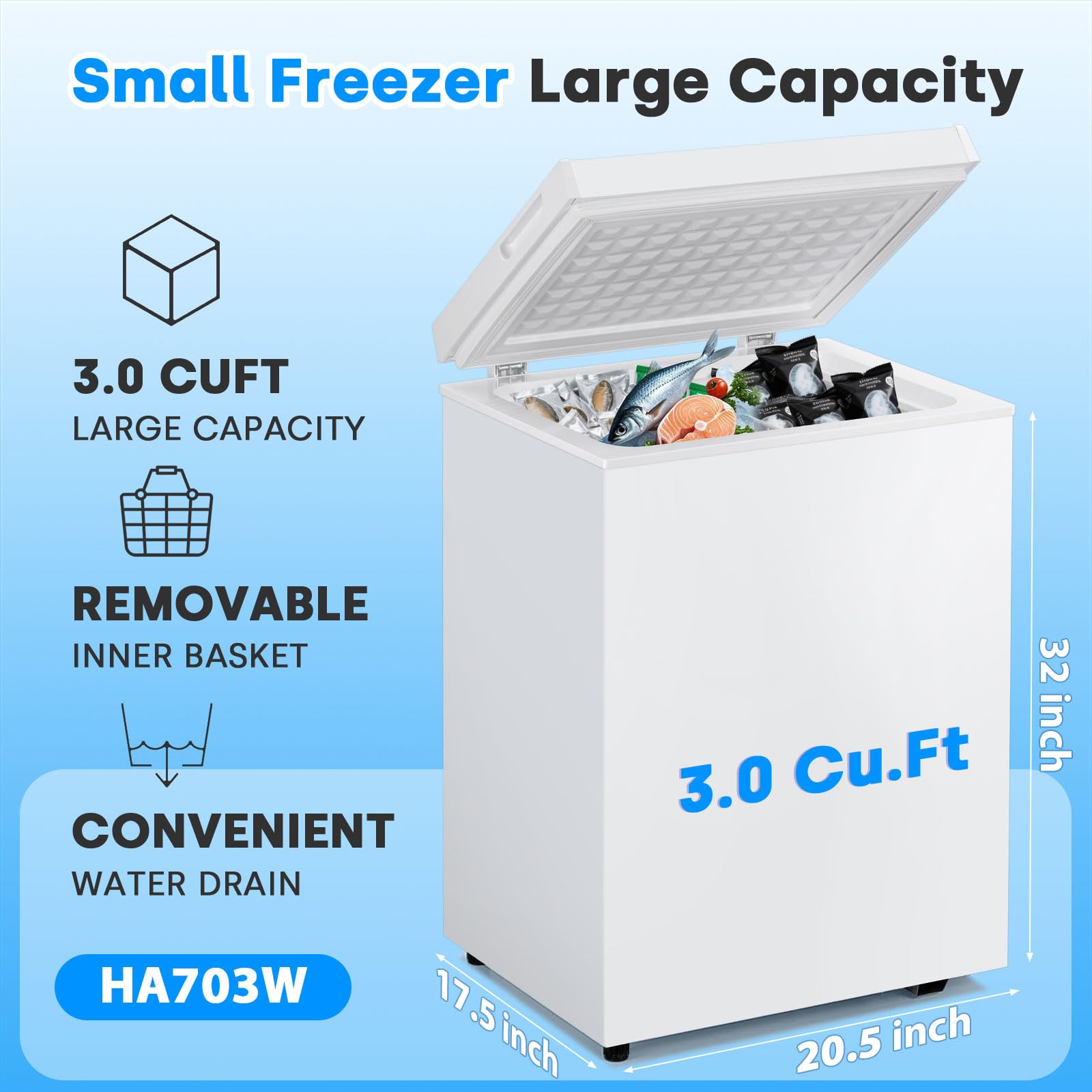 3.0 Cu.Ft Compact Capacity — Offers ample 3.0 cubic feet of storage, perfect for storing meat, seafood, ice cream, and frozen food in apartments, dorms, garages, basements, and offices without taking up much space.