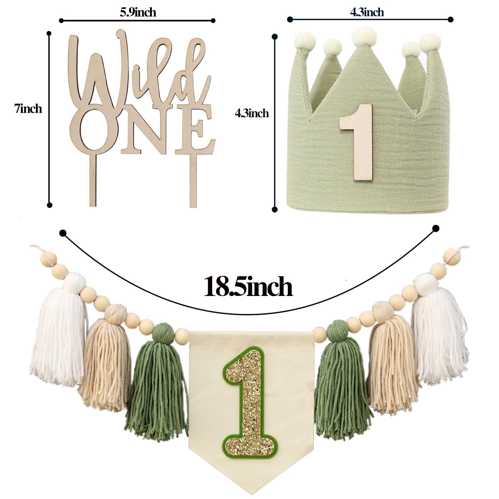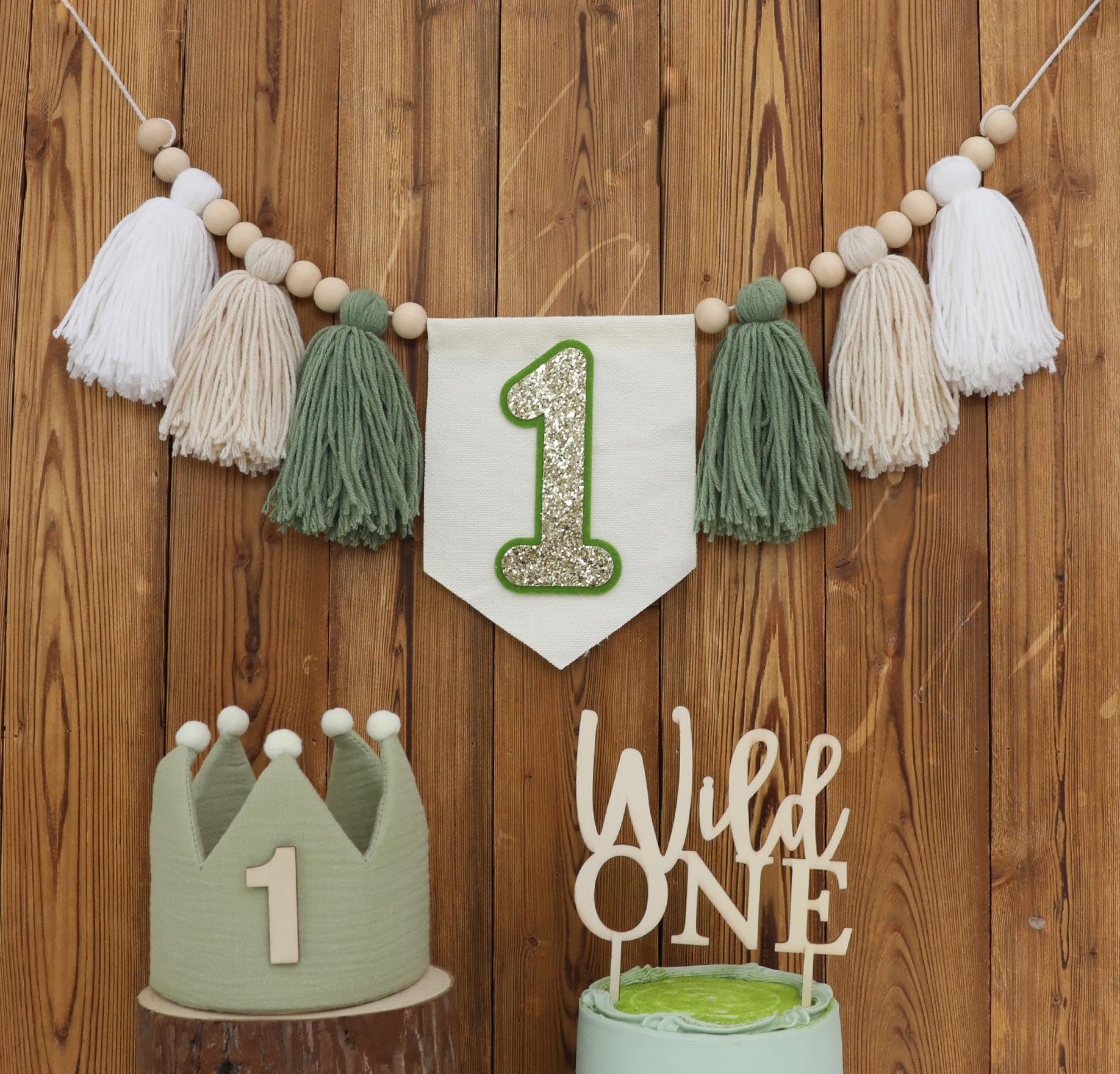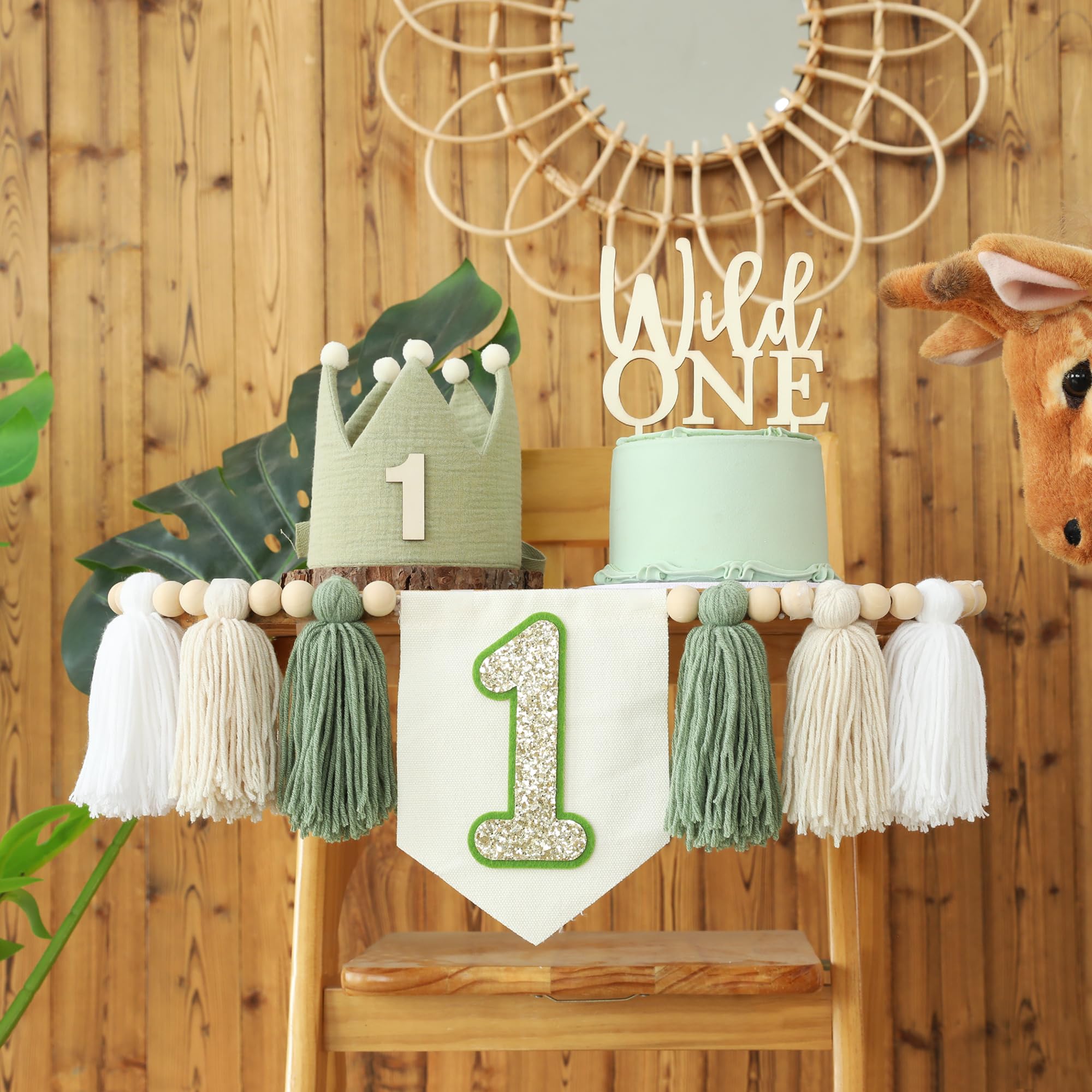 Package Content: a tassel garland banner containing white beige dark green with the number “1” and wooden beads; a green crown hat, a cake topper; package products in beautiful colors; to create a minimalist; natural atmosphere; very suitable for the jungle theme