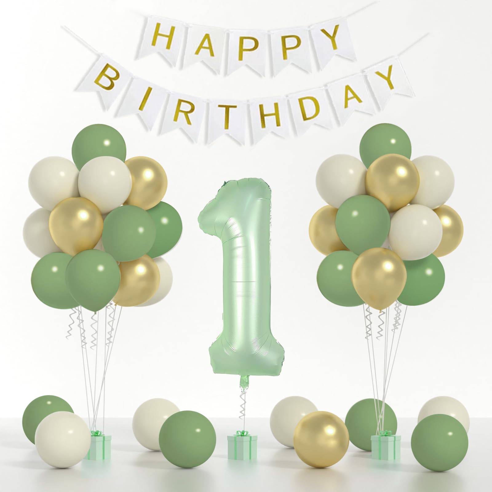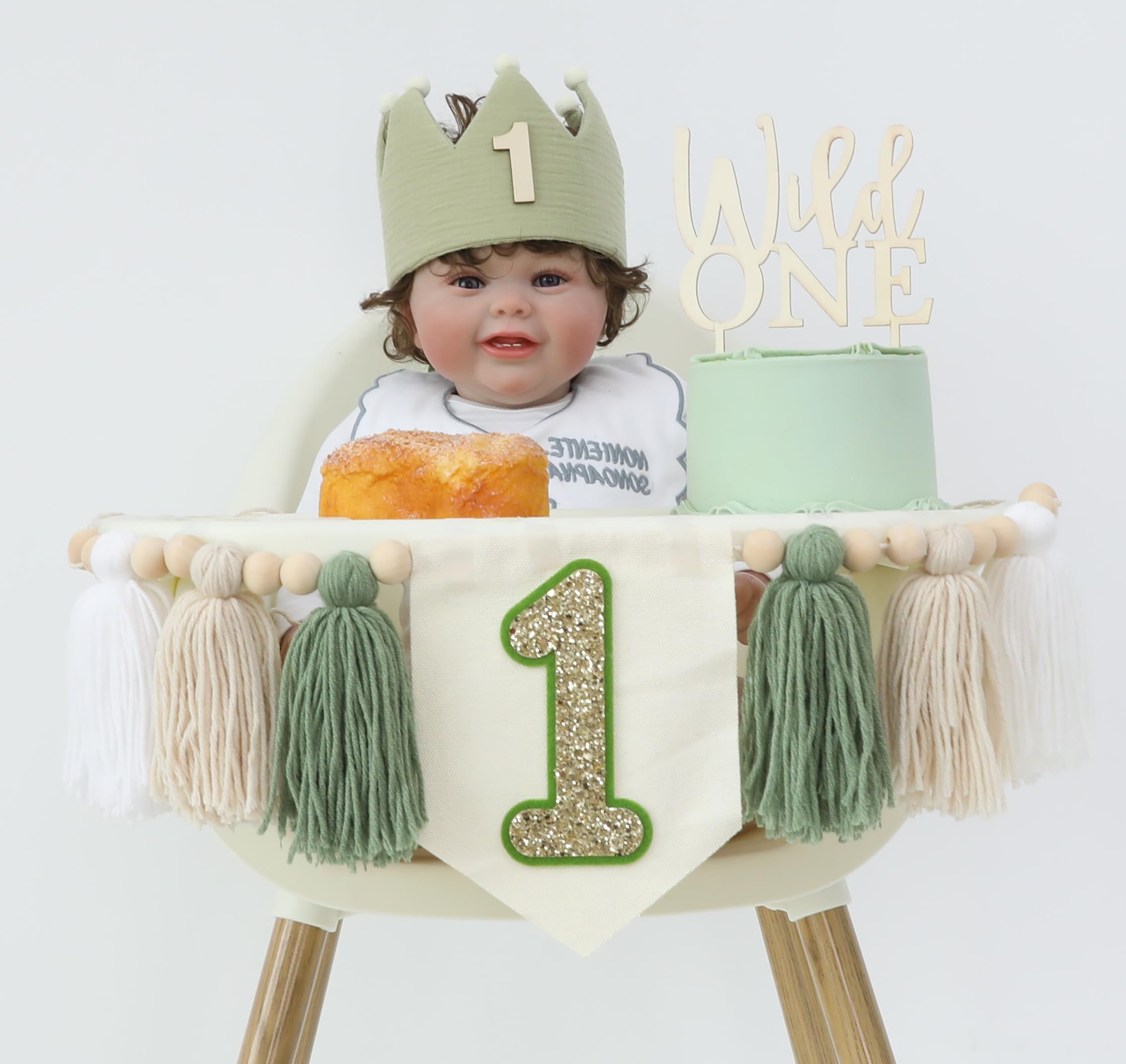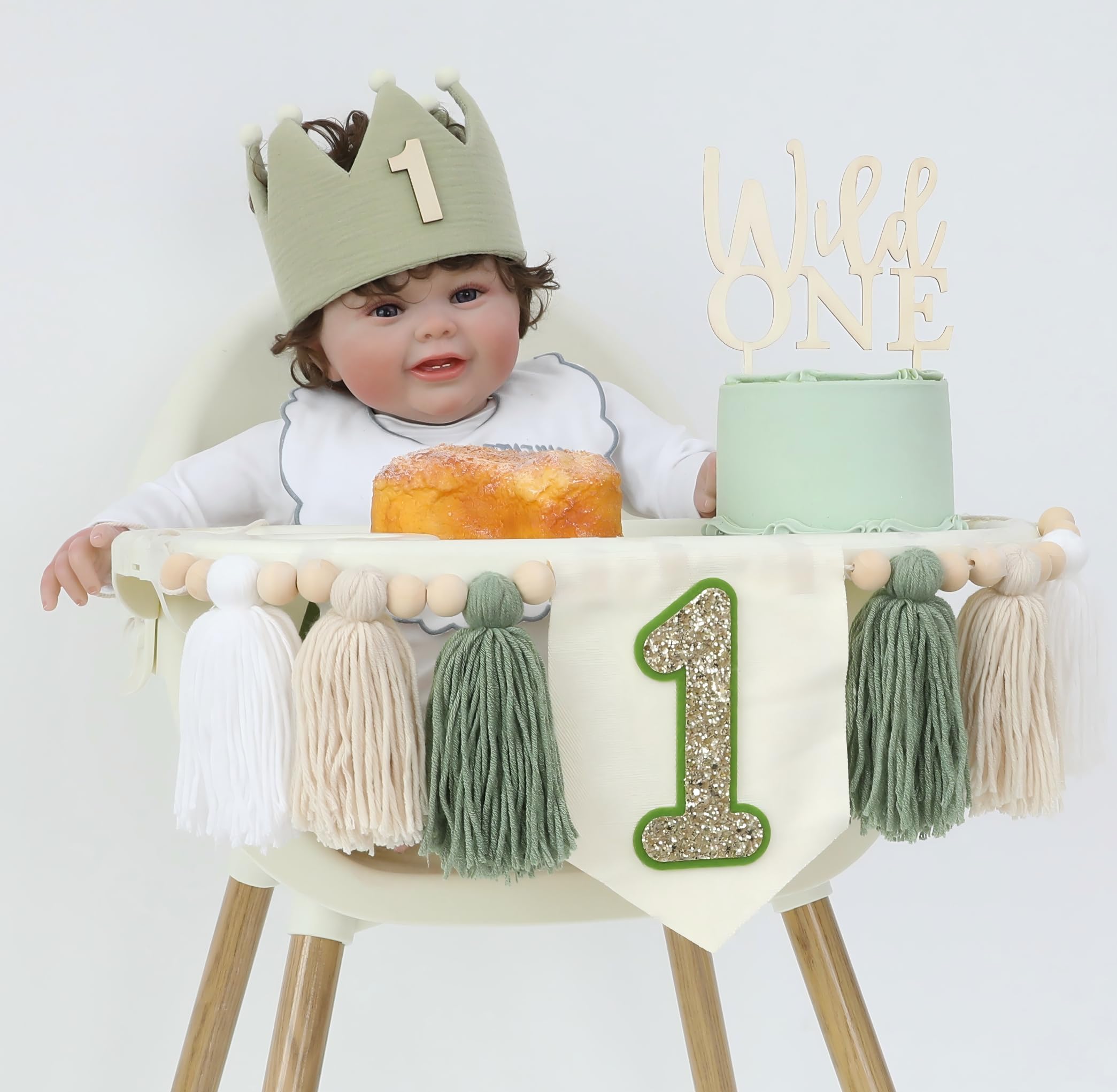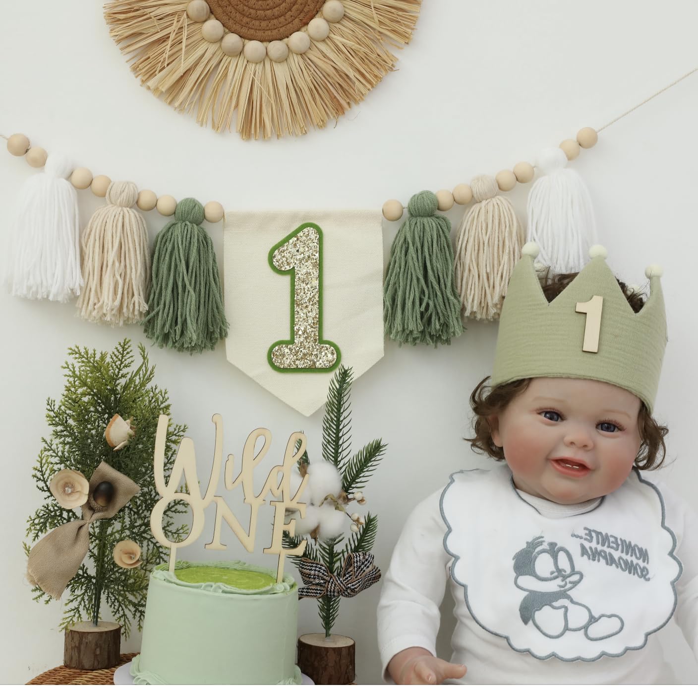 Package Content: a tassel garland banner containing white beige dark green with the number “1” and wooden beads; a green crown hat, a cake topper; package products in beautiful colors; to create a minimalist; natural atmosphere; very suitable for the jungle theme