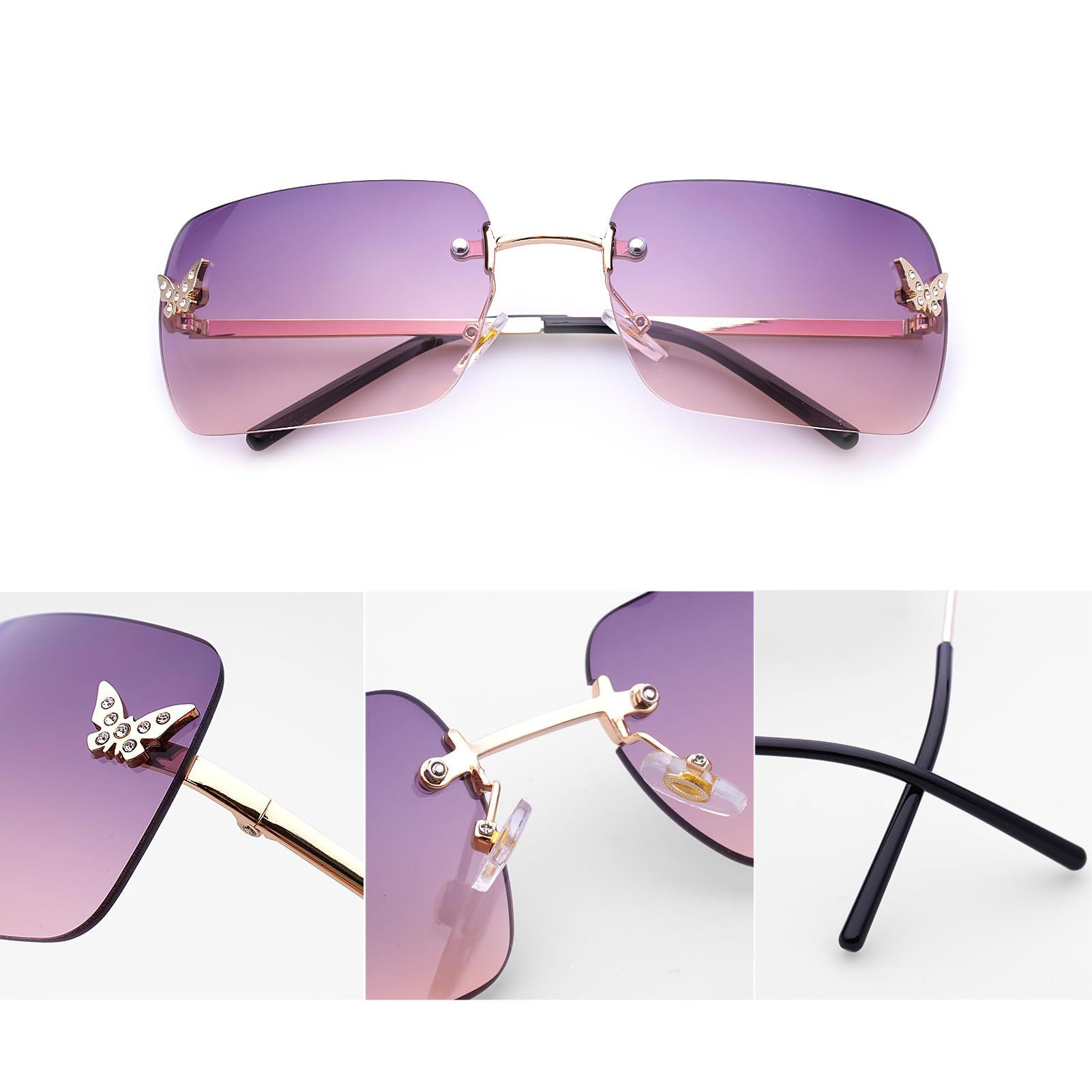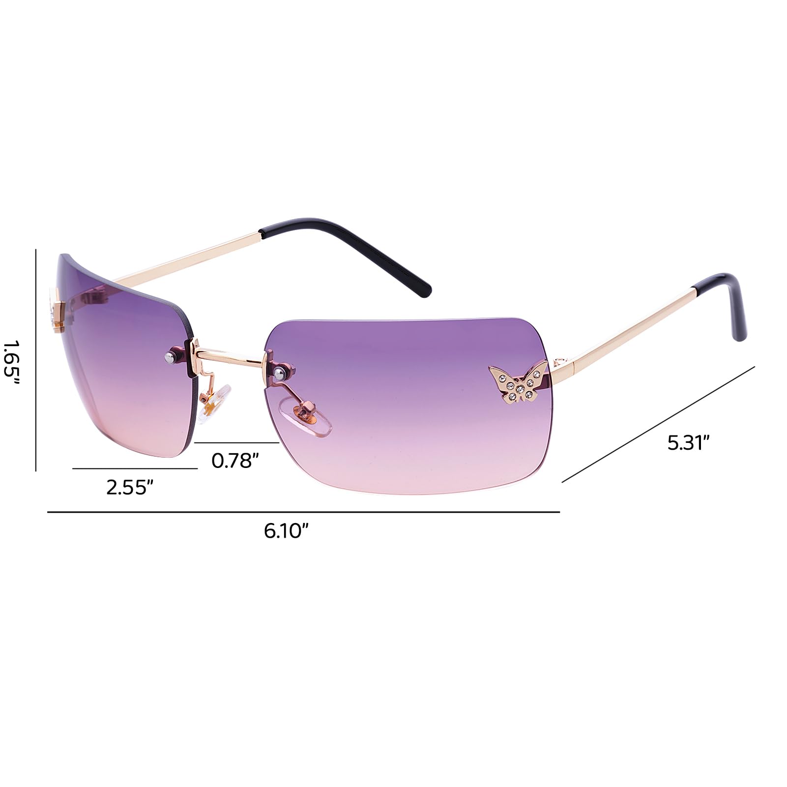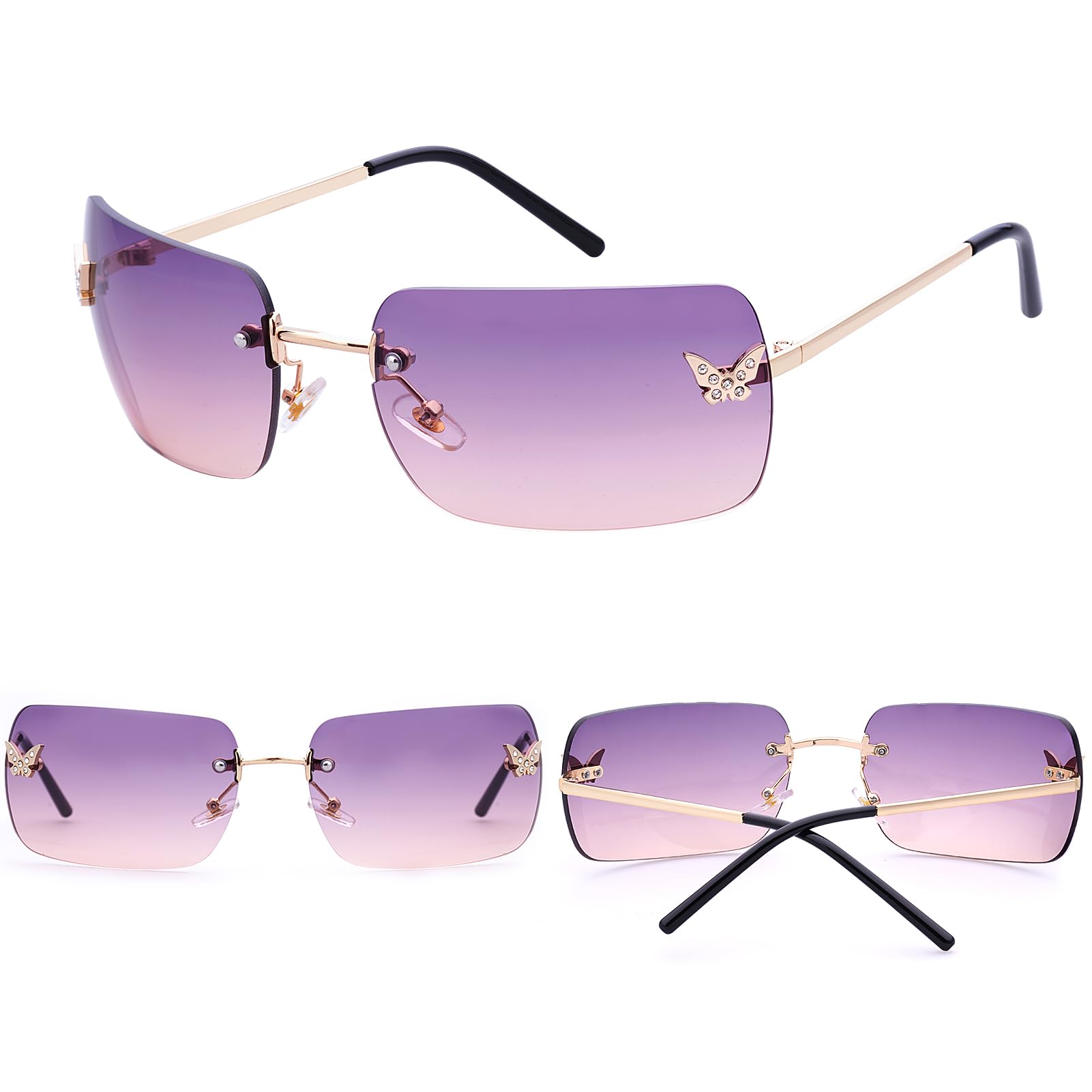RECTANGULAR Y2K SUNGLASSES: They are not only stylish but also curved to fit greatly on your face. The frameless rectangular design enhances the beauty of the glasses, the metallic glasses legs and shiny little butterflies on the lens add a y2k touch
