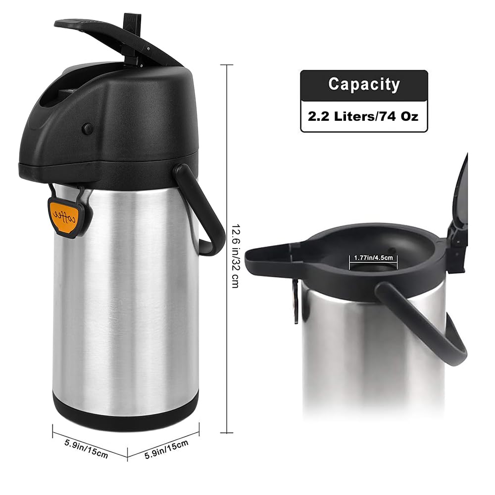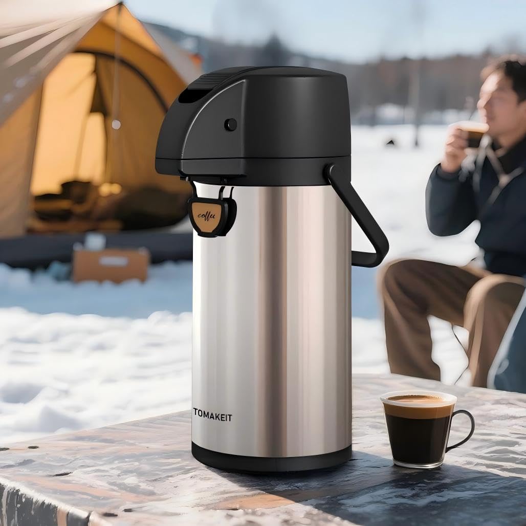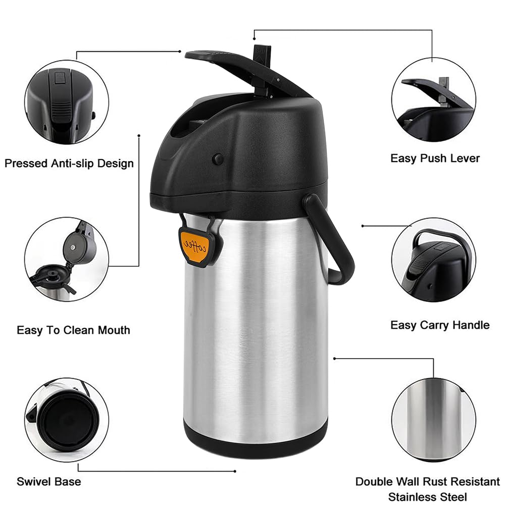 SCIENTIFIC & CONVENIENT DESIGN: This Airpot Coffee Dispenser features an innovative lever pump-action mechanism, eliminating the need to lift or tilt the dispenser. Simply press the lever gently to effortlessly and safely pour your favorite beverages. Designed for convenience and speed, the coffee carafe ensures quick dispensing while preventing spills or leaks. Perfect for busy moments, whether you're managing chores or hosting parties, this dispenser makes refilling your drinks a breeze.
