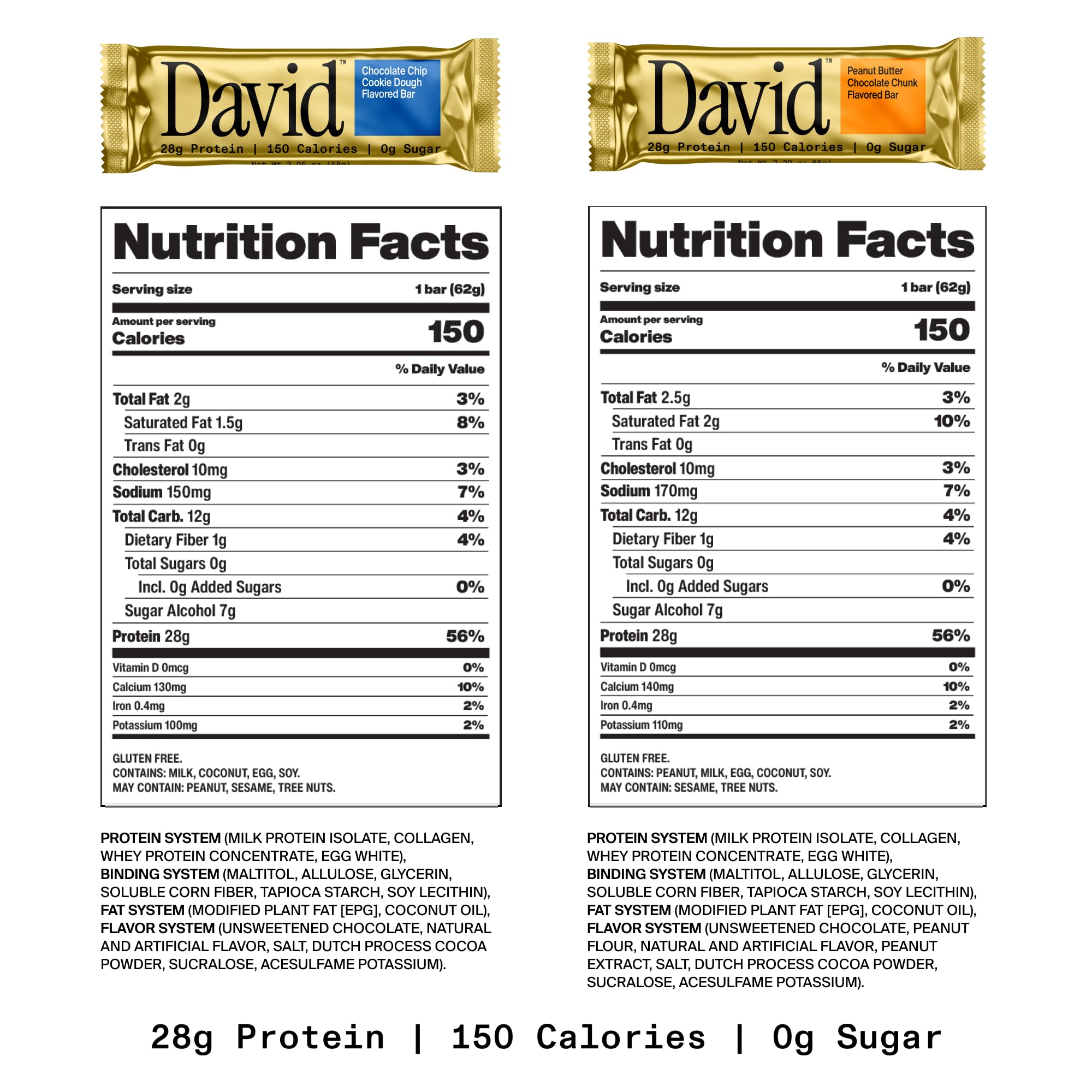 GLUTEN FREE BARS – David protein bars are designed for performance, delivering 28g of high-quality protein with 0g of sugar and 150 calories. Whether you’re fueling up pre-workout, recovering post-gym, or need a quick on-the-go snack, these gluten free bars help you stay on track with your macros - without compromising on taste.