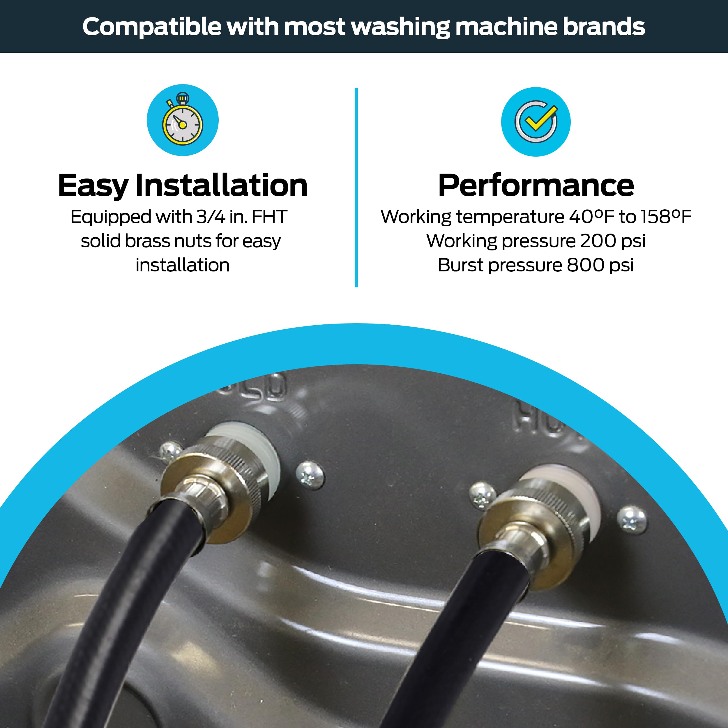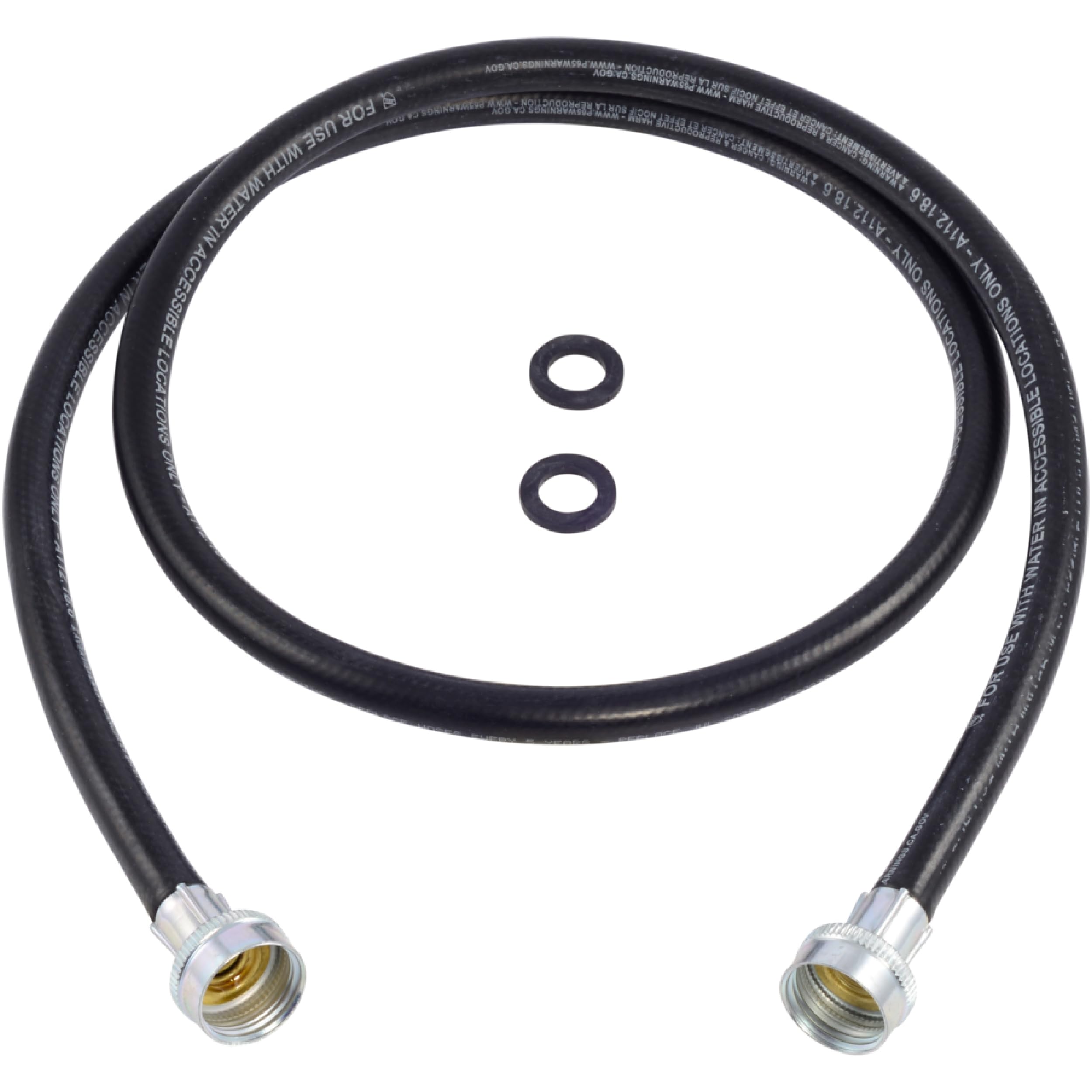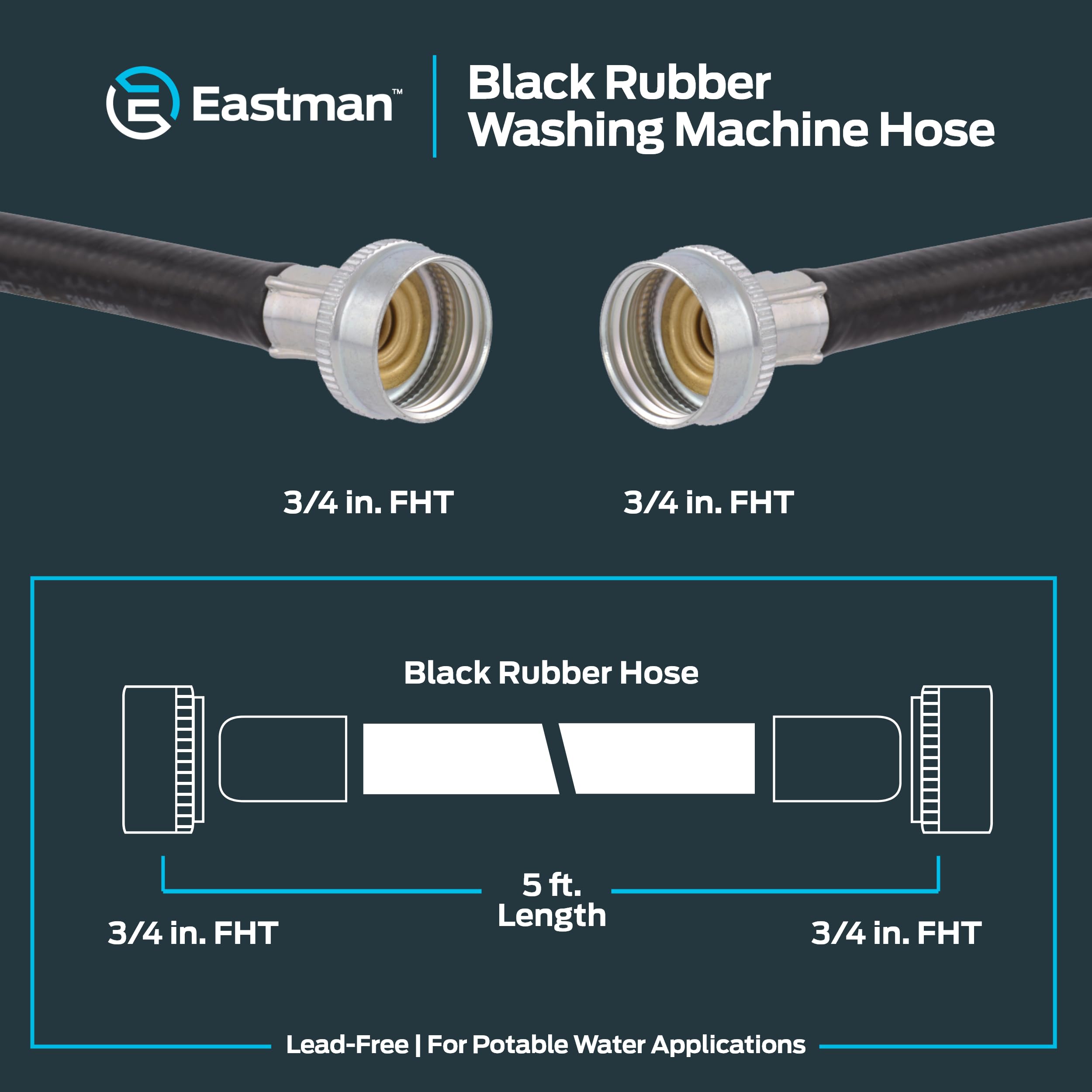UNIVERSAL FLEXIBLE WASHING MACHINE CONNECTOR: The Eastman black rubber washing machine hose is the standard in supply lines. This 5 ft. flexible supply line is equipped with 3/4 in. FHT x 3/4 in. FHT connections