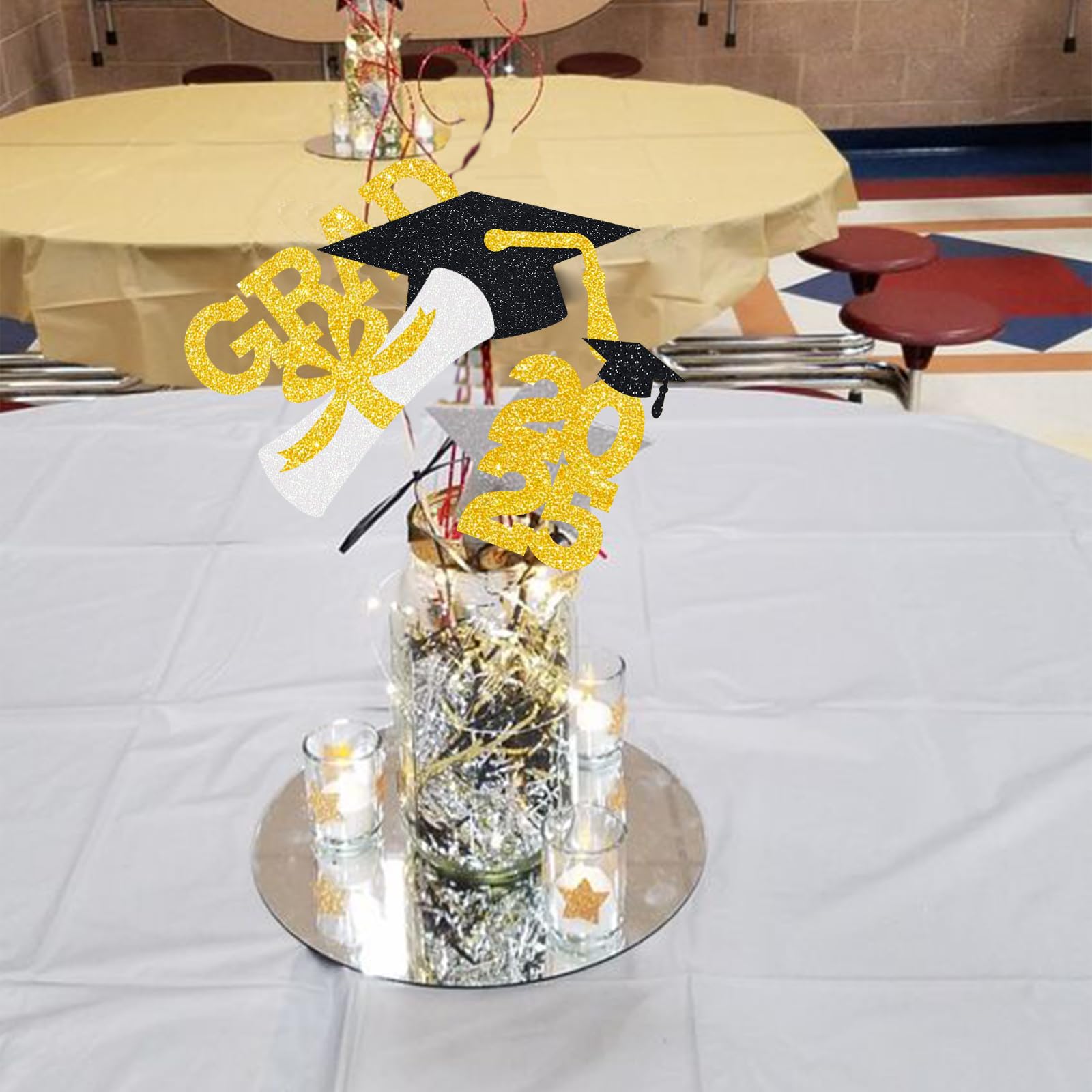 Dimensions: the gold graduation cap centerpiece measure 6.3 inches wide and 3.5 inches tall. The sturdy wooden 11.8 inches stick makes it easy to stick these glitter picks into flower arrangements, cakes, food platters and table topper