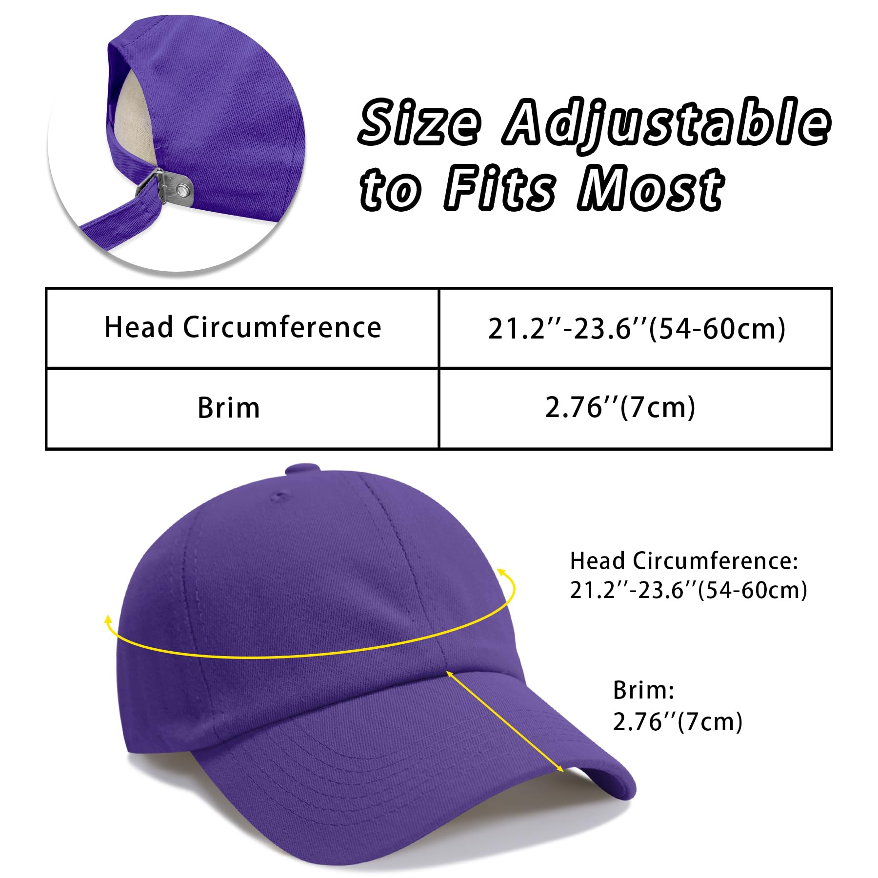 Description Low Profile UNCONSTRUCTED Plain baseball cap, classic and timeless style. The hat is comfortable for you to wear when doing activities Adjustable Size - One Size Fits Most: There is an adjustable button on the back of the baseball cap, which can be adjusted to a fitted size(21.2”-23.6”), the brim of the hat is 2.76”. Rear opening design fits women's low ponytail comfortably Adjustable metal button back closure, great fit for most head sizes ensure comfort at all times. The baseball cap is lightweight and has tightly stitching and can be used for more time The baseball cap is a stylish minimalist design, it is suitable for both men and women, comfortable and breathable, and easy to wear Wide Applicable Occasion: The unisex design makes it fits for men and women for everyday, sports, fishing, travel, outdoor activities, outing, etc