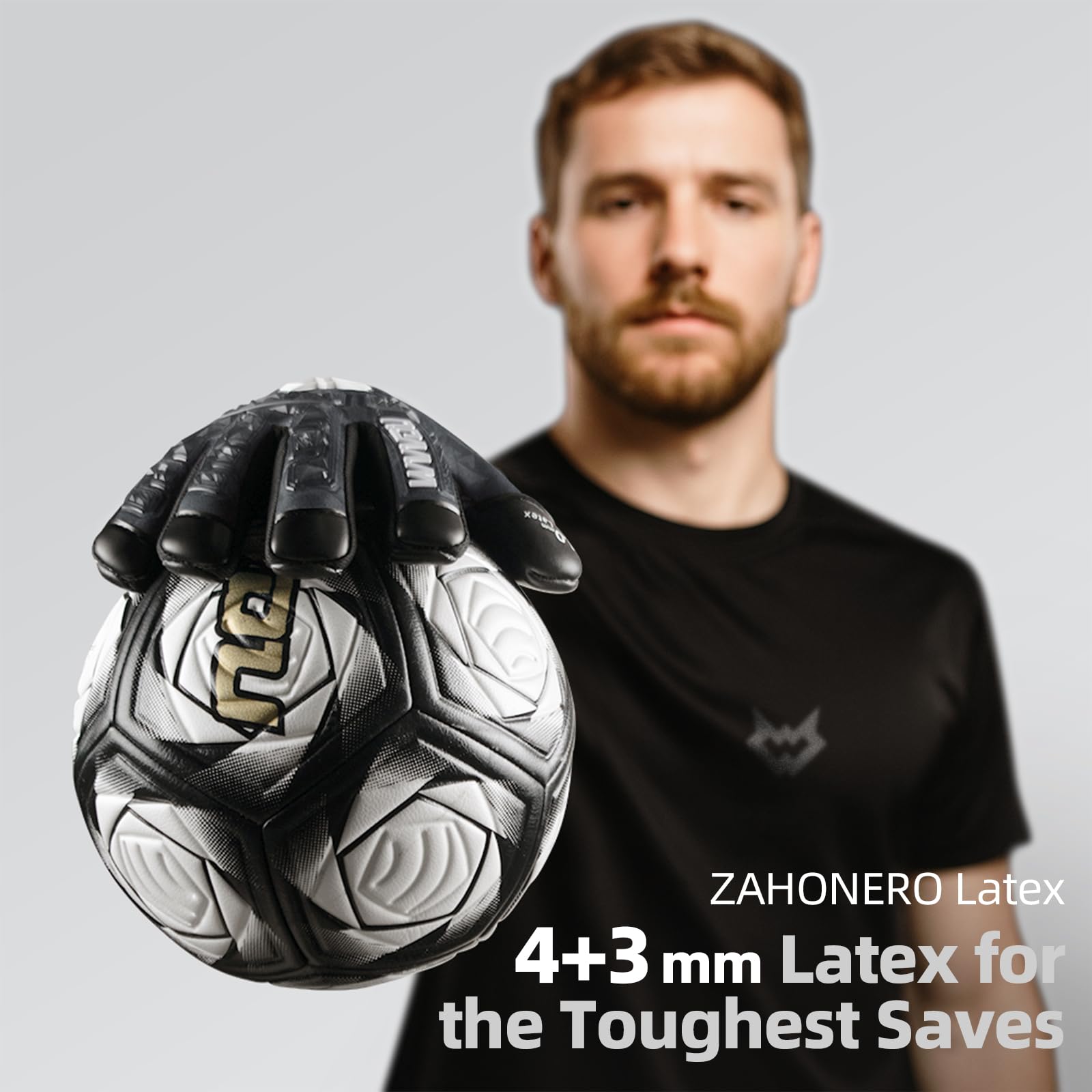 4+3MM STICKY LATEX: The goalie gloves are made of 4+3mm sticky latex, which is full of stickiness and strong wear resistance, creating incredible grip strength and ball control in any weather.