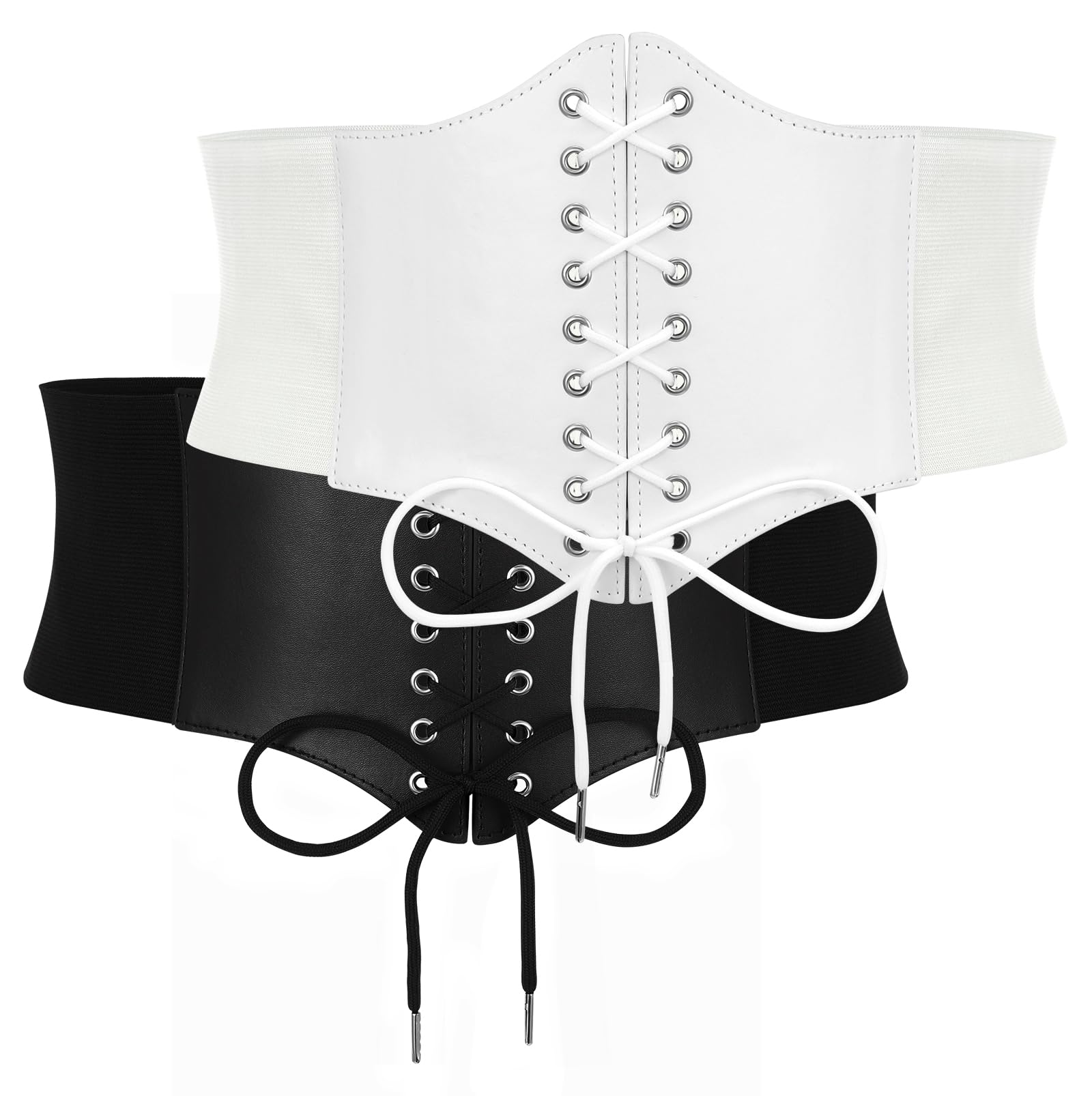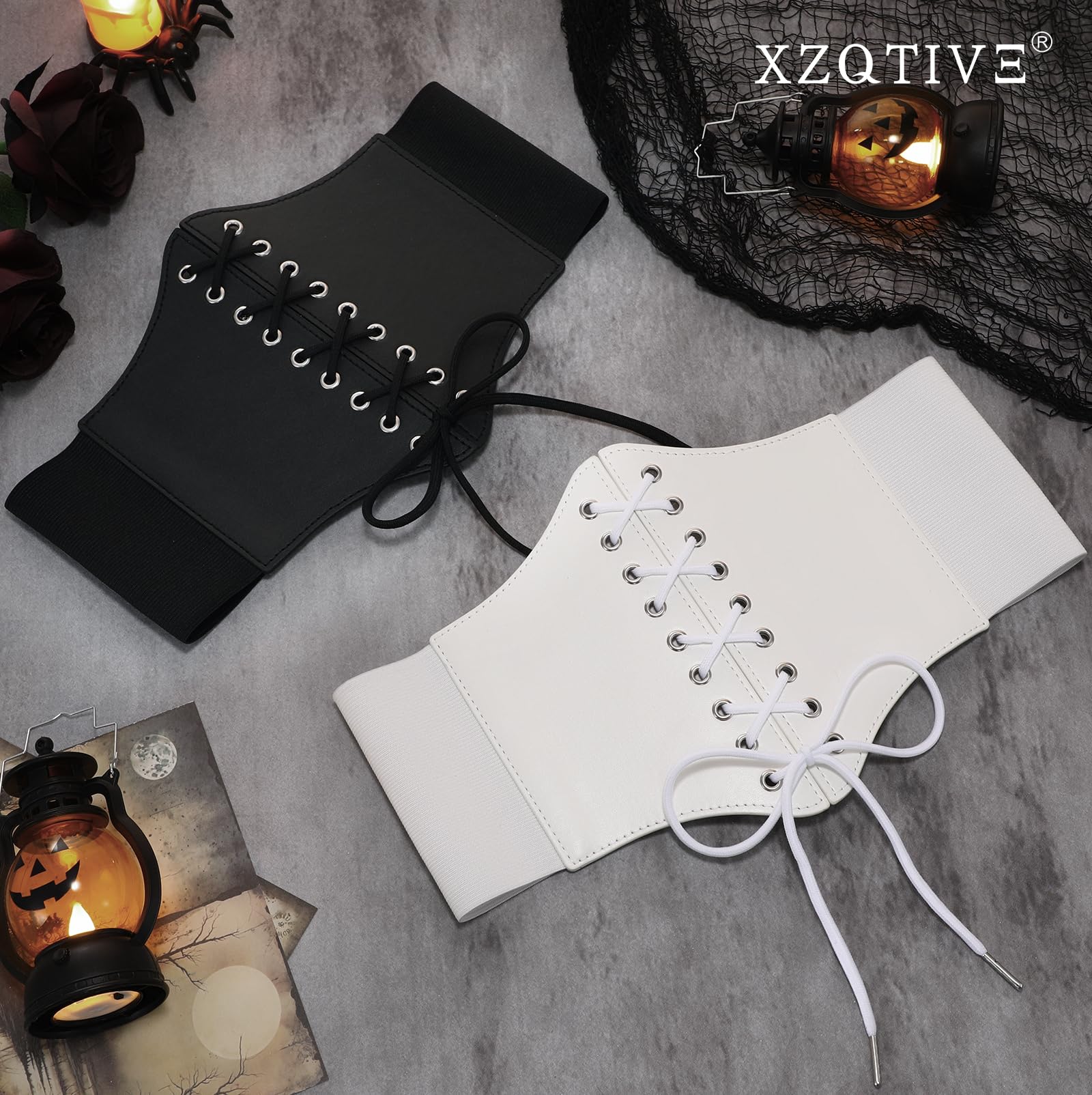 ➜ Black Corset Belt for Waist - Wide Costume cinching belt with tied corset leather on the front, elastic webbing band on the back, snap button closure to lock the belt,