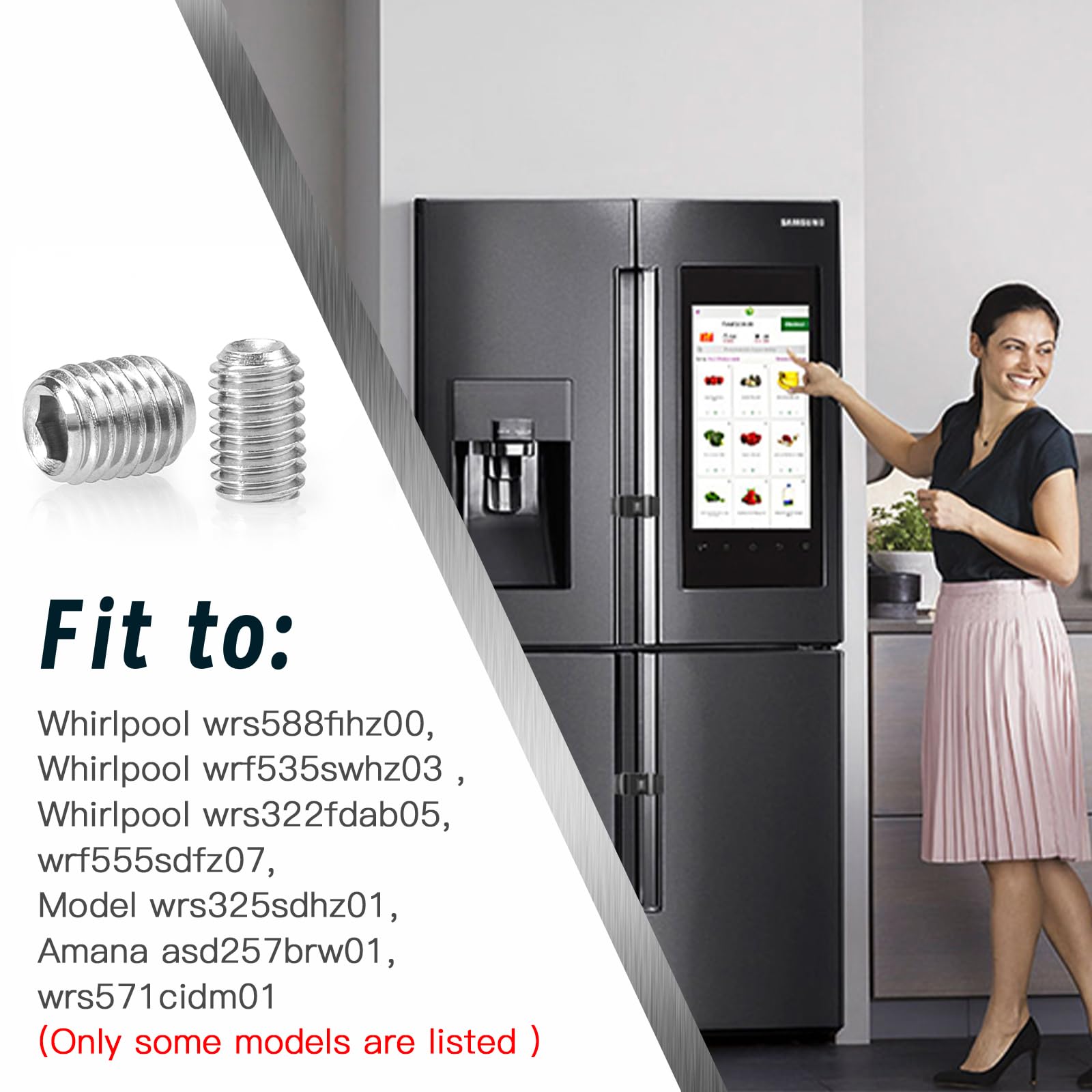 【Applies to】 : Genuine new set screw for refrigerator / freezer handle mount and more 【Please Note】: Whirlpool has assigned this part number to two different size screws. To assure you receive the correct fit for your handle, we will include both versions in this shipment. 【Replaces Part Number】: W11366418, AP6888139, WPW10010140, W10664010, W10010140, 4929325, PS12723933, W10114271, W10223573 【Fit】: Whirlpool wrs588fihz00, Whirlpool wrf535swhz03 , Whirlpool wrs322fdab05, wrf555sdfz07, Model wrs325sdhz01, Amana asd257brw01, wrs571cidm01 (Only some models are listed )