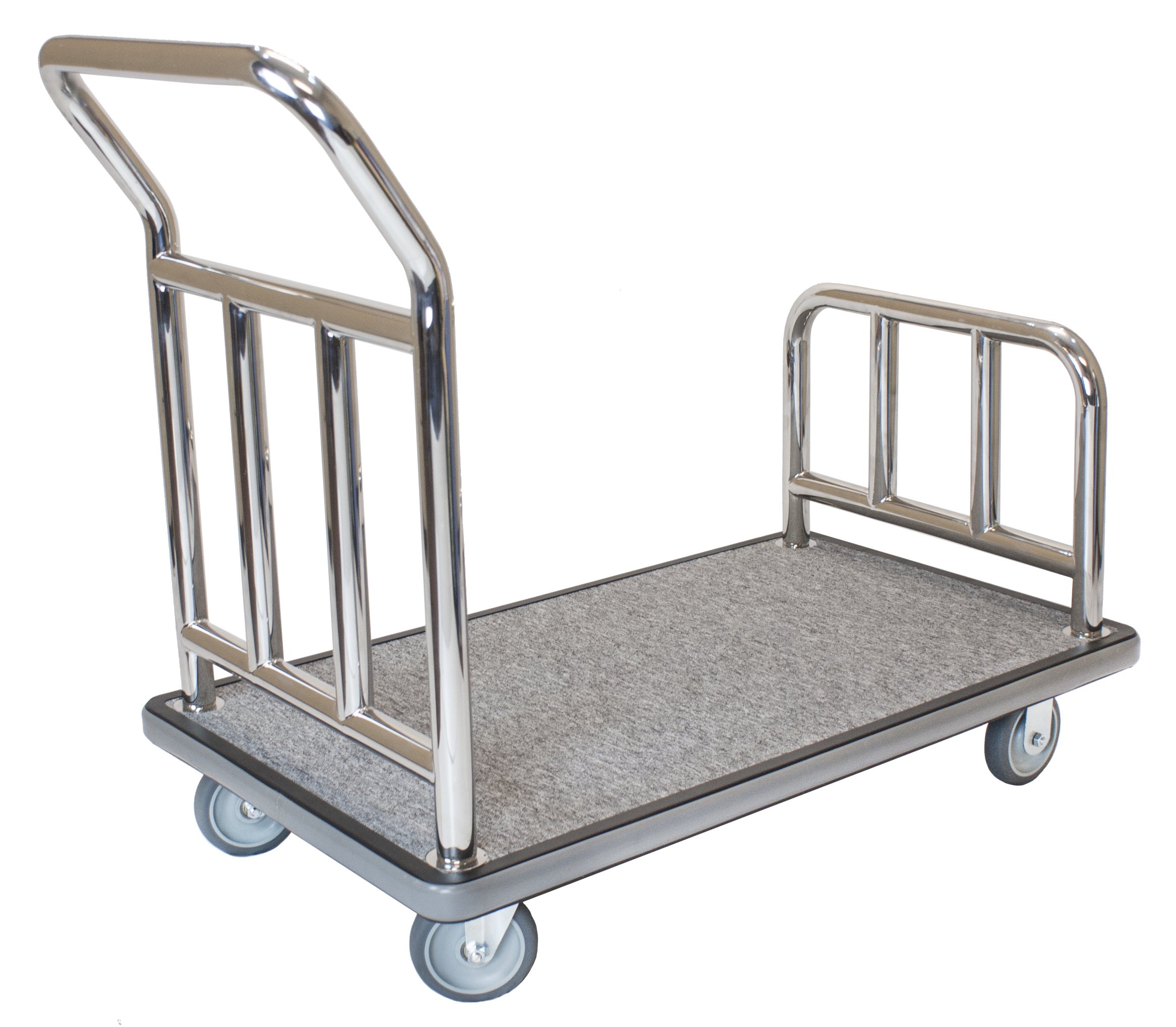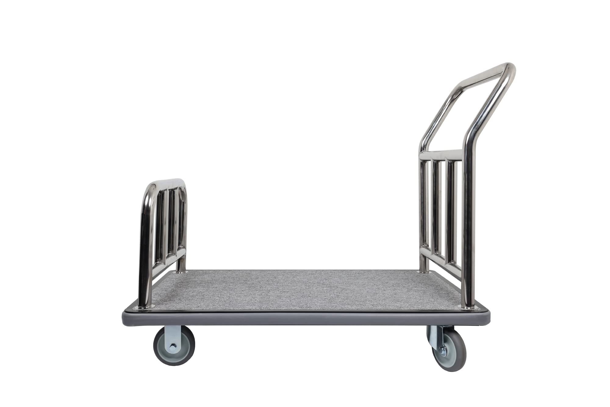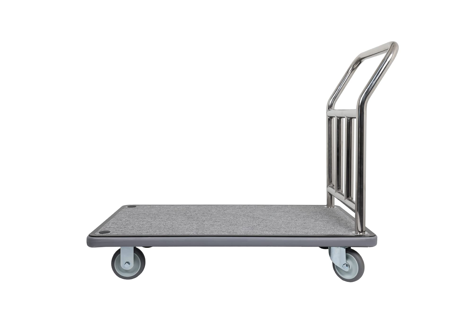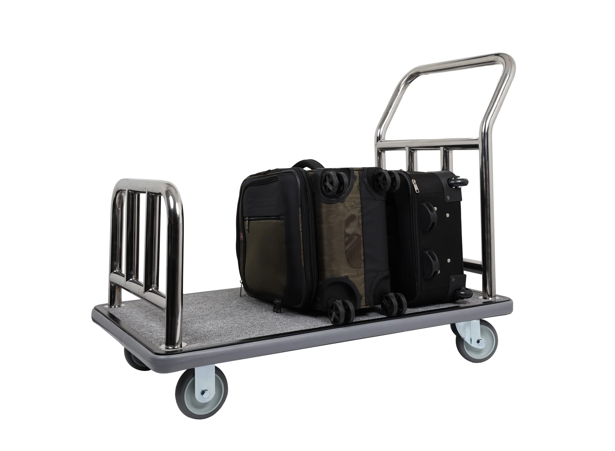 VERSATILE UTILITY CART FOR VARIOUS USES; This stainless steel transporter is ideal for hotels, resorts, condos, and conference centers. Designed for residential use as well, it easily moves luggage, groceries, and boxes with smooth 5” wheels and a carpet deck for added protection.