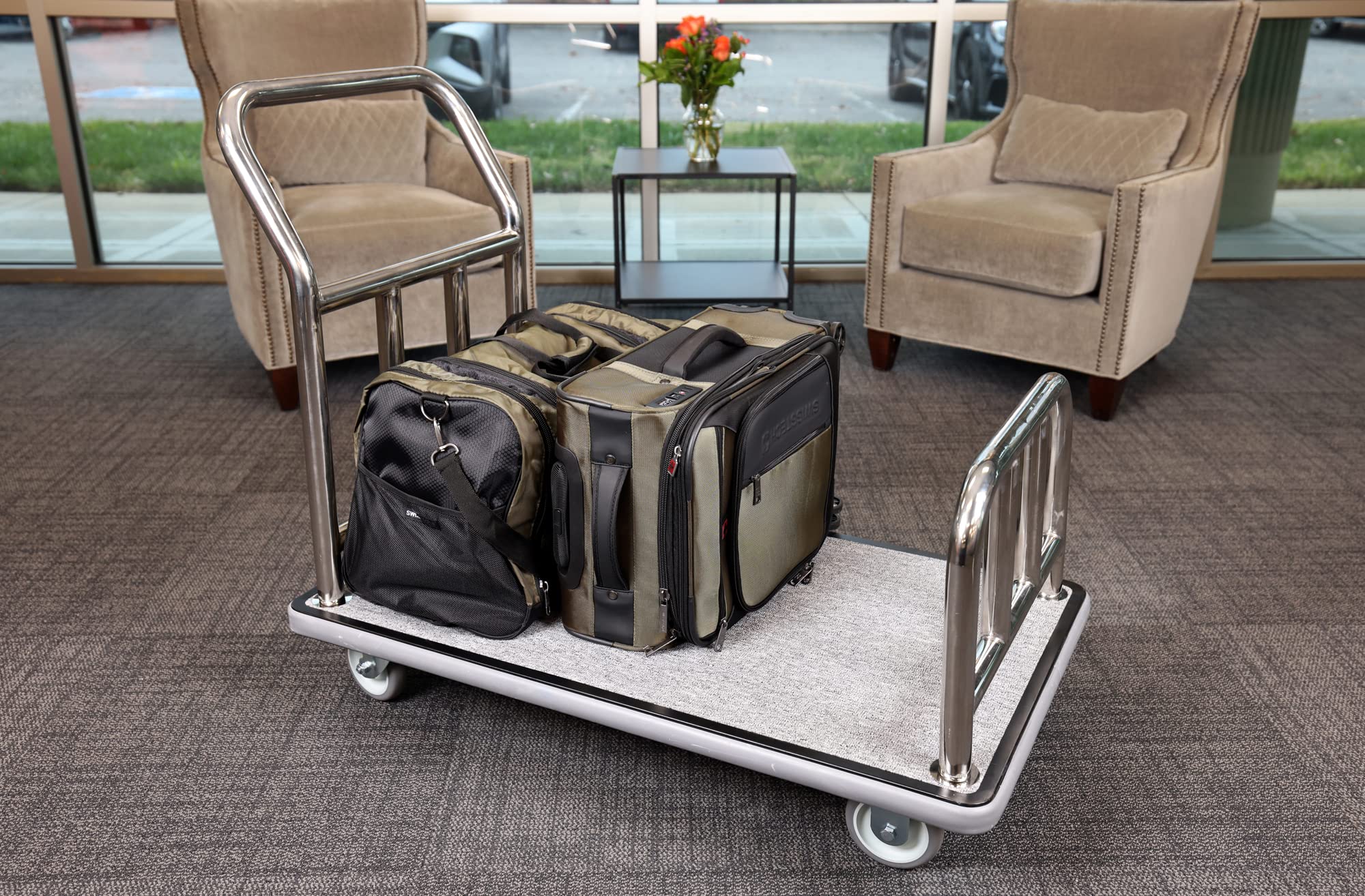 DURABLE & STURDY STAINLESS STEEL FRAME: Built with high-quality stainless steel, this utility cart features a reinforced design for extra stability. The roller frame sits inside the deck for enhanced support, making it a reliable option for frequent use in hotels, condos, and travel settings.